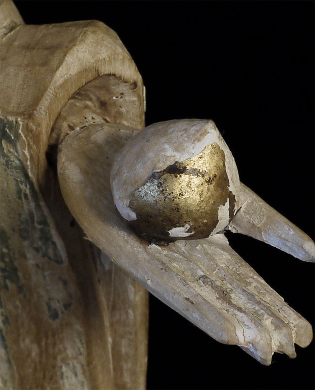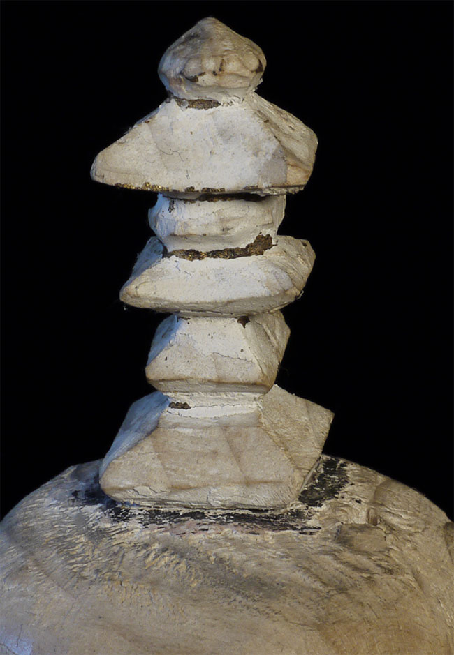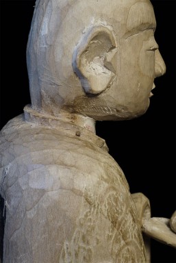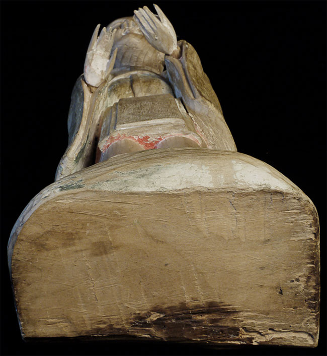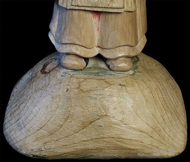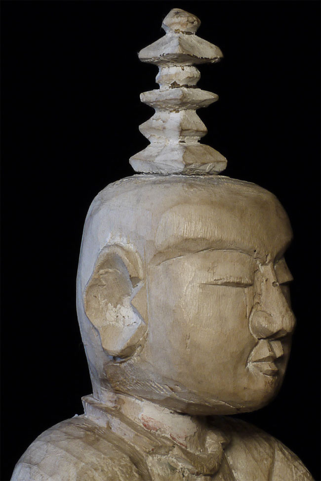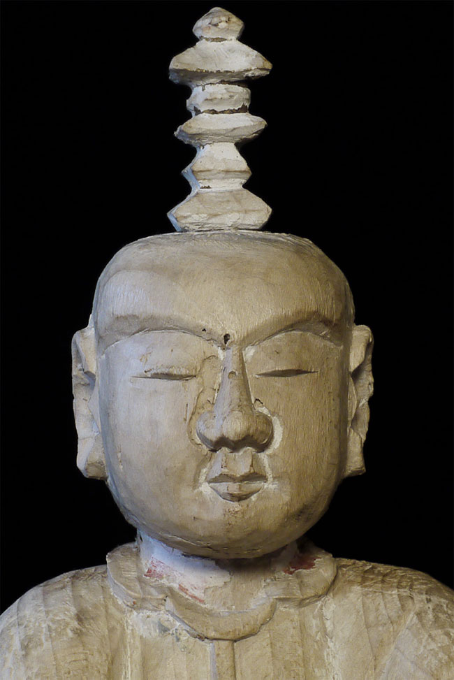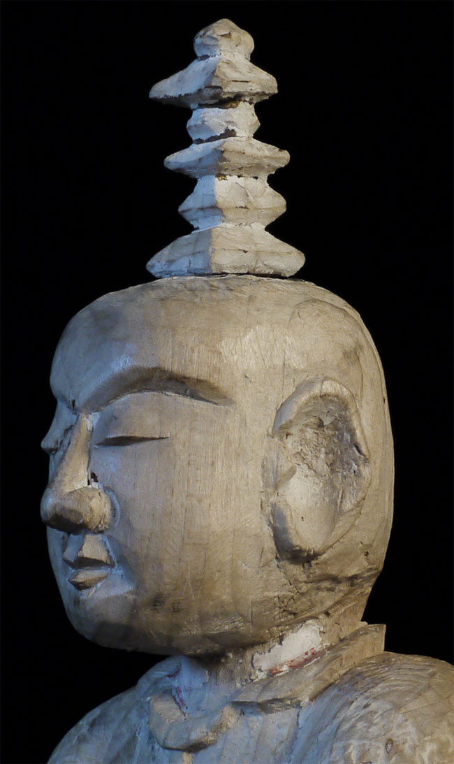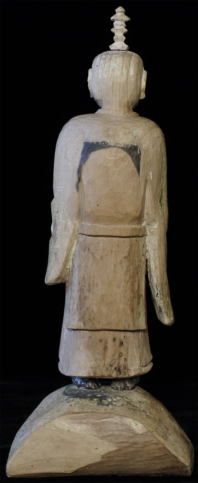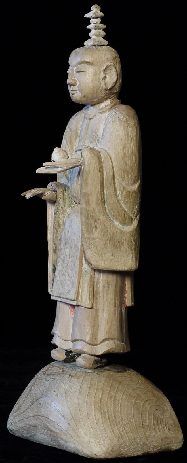 Manifestation of Buddha Dainichi for needed rain and protection against natural disaster. Mid-Edo, circa 1700s. Distinctive Gorintoo (Stupa) and holding wish filling jewel. Exquisitely carved. 15.75 inches tall. Rare! Hands and stupa/pagoda atop the head appear original and complete. Rare item.