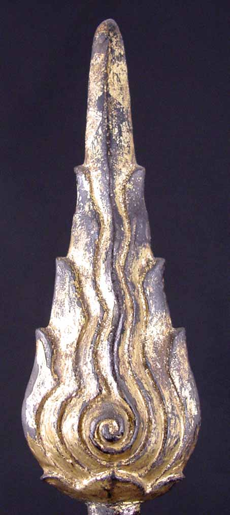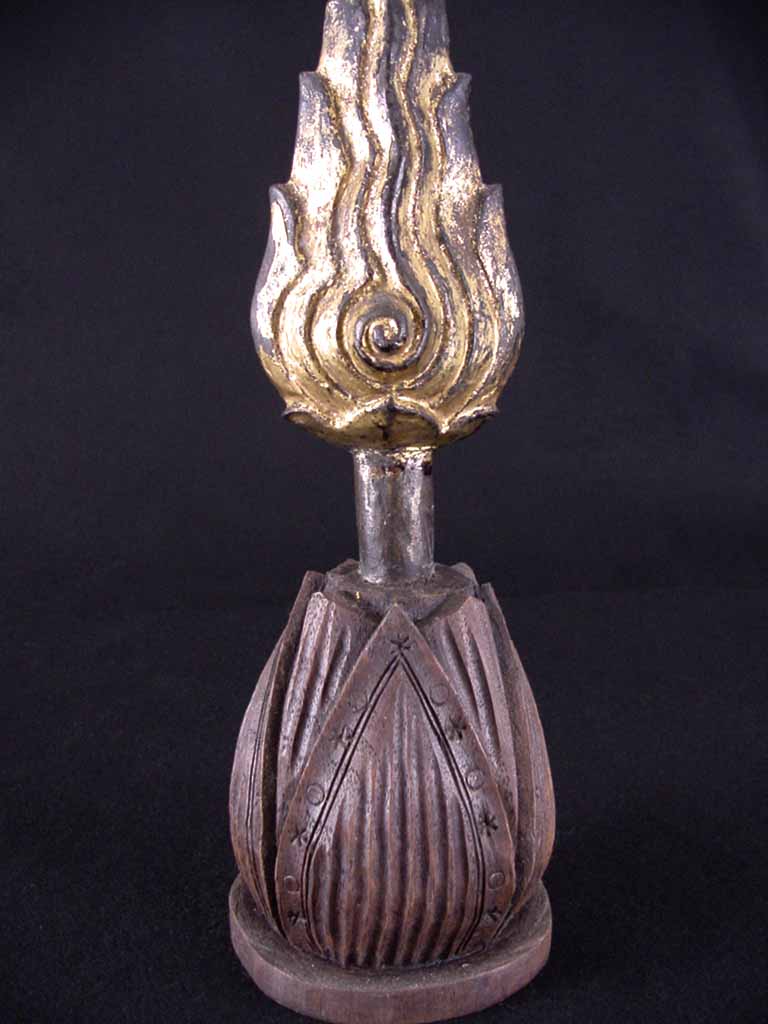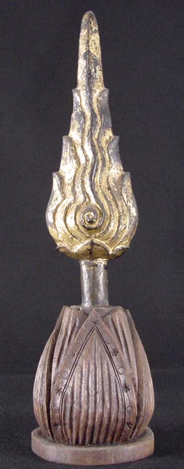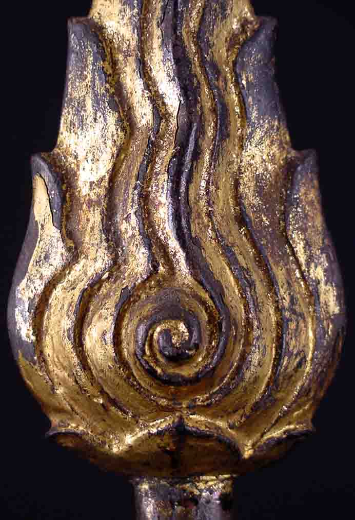 This is a massive bronze 18/19th century Buddha flame finial from the top of a huge Buddha head. The Buddha would have been larger than life size, and would have probably been the central Buddha in a temple. It is very well cast, and almost certainly came from a superb sculpture. I have had many of these over the years, but never one close to the size and quality of this one. It has most of it’s original gilding intact. I had a nicely balanced custom base made for it out of teak. It is sad, but these finials often seem to get separated from their Buddhas over time. They are separately cast on larger statues, and are not firmly mounted. The finial alone stands a full 8 and a half inches (not including the part hidden inside the wood base). The whole piece stands 12 and 1/3 inches high. This is a rare one.