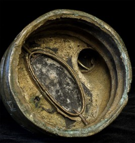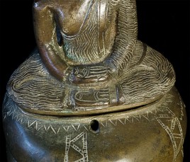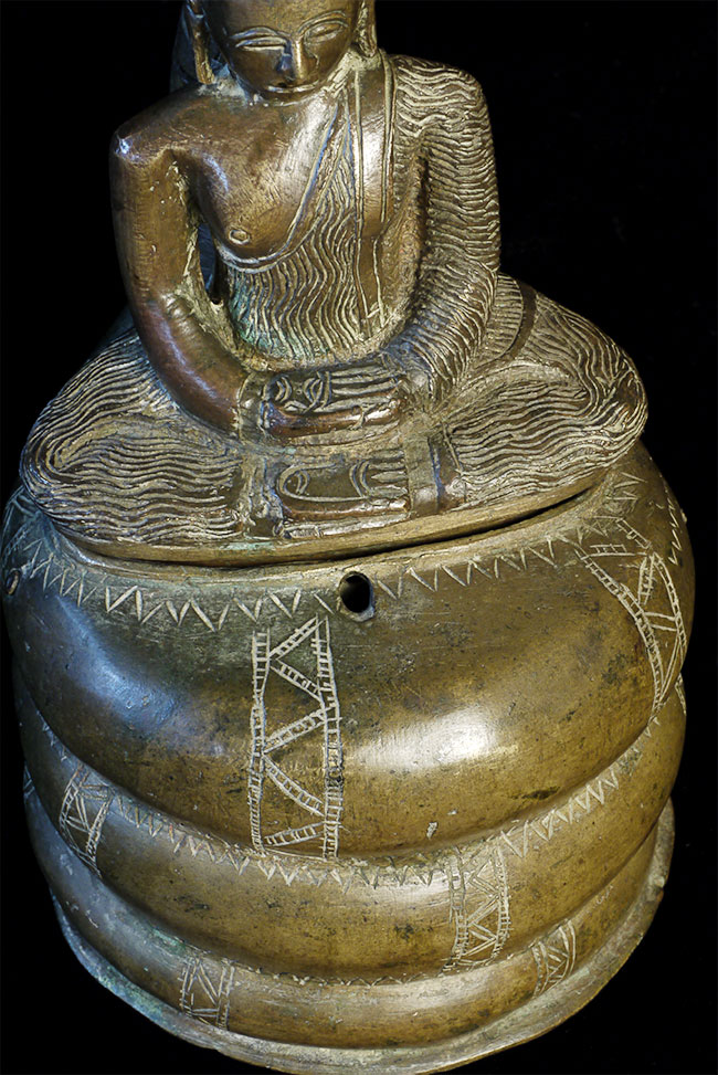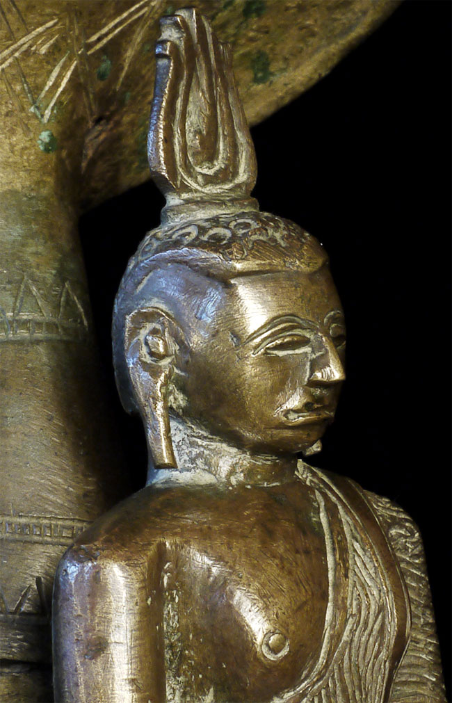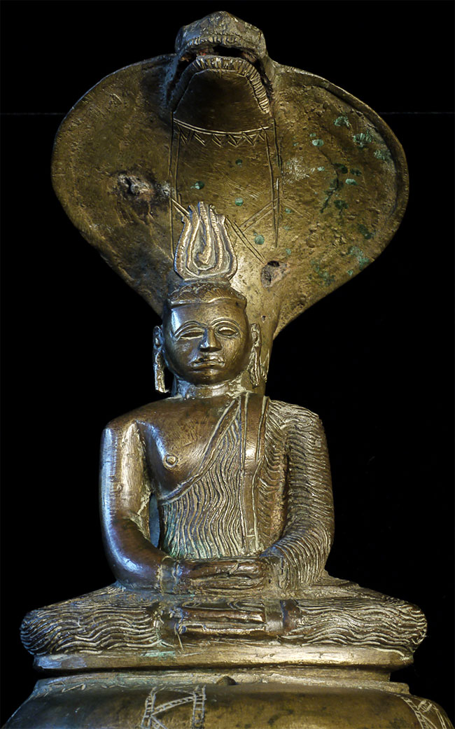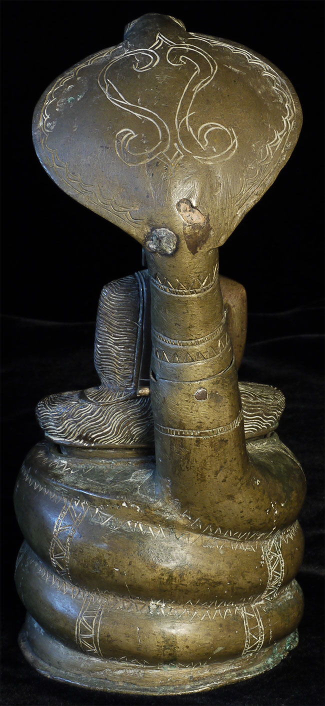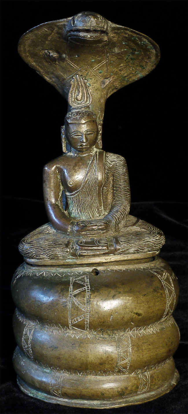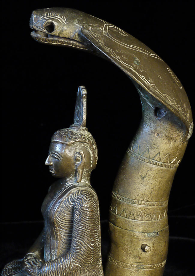 Solid-cast 18thC Sri Lankan Buddha protected by a Naga serpent. Stands 9.75 inches tall, to the nose of the Naga. Buddha is quite serious. Naga is highly expressive, and appears to originally had inlaid eyes. I've seen very few of this type over the years.