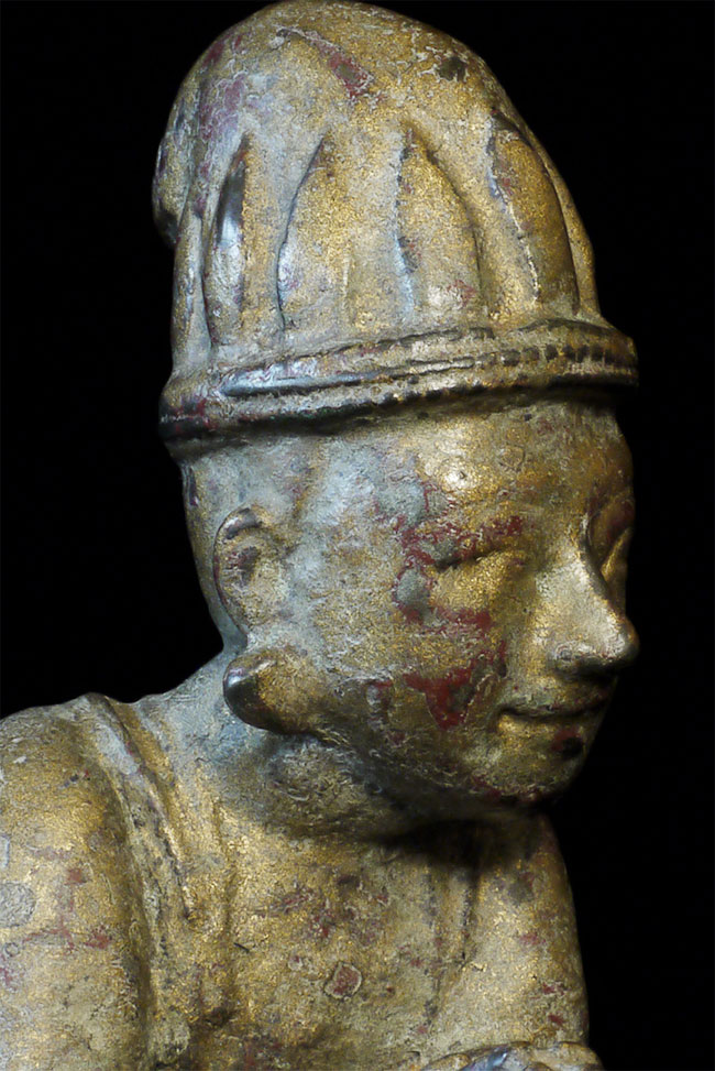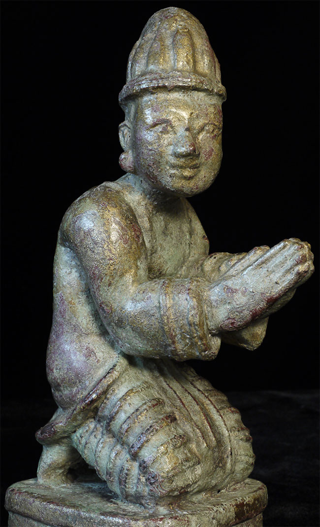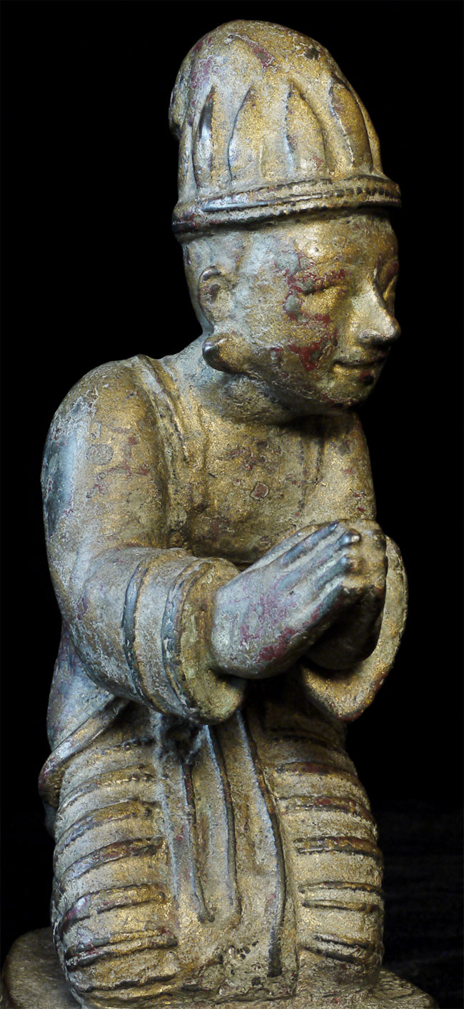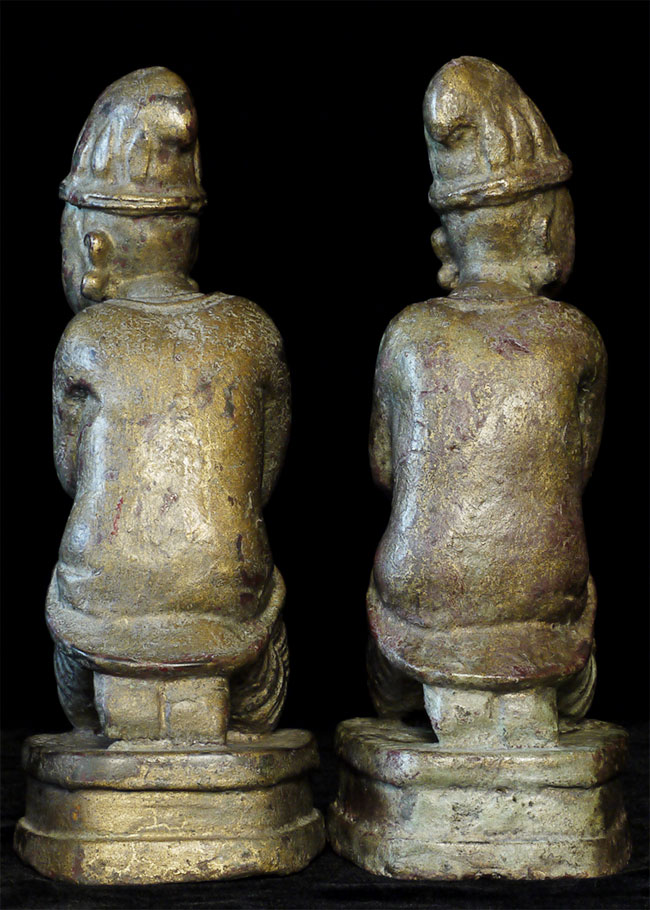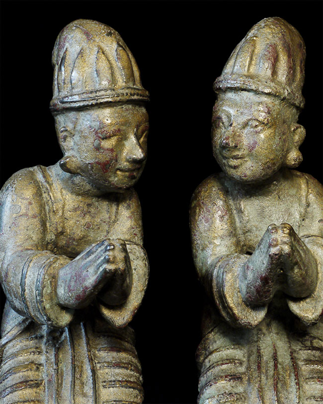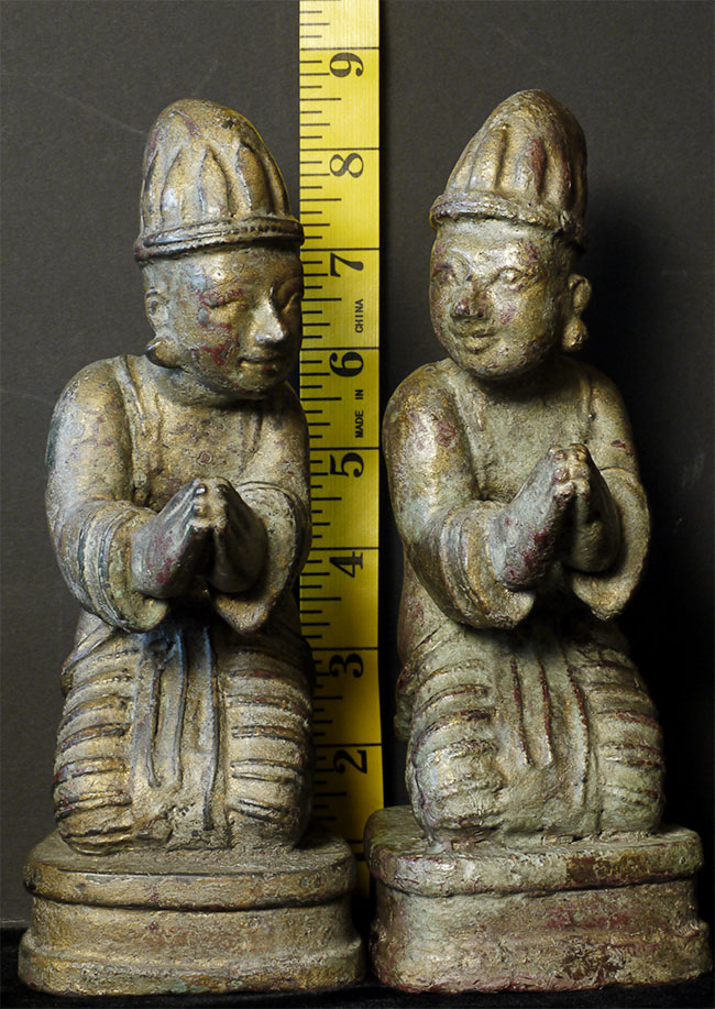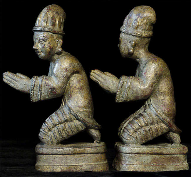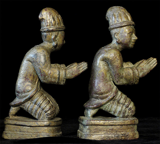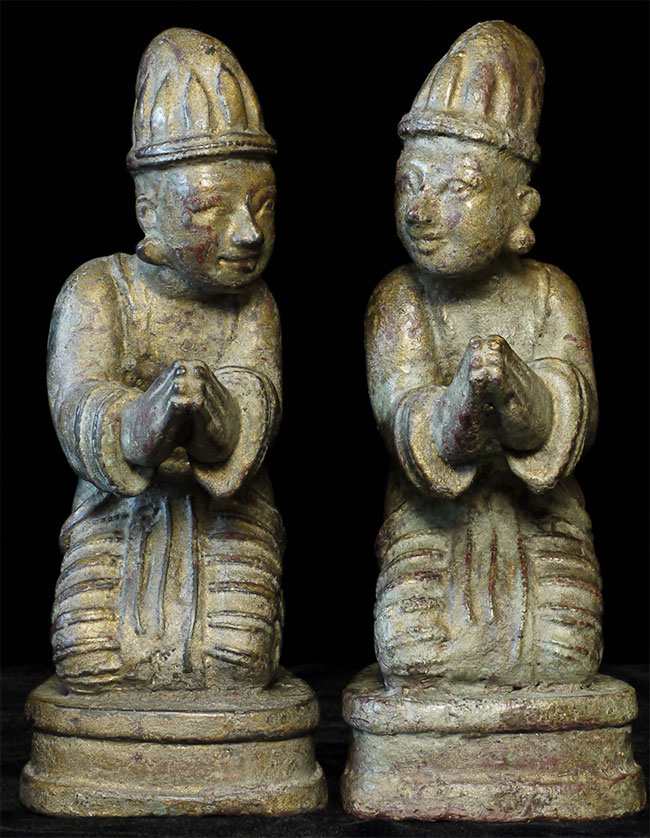 Delightful mirror pair of antique Mandalay Burmese Buddhist Devotees cast of bronze or other metal. Sit 8.5 inches tall and quite heavy.