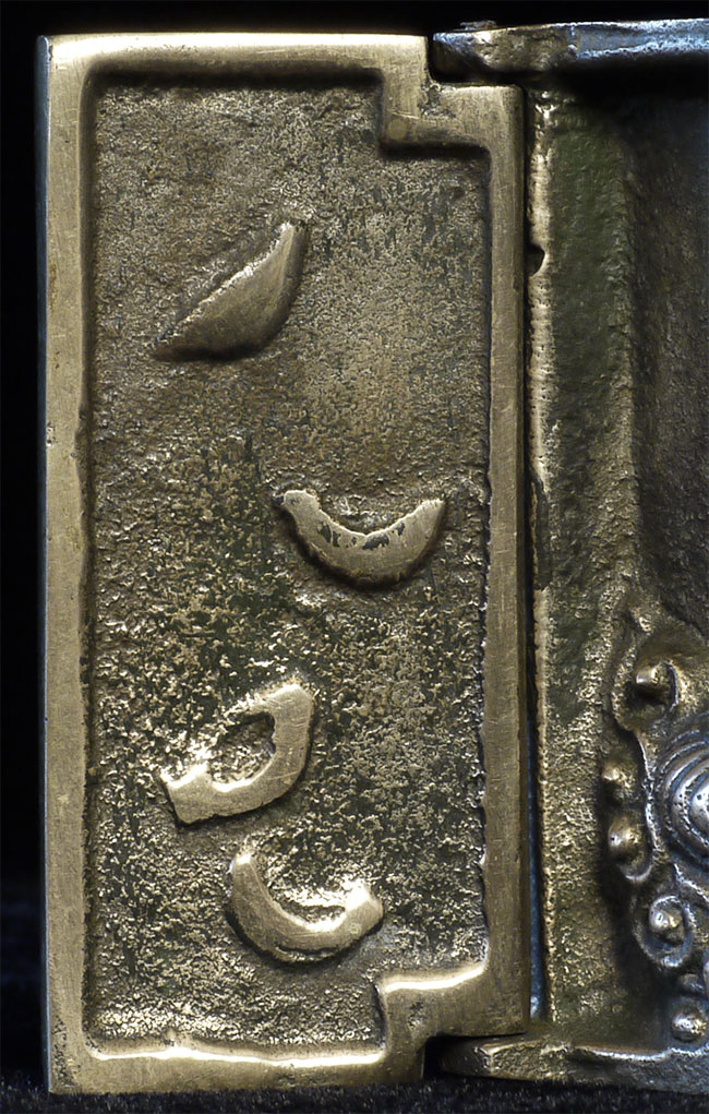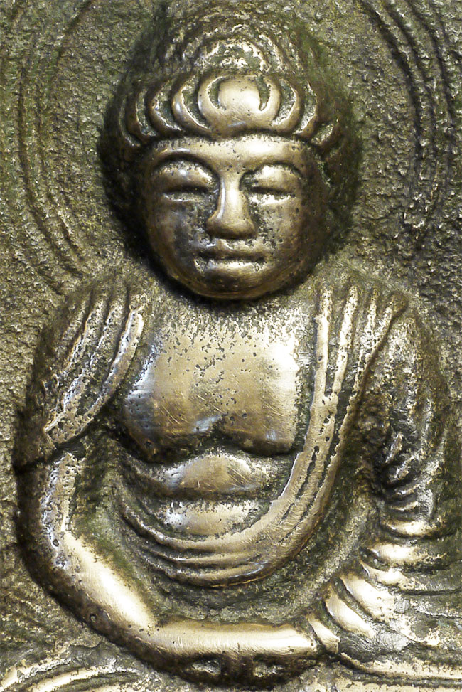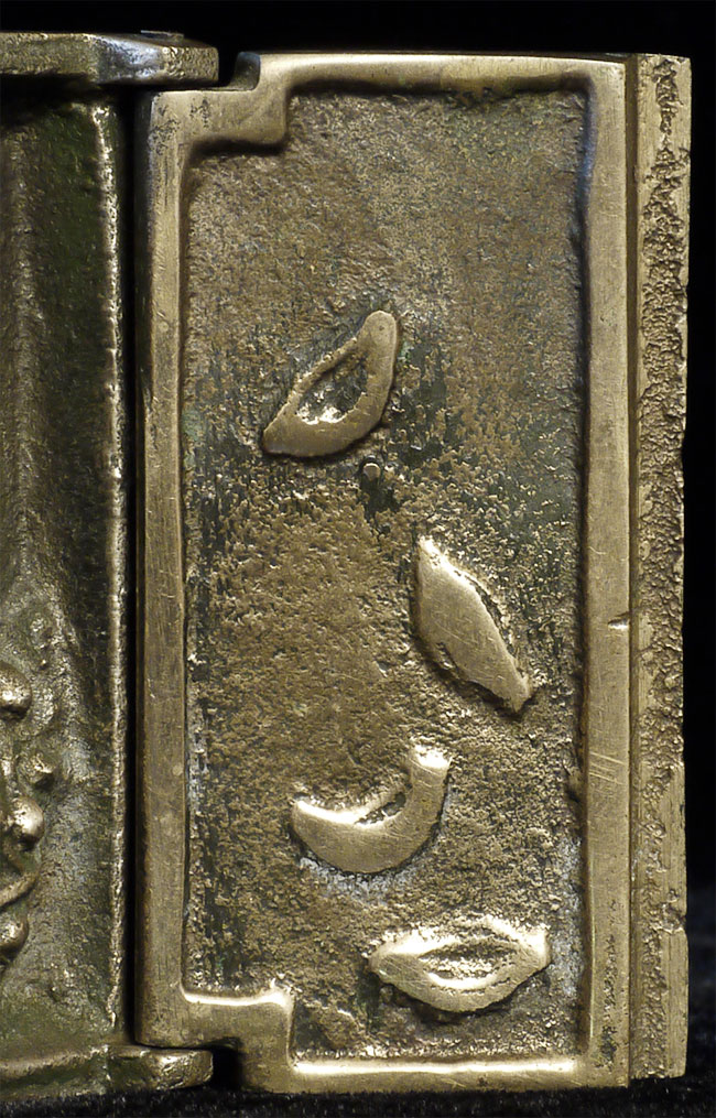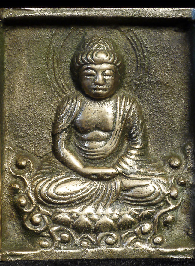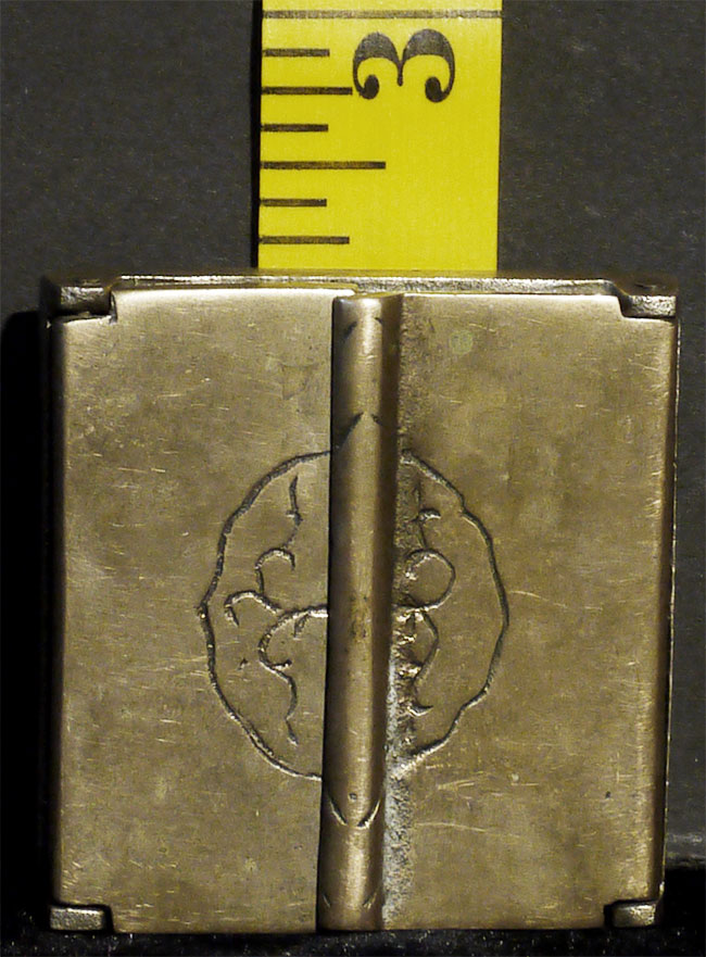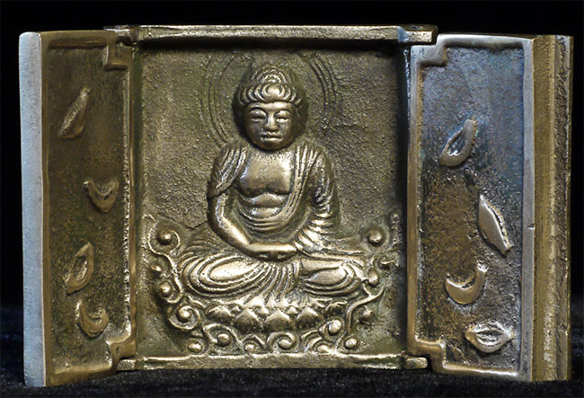 Uncommon thickly cast bronze/brass Japanese Meiji pocket shrine. 2 1/8 inches tall, 2 7/8 inches wide when open