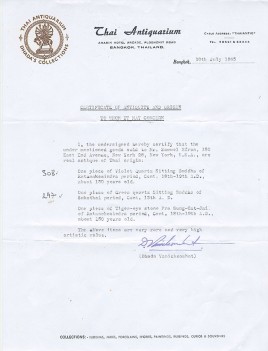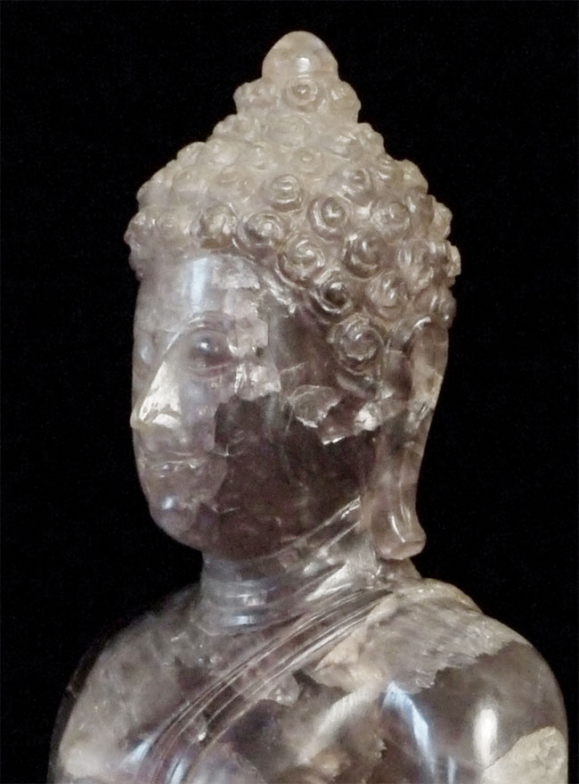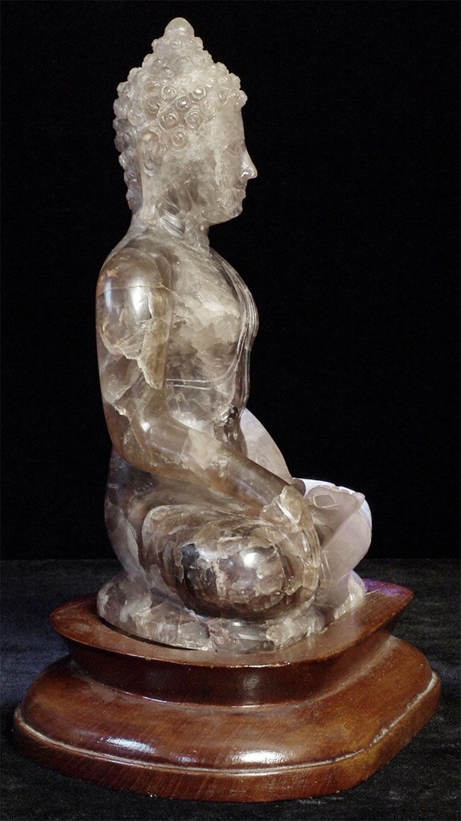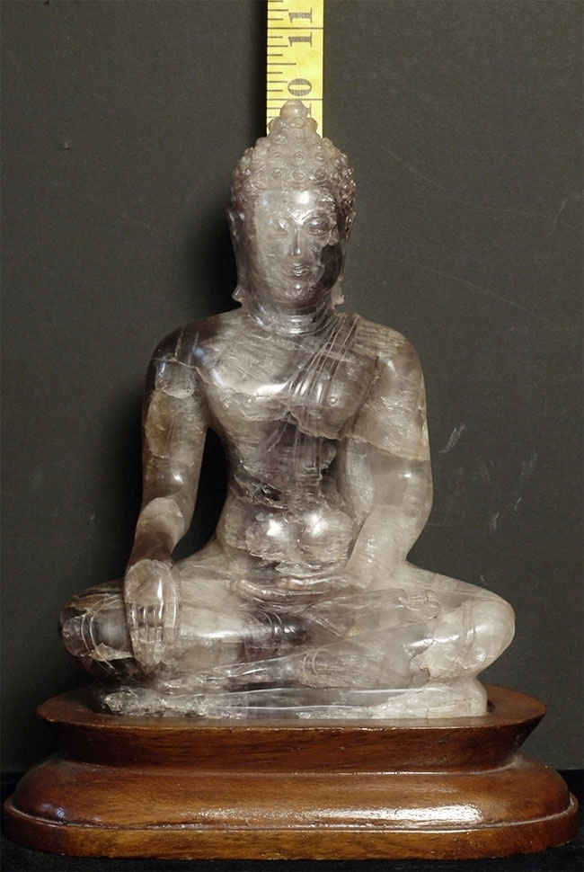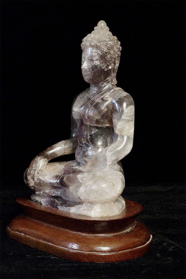 From the estate of a wealthy New Yorker, purchased in a high end shop in Bangkok in 1965. Original receipt dates it to 18/19thC, and to be carved out of violet quartz. The color appears to me as a mix of smoke and deep violet, and the material looks to be florite. Appears to be an authentic old piece. From the same collection as items 6118 and 6127 on my site. Large at 8 inches tall, on custom base the height is 9.25 inches.