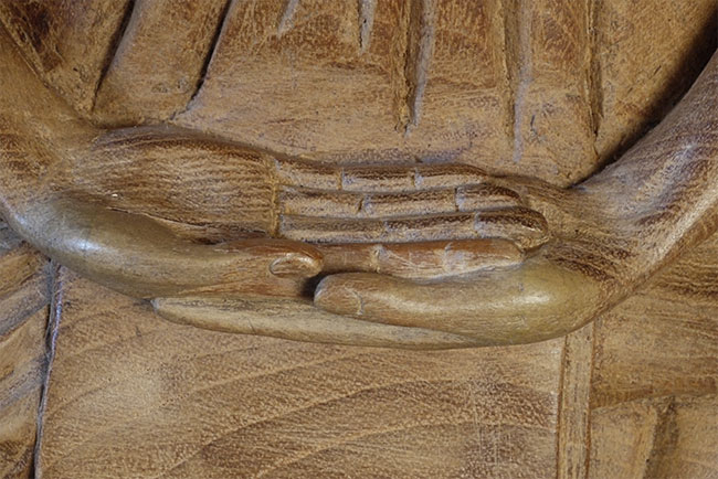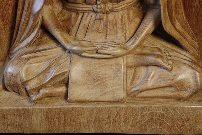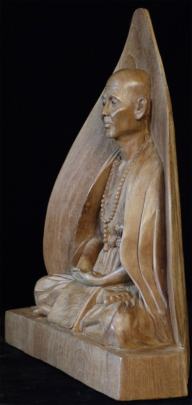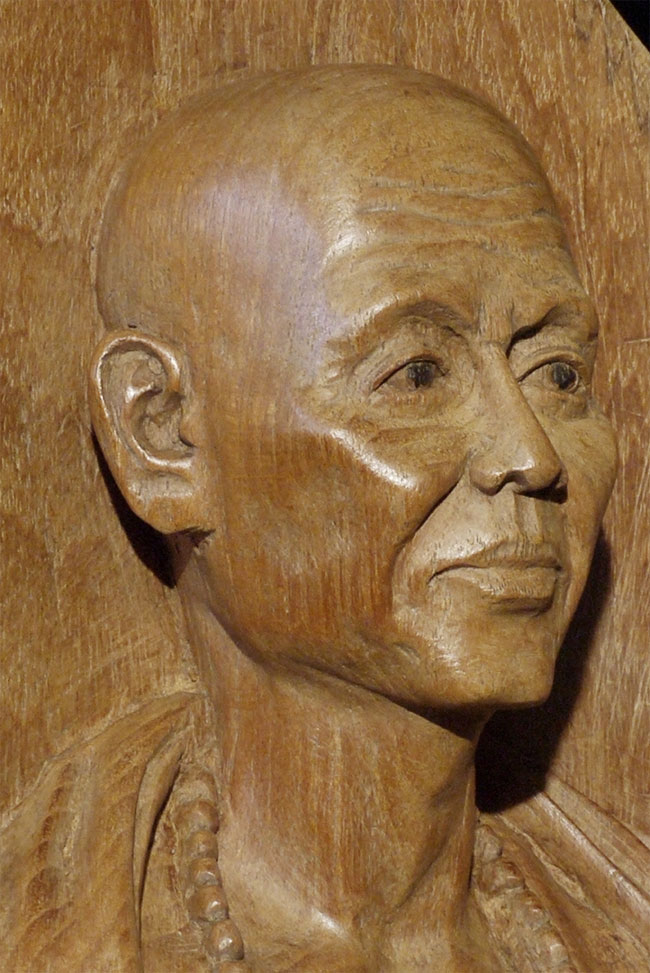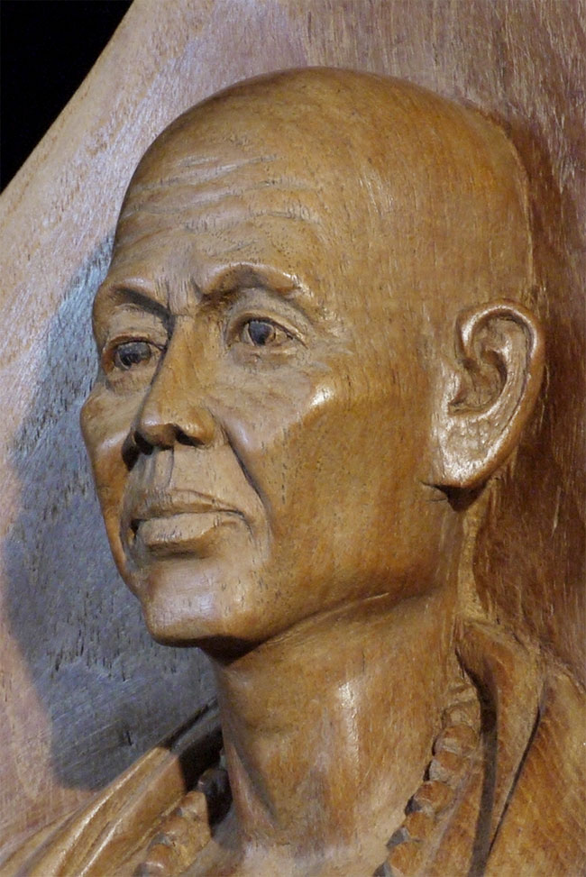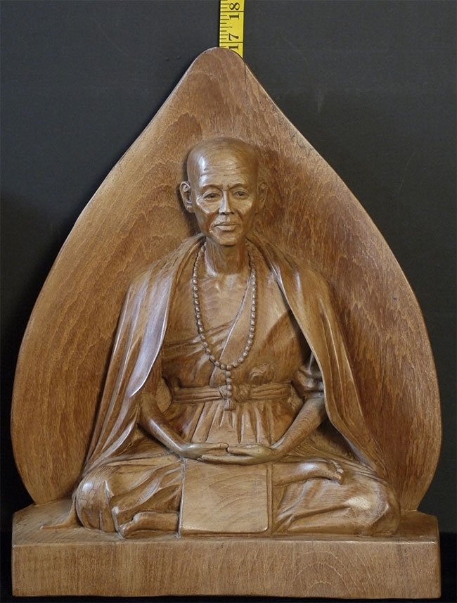 This is a portrait sculpture of a famous Northern Thai monk. This piece is sensitively and skillfully carved out of a single (massive) piece of teak. There is some minor age splitting. Some age, but certainly 20th C. It sits an impressive 16 7/8 inches tall, 13.5 inches wide, 6.25 inches deep. Purchased from a Thai gentleman who is a devotee of this monk. I've seen a few over the decades of different Thai monks, but this is one of the most finely carved, largest, and has the kindest sweetest face. It was carved by a master. Also, it is impossible to find teak logs this massive any more. Look at the dimensions and you will realize this was carved from one solid block. Reserve is far below what last owner paid in Thailand for this piece (not new when he got it) some time ago.