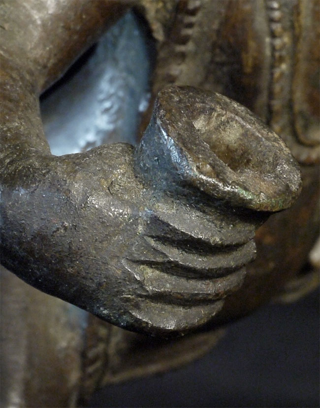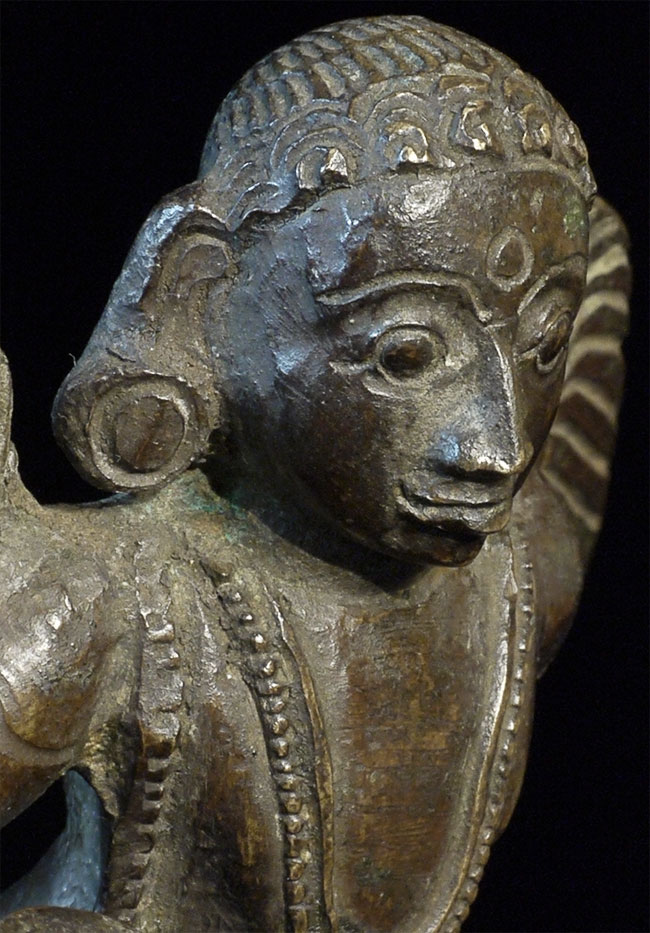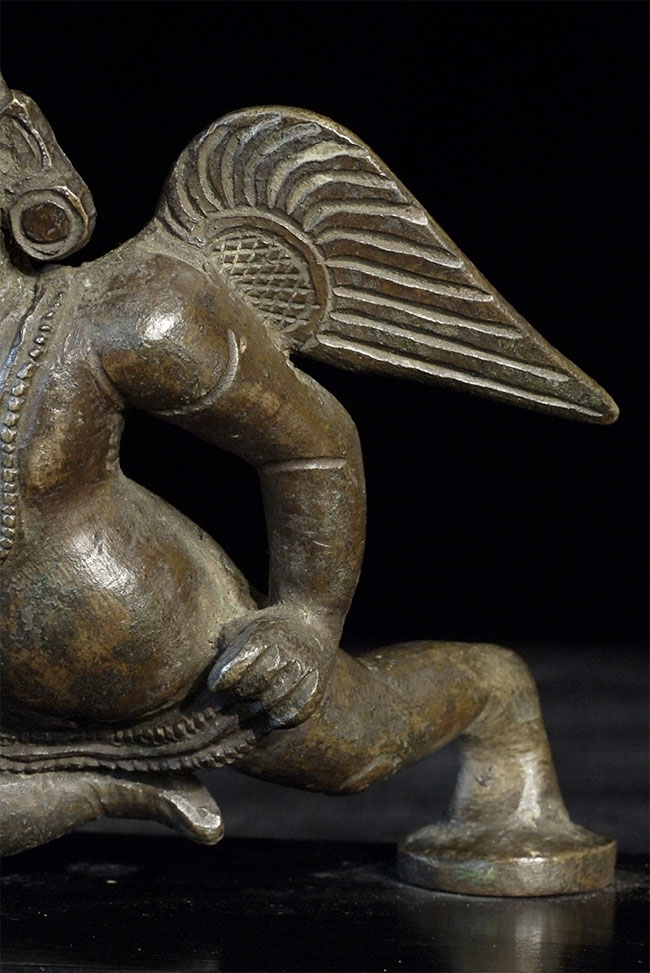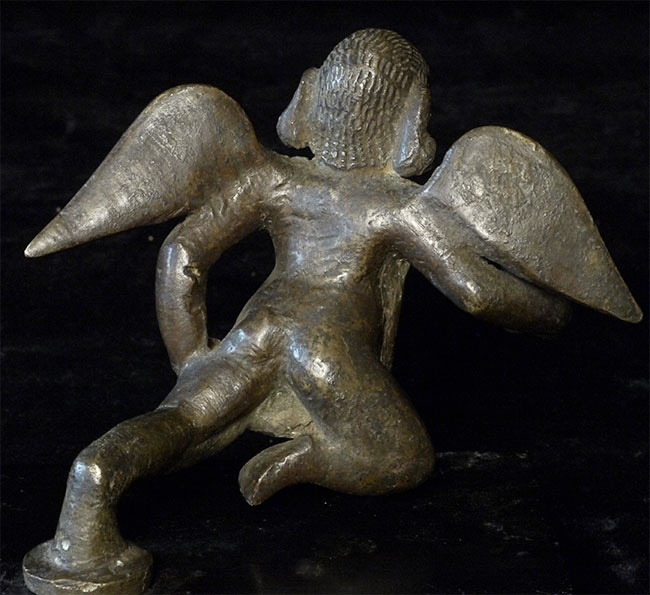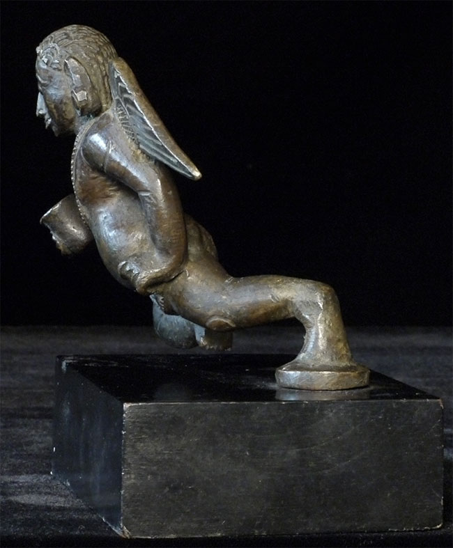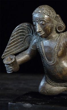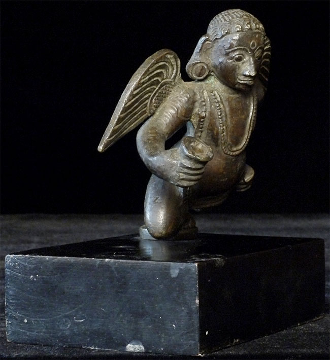 17/18thC Burmese bronze Angel or Garuda. Unusual type. 4 5/8 inches tall, bottom of attached base measures 3 x 4.5 inches