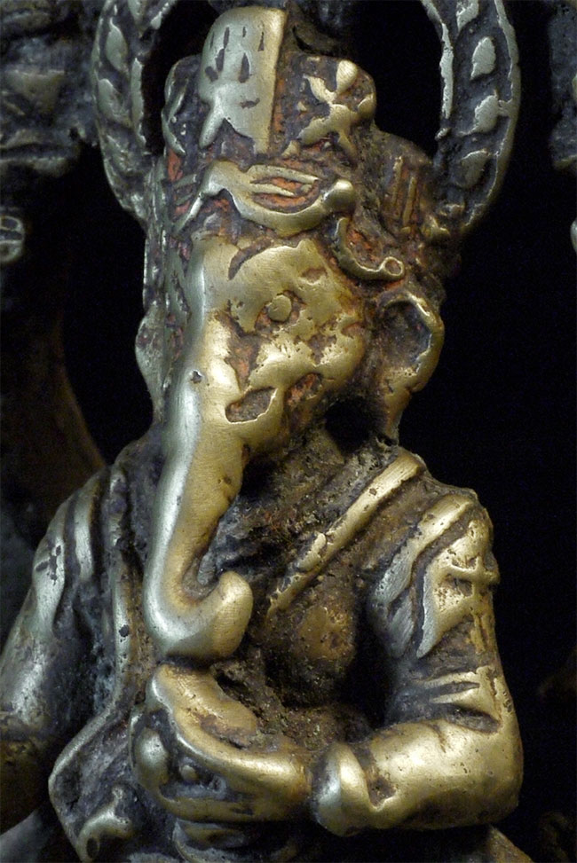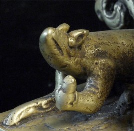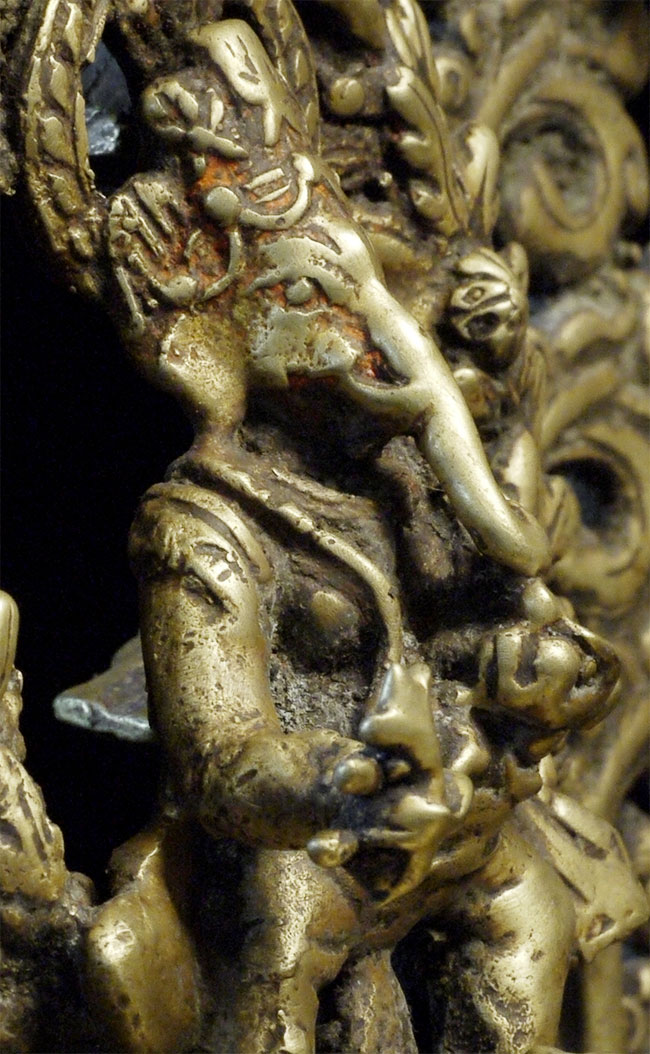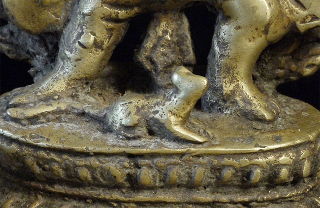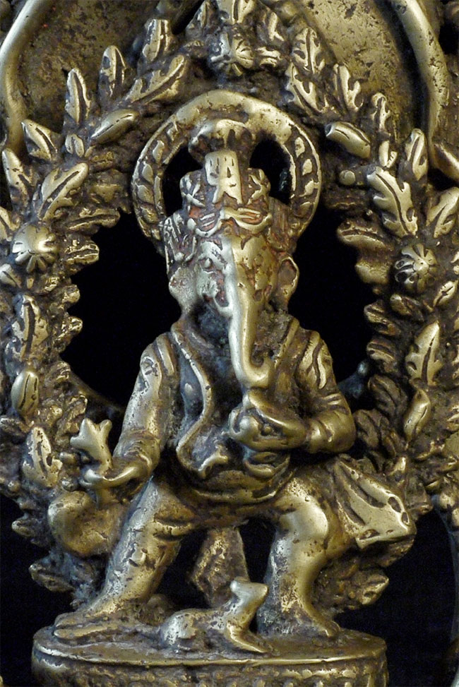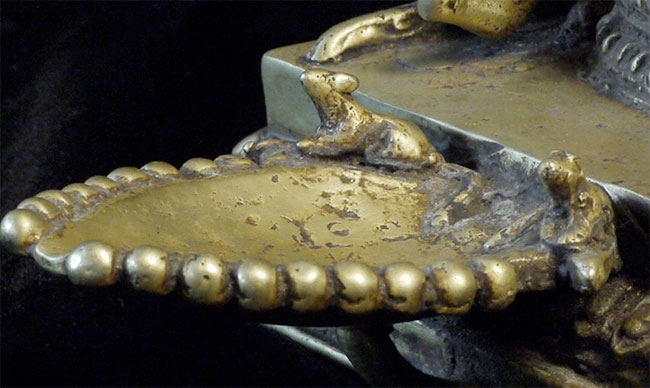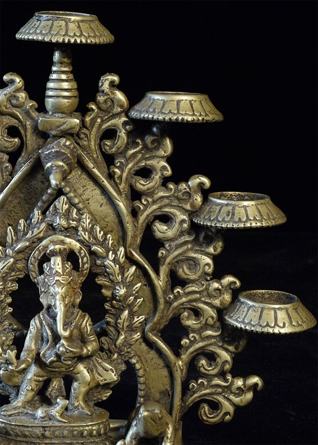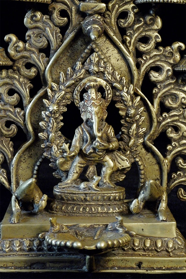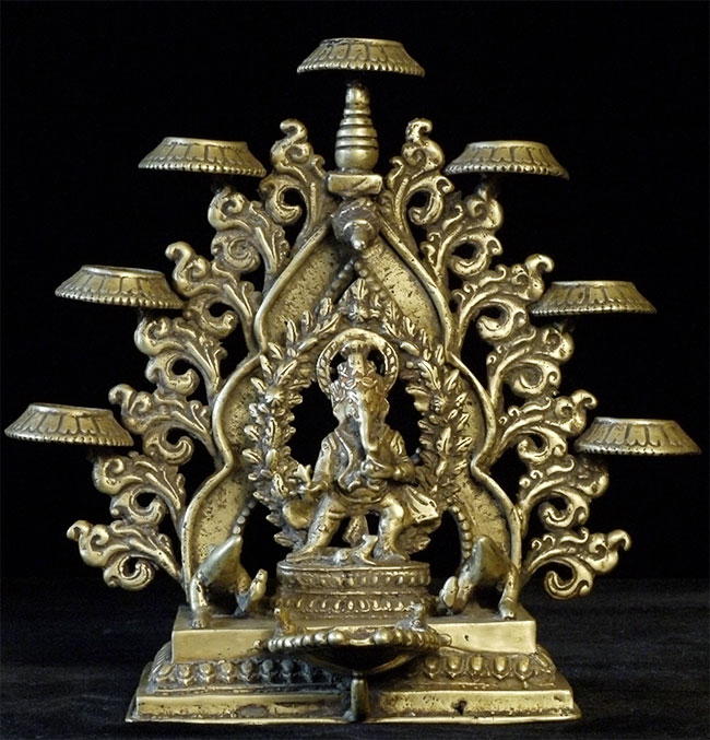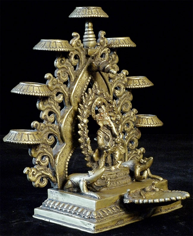 Vintage/old elaborate Nepalese oil lamp. Stands 7 5/8 inches tall, 8.5 inches at widest point, 6 inches at deepest point.