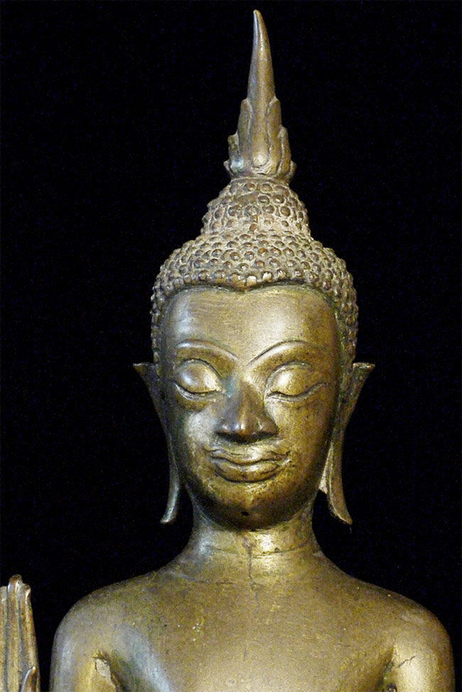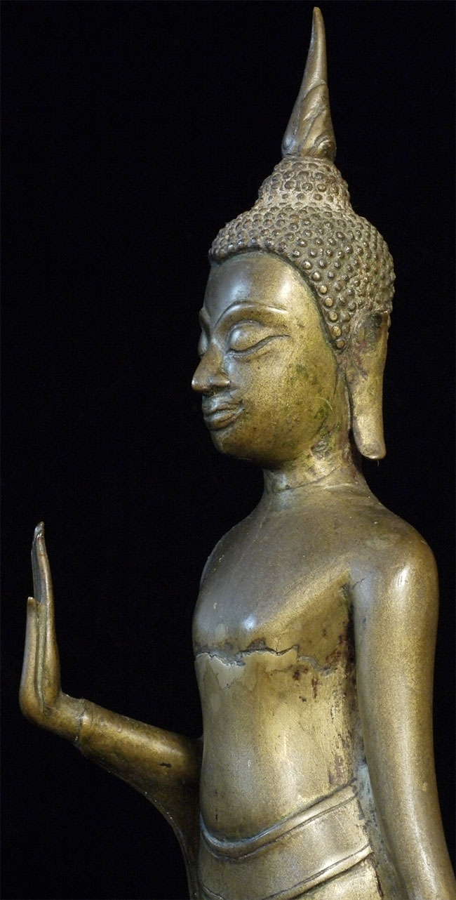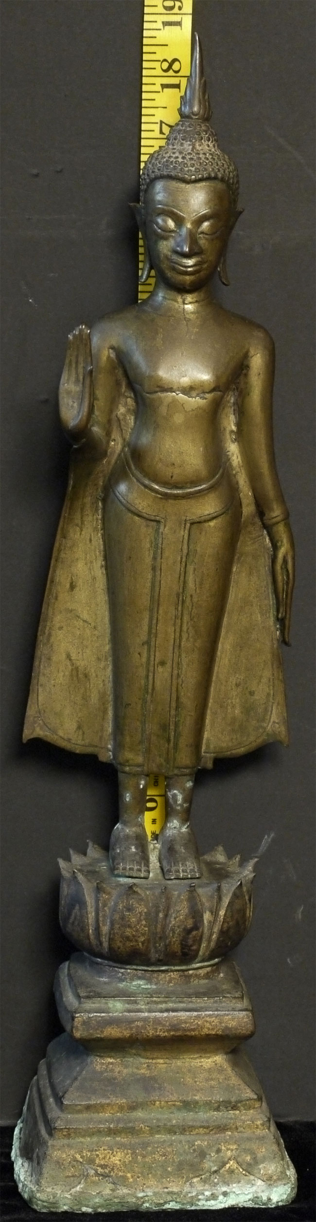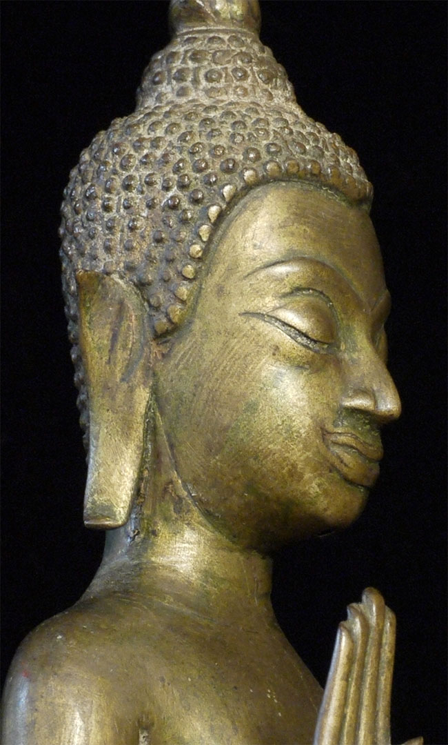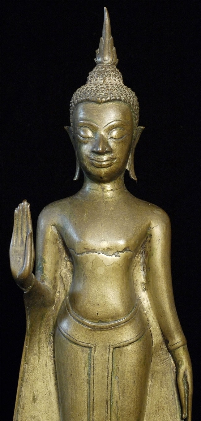 Deeply serene 16/17thC Thai Buddha. Very good quality. Condition as seen in photos. Quite large at 18.75 inches including the base. Bottom of base measures 4.25 x 4.25 inches. Stands well, though a little loosed where the Buddha connects to the base. Previous U.K. owner inherited this from his grandfather who was stationed in the far east of the British Empire in the 1920's. Flaw on front of chest is an original cast flaw which would have been covered with lacquer and gilding.