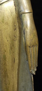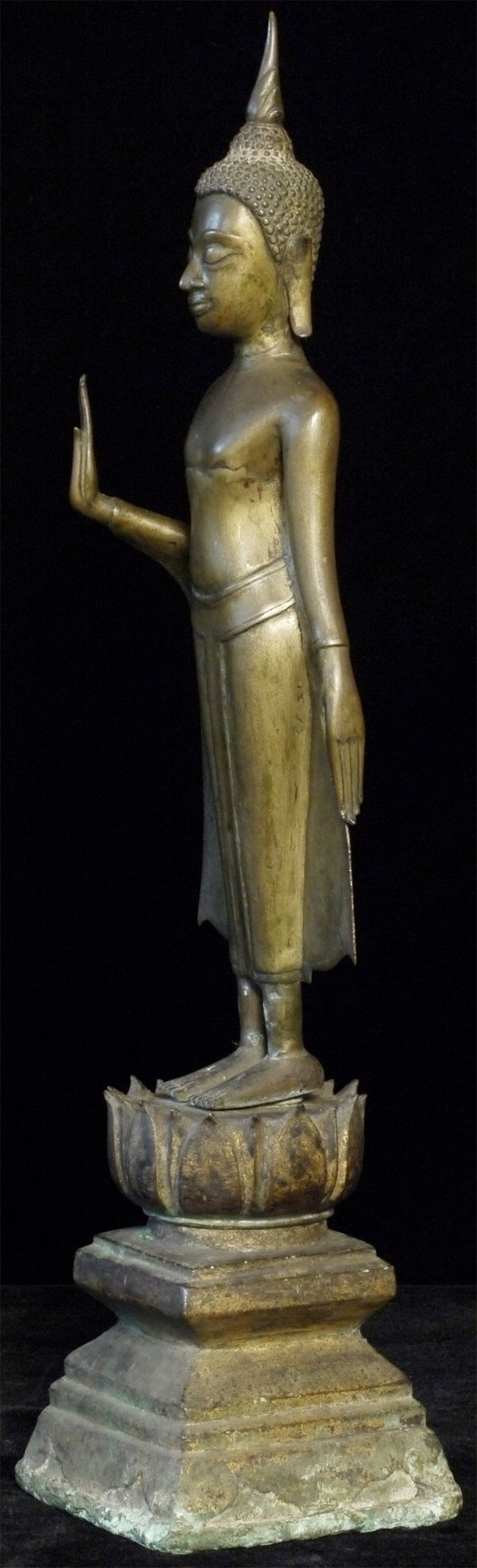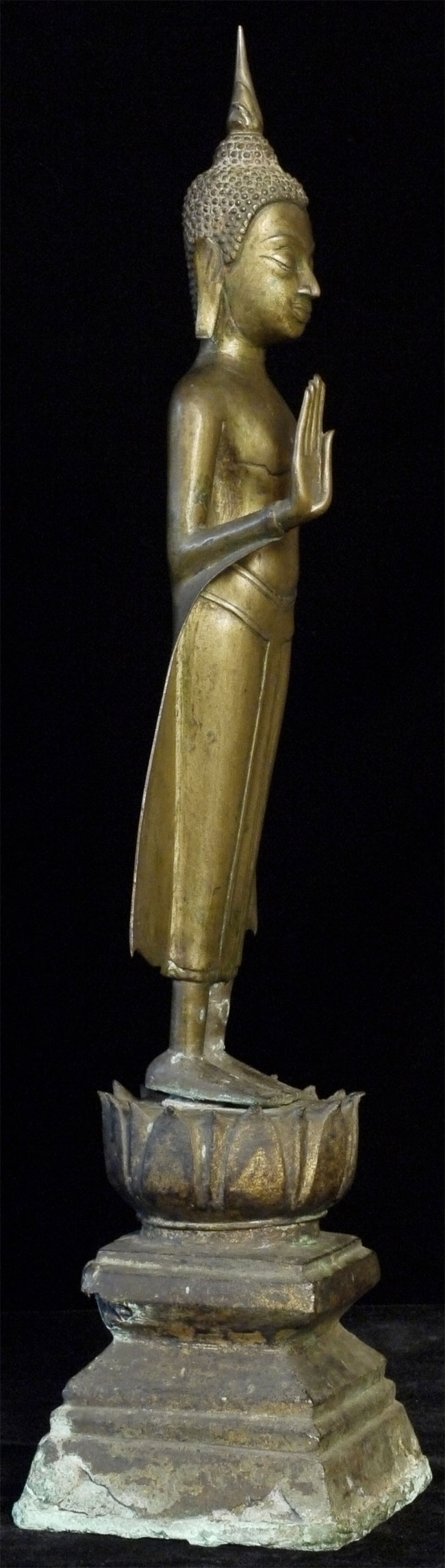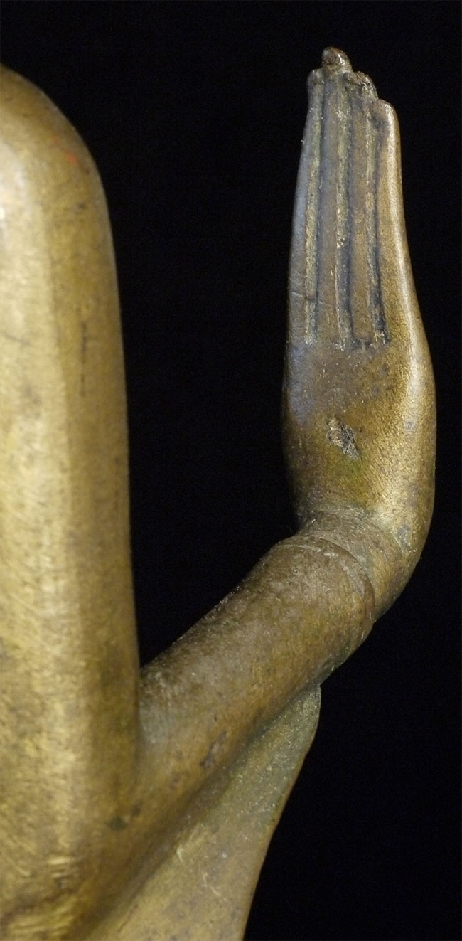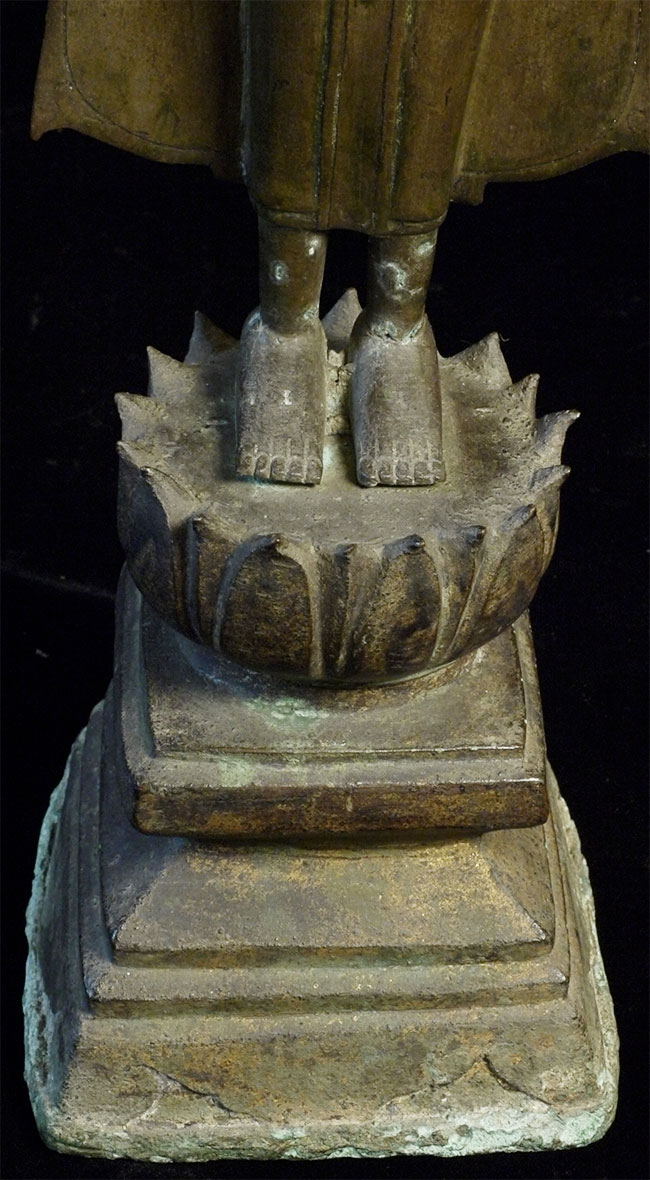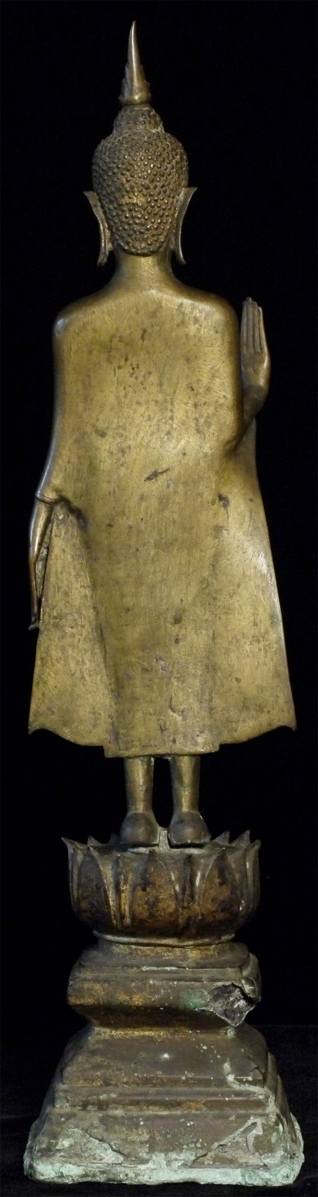 Deeply serene 16/17thC Thai Buddha. Very good quality. Condition as seen in photos. Quite large at 18.75 inches including the base. Bottom of base measures 4.25 x 4.25 inches. Stands well, though a little loosed where the Buddha connects to the base. Previous U.K. owner inherited this from his grandfather who was stationed in the far east of the British Empire in the 1920's. Flaw on front of chest is an original cast flaw which would have been covered with lacquer and gilding.