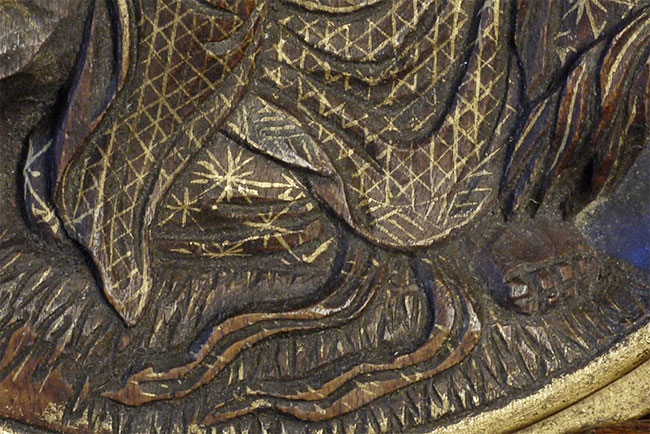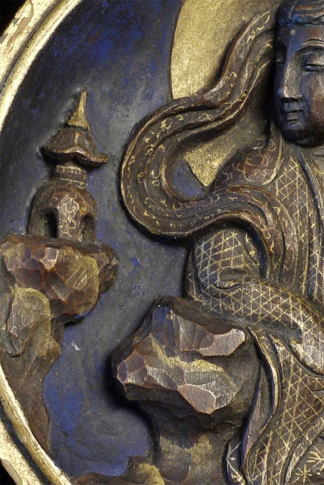 Large and beautiful Meiji era Japanese pocket shrine. Skillful carving and painting. Blue back ground is crushed lapis. Typically this type is much smaller. Originally would have had another half which may or may not have been carved as well. Superb condition. 4.25 inches in diameter. Mother of pearl inlay on back. Stand included.