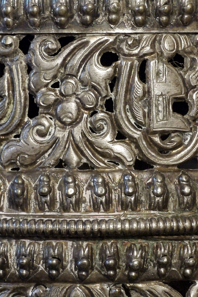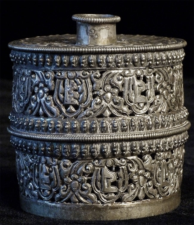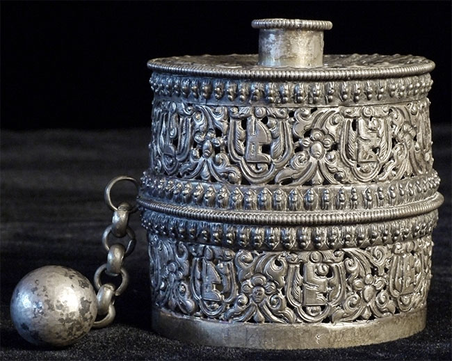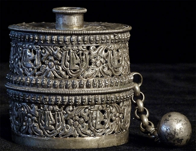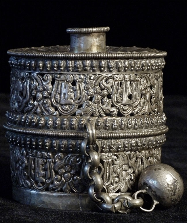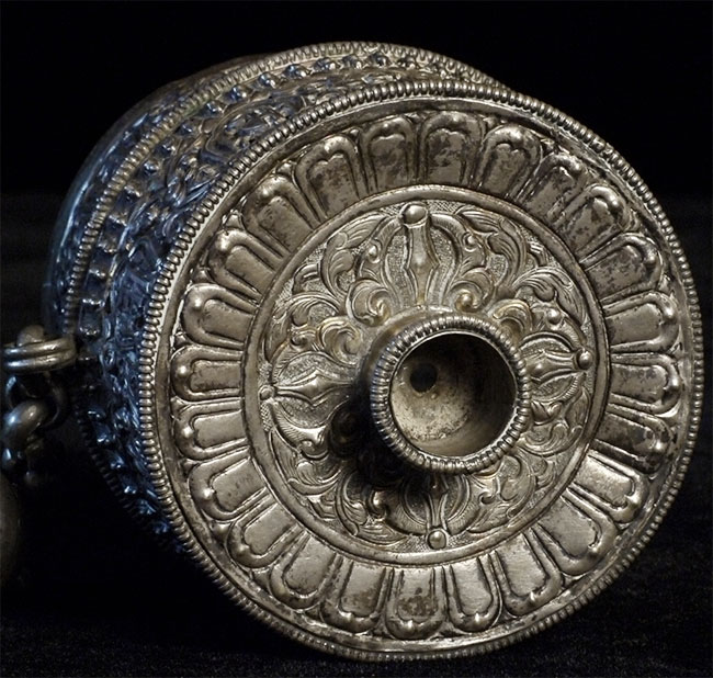 This antique prayer wheel (incomplete) is from an estate in Scotland which was put together in the 1950's and 60's. Beautiful elaborate repousse. Stands 2.5 inches tall, diameter of 2.5 inches