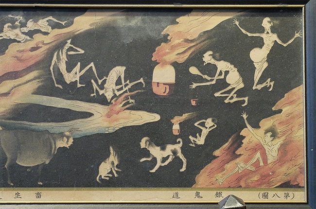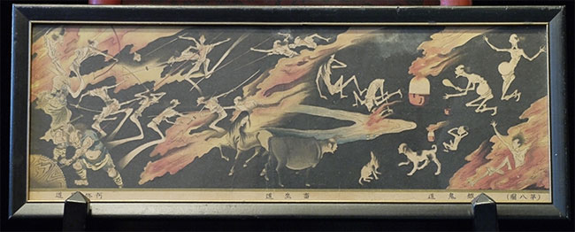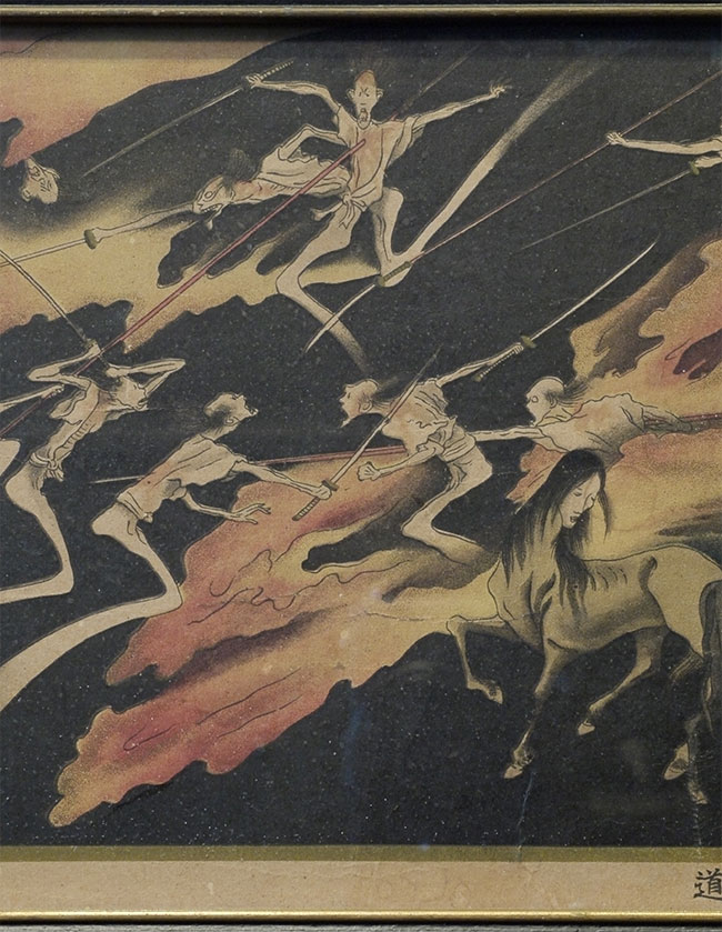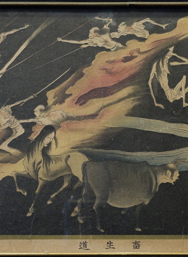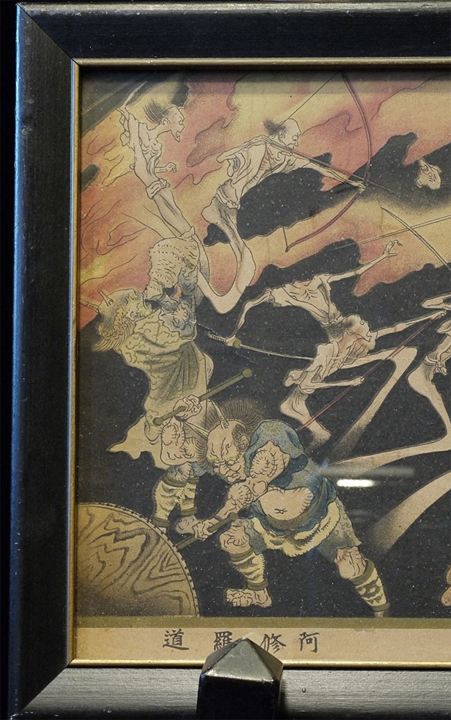 Medium size detailed Japanese Edo period depiction of one of the realms of Buddhist Hell. Probably a hand colored and paint overlaid woodblock print. Came as part of a set of seven(this is the second largest). Others listed or will be listed shortly. Some losses, as seen the photos. Image measures 7 x 20 inches. The set was brought back by a soldier in 1946 from Japan, and then framed and given as a mother's day gift in 1953 ( based on notes on the back of one of the frames). Animated, intricate, and filled with energy. Could use to be re-framed.
