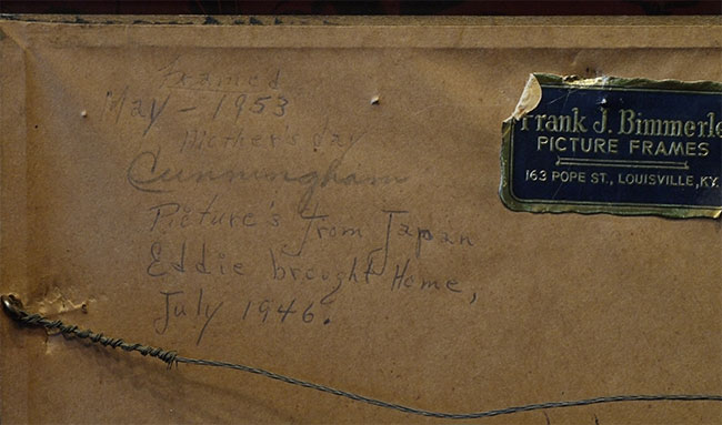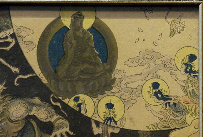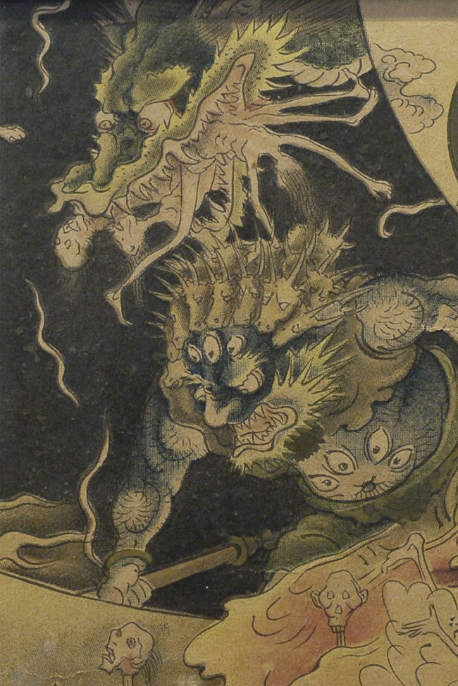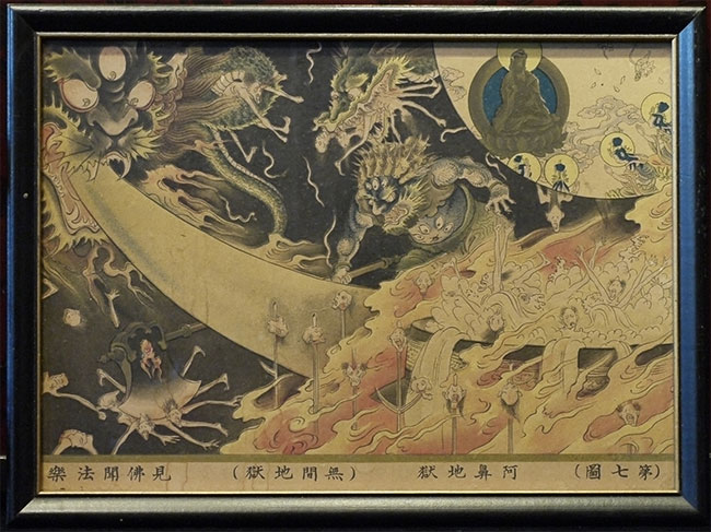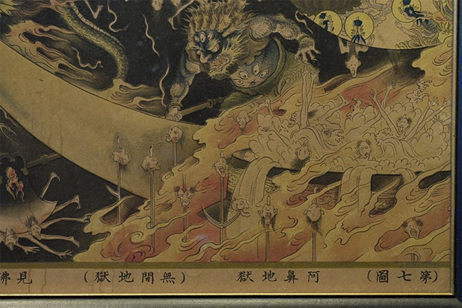 Small detailed Japanese Edo period depiction of one of the realms of Buddhist Hell. Probably a hand colored and paint overlaid woodblock print. Came as part of a set of seven(this is the second largest). Others listed or will be listed shortly. Some losses, as seen the photos. Image measures 9.5 by 7 inches. The set was brought back by a soldier in 1946 from Japan, and then framed and given as a mother's day gift in 1953 ( based on notes on the back of one of the frames). Animated, intricate, and filled with energy. Could use to be re-framed.