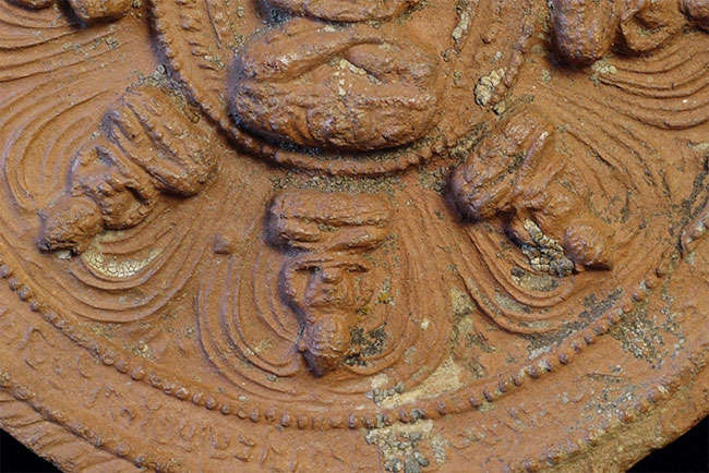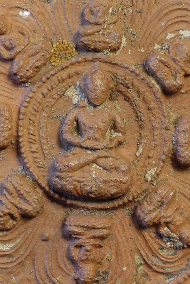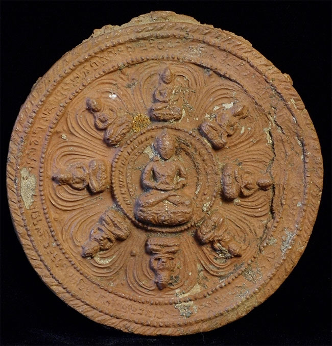 Very old Tibetan excavated terracotta Buddha mandala. Has a diameter of 3.75 inches and a total of 9 Buddhas.