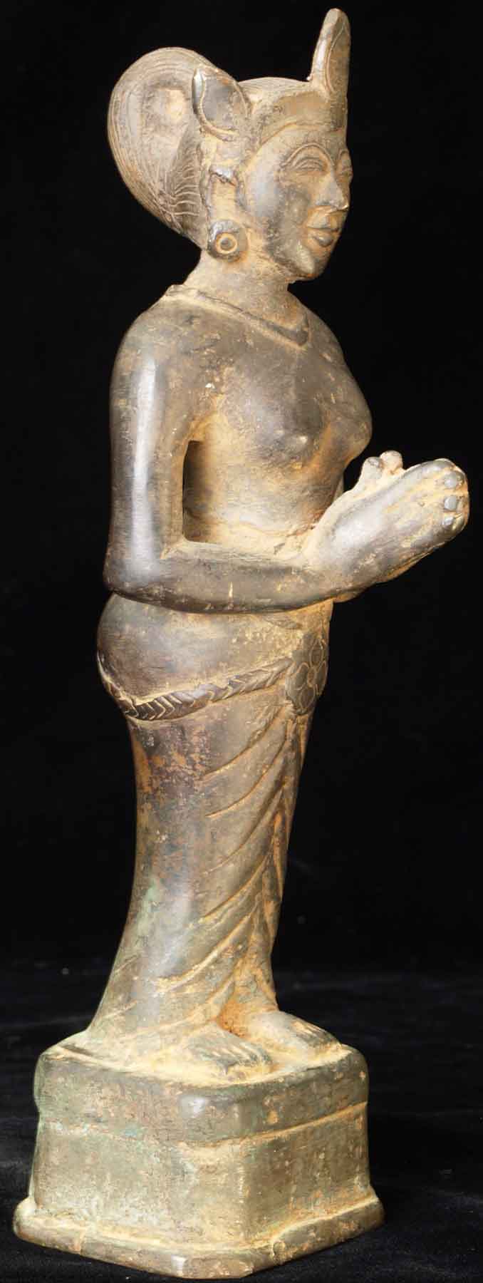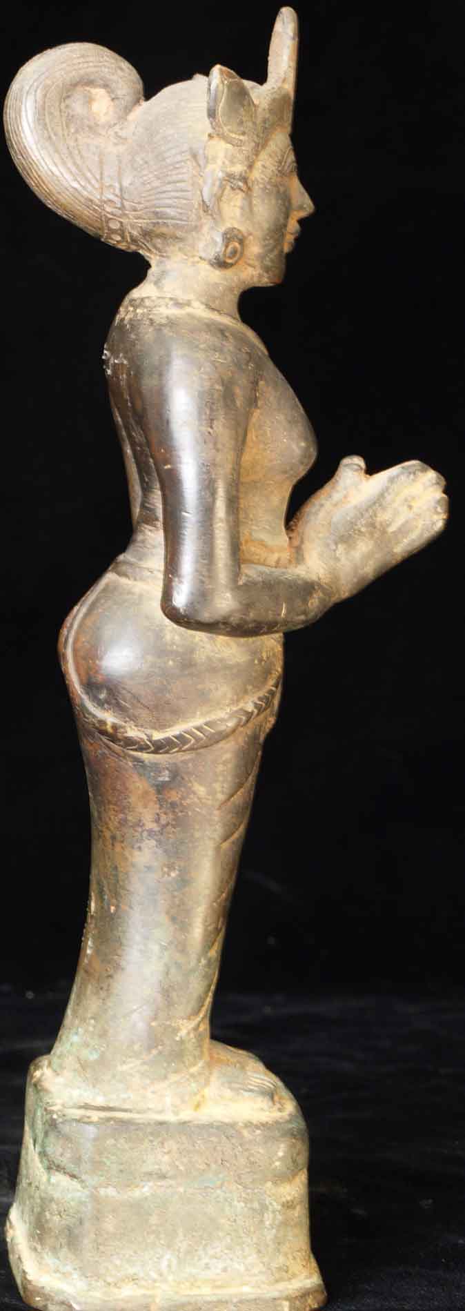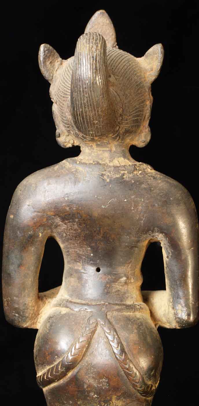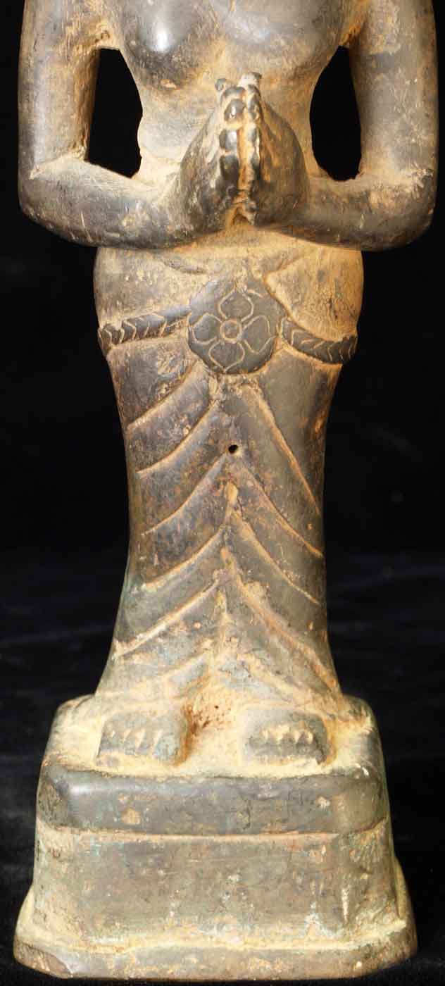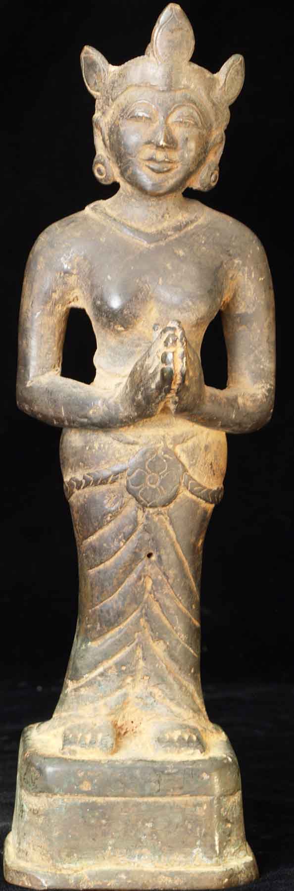 The face is wonderful- it almost has an early Pala style to it. It is either a donor figure or simply a bowing figure to go before a Buddha. The type of alloy is very unusual. It looks to be quite old. I will say 18/19thC, but it may be quite a bit earlier- I don't have books which show this type of piece. I've not had another like it. It stands 8.5 inches tall
