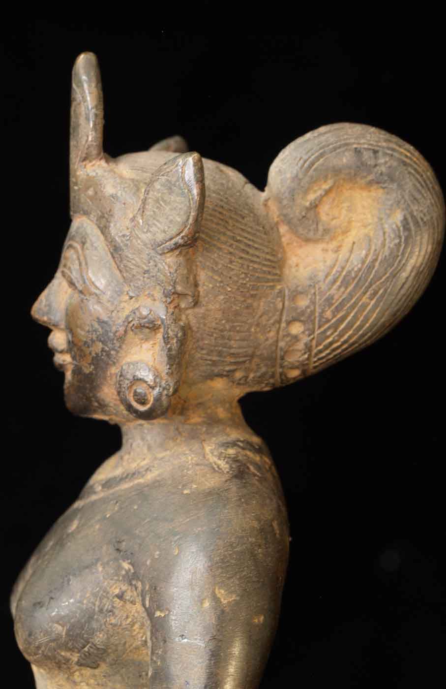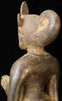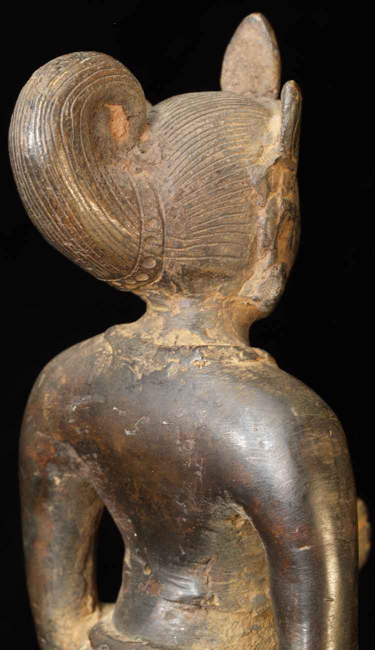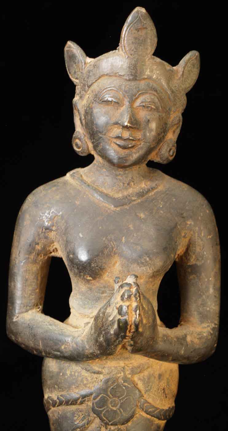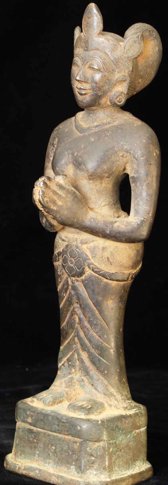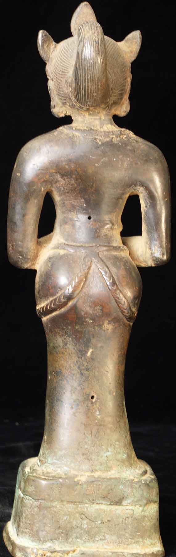 The face is wonderful- it almost has an early Pala style to it. It is either a donor figure or simply a bowing figure to go before a Buddha. The type of alloy is very unusual. It looks to be quite old. I will say 18/19thC, but it may be quite a bit earlier- I don't have books which show this type of piece. I've not had another like it. It stands 8.5 inches tall