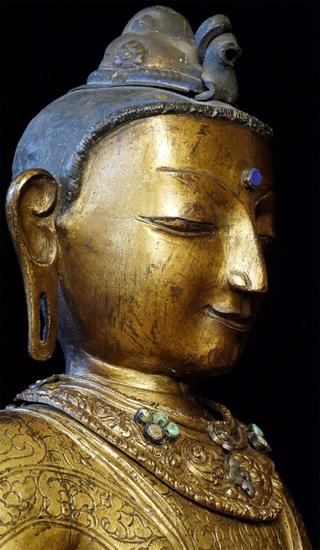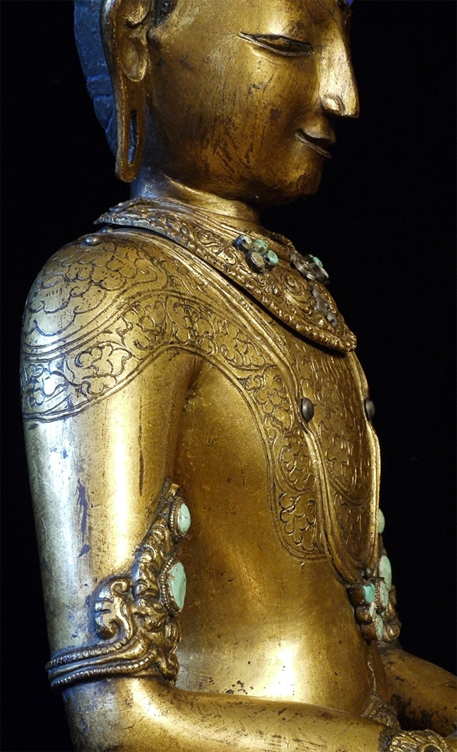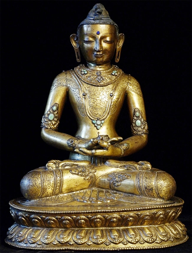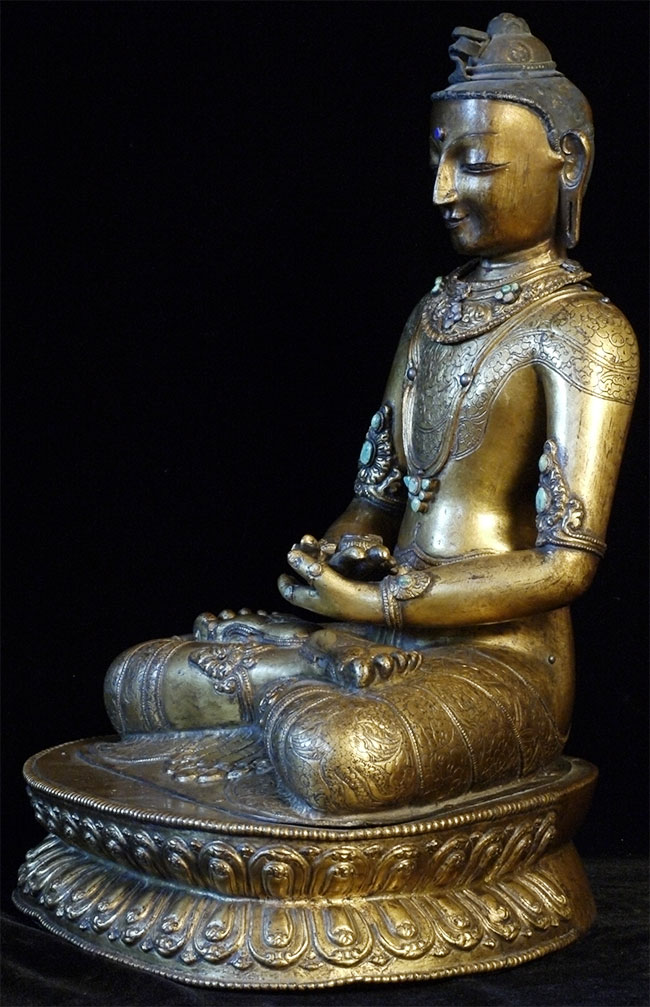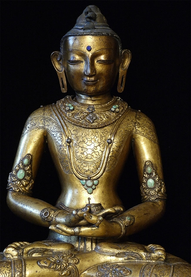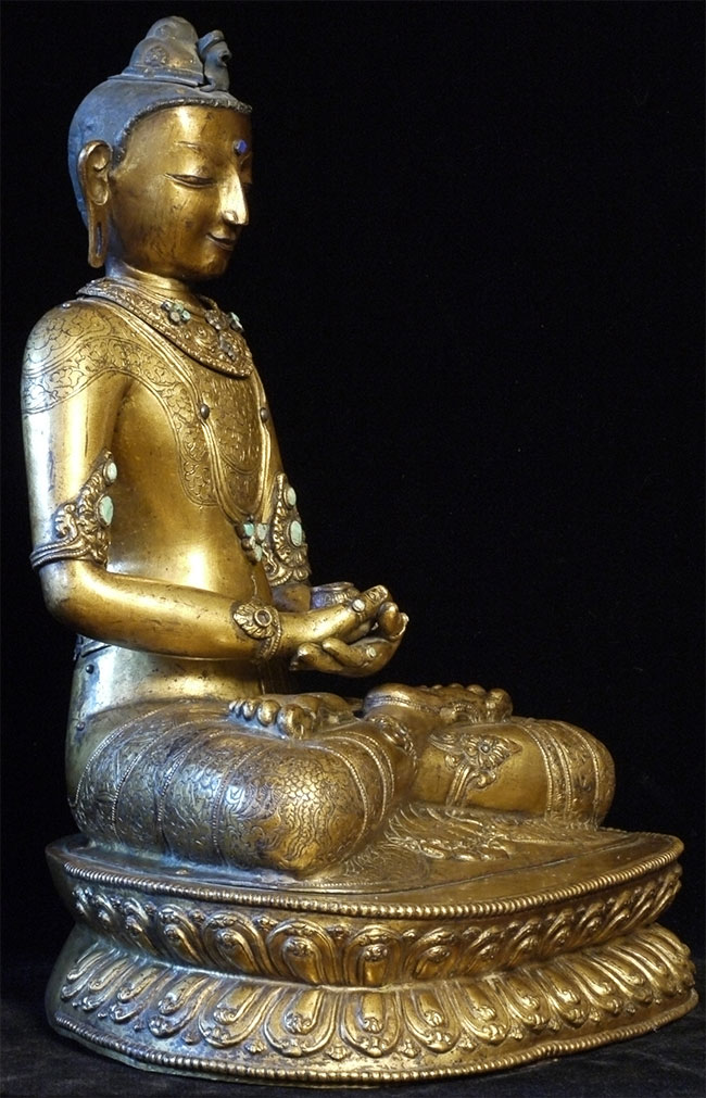 Best of the best! Design and detail work, face, overall look-unique- unlike any other Tibetan Buddha. Everybody who sees it stops and stares. If I had to give up all 2500 Buddhas I own and could keep only one- this may just be the one. Stones all original. May have had a crown or other headdress (based on unusual squiggle of metal on top of the head). Exquisite smile lights up the world. I sold this Buddha, but recently bought it back for triple what I sold it for. I feel very lucky to have been able to possess it again, as I've never seen another like it. While the body is repousse (and head is cast), it is extremely heavy and thick compared to the 18/19thC examples (and is literally sinking into its own base over the centuries under its own weight- an excellent sign of authenticity). Spend time gazing into the face and fall in love. Almost feels alive. Remarkably, for such a large Tibetan Buddha, the consecration plate on the underside appears to be original to the piece. Measures 17 3/8" tall, 13" wide, 10.5" deep and 20.25" tall on custom base.
