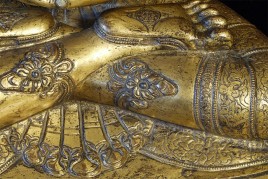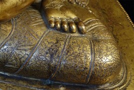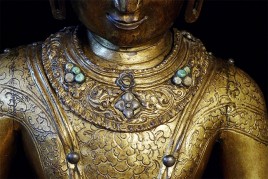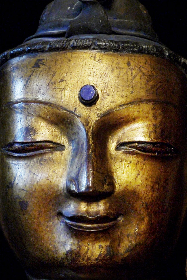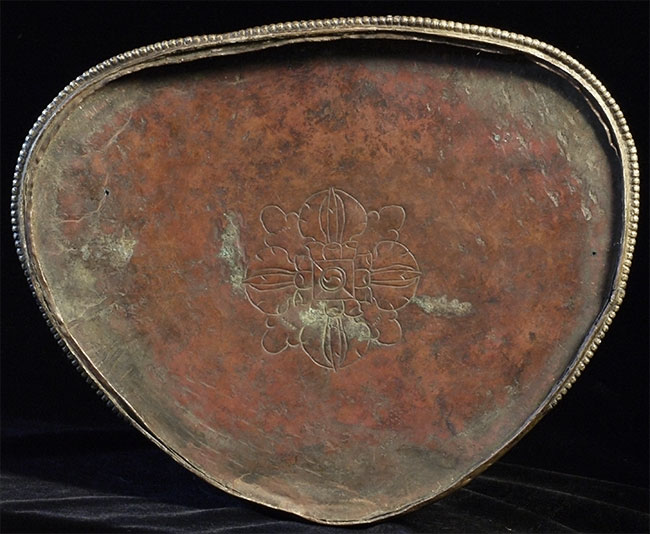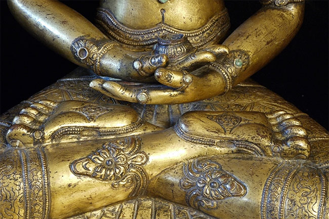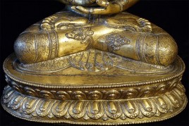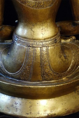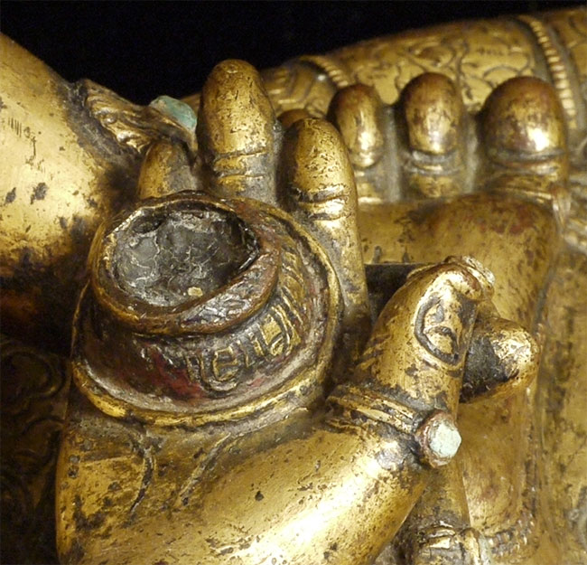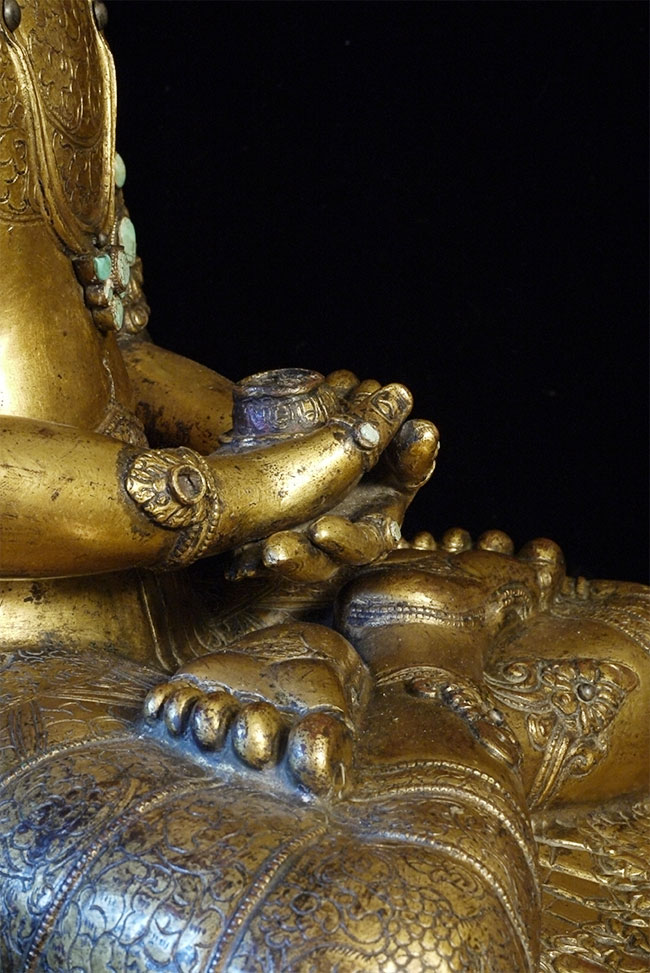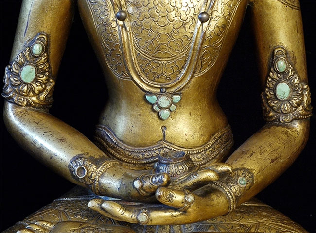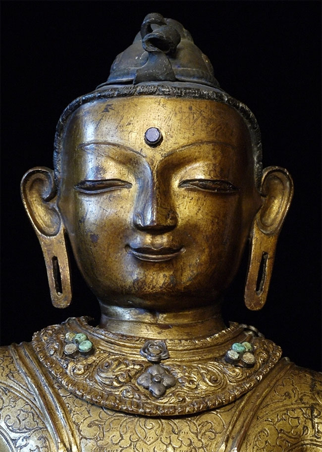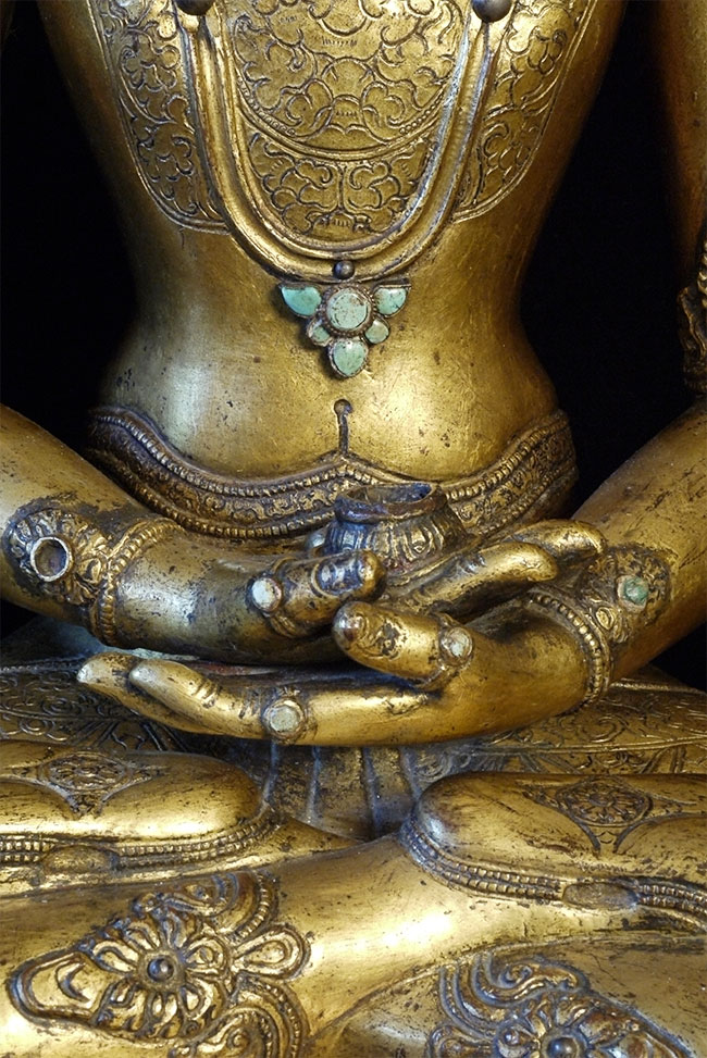 Best of the best! Design and detail work, face, overall look-unique- unlike any other Tibetan Buddha. Everybody who sees it stops and stares. If I had to give up all 2500 Buddhas I own and could keep only one- this may just be the one. Stones all original. May have had a crown or other headdress (based on unusual squiggle of metal on top of the head). Exquisite smile lights up the world. I sold this Buddha, but recently bought it back for triple what I sold it for. I feel very lucky to have been able to possess it again, as I've never seen another like it. While the body is repousse (and head is cast), it is extremely heavy and thick compared to the 18/19thC examples (and is literally sinking into its own base over the centuries under its own weight- an excellent sign of authenticity). Spend time gazing into the face and fall in love. Almost feels alive. Remarkably, for such a large Tibetan Buddha, the consecration plate on the underside appears to be original to the piece. Measures 17 3/8" tall, 13" wide, 10.5" deep and 20.25" tall on custom base.