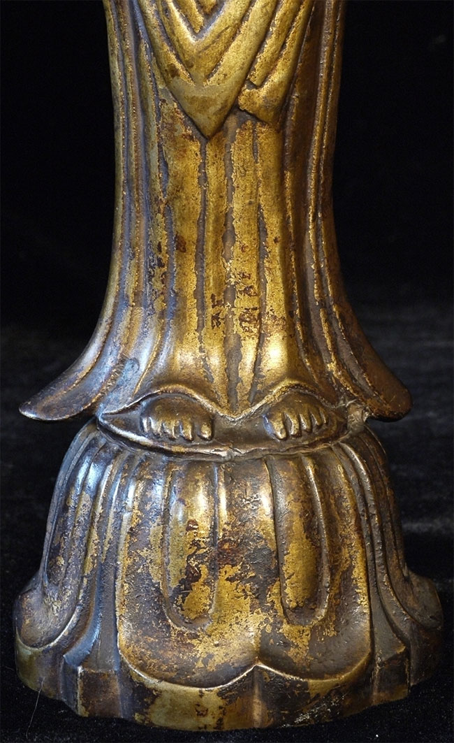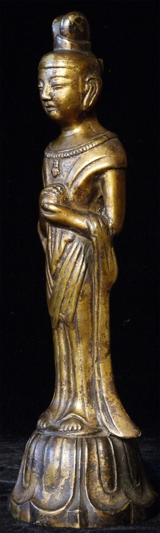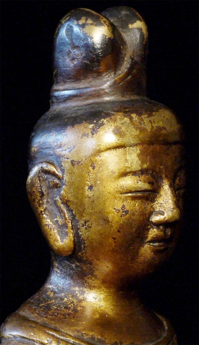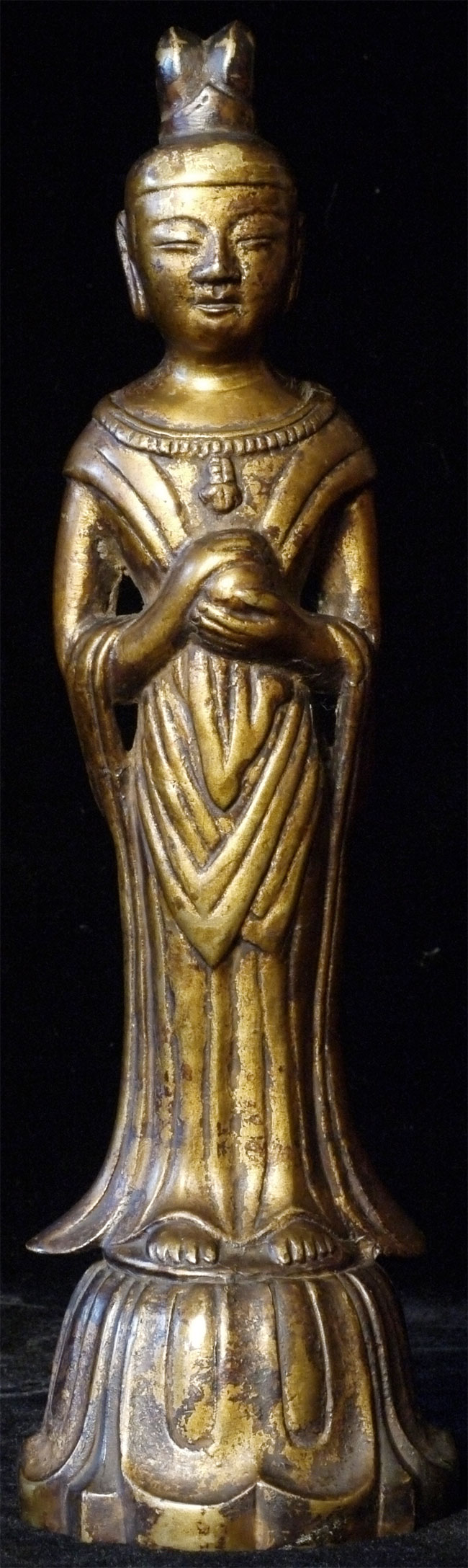 Early, large, and well cast Korean, bronze Bodhisattva. Classic depiction of an extremely early style--looks to be several hundred years old, though unlikely to be a period (1500 year old) piece. Quite big at 11 inches tall. Excellent example, with most of its original gilding still intact.