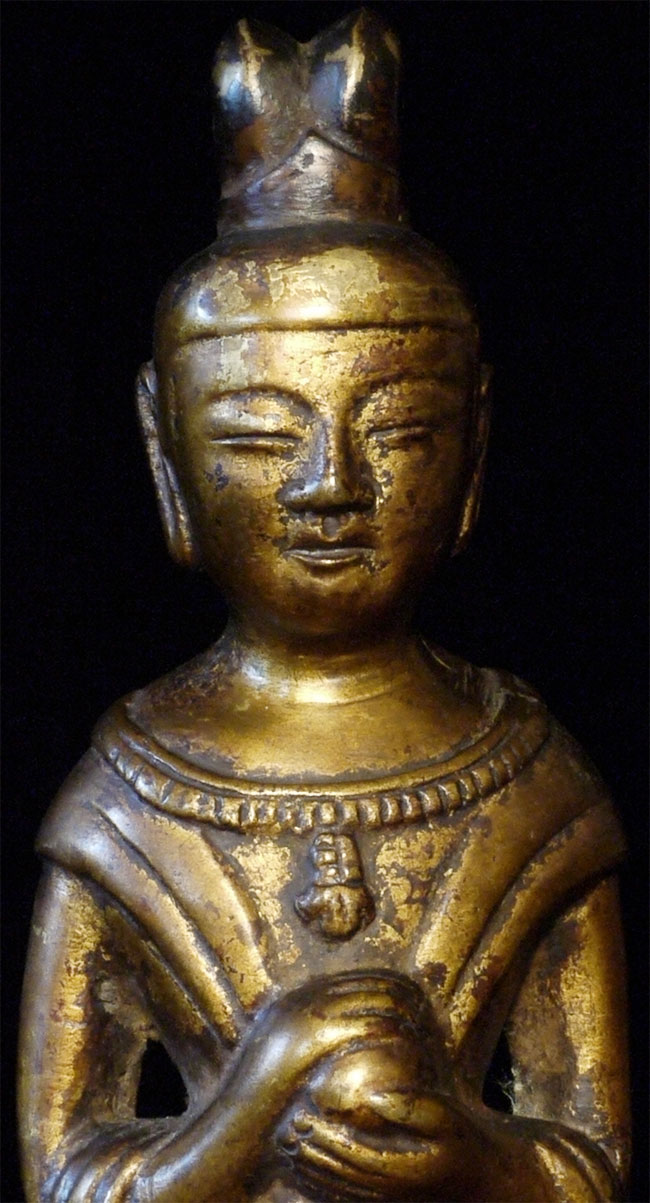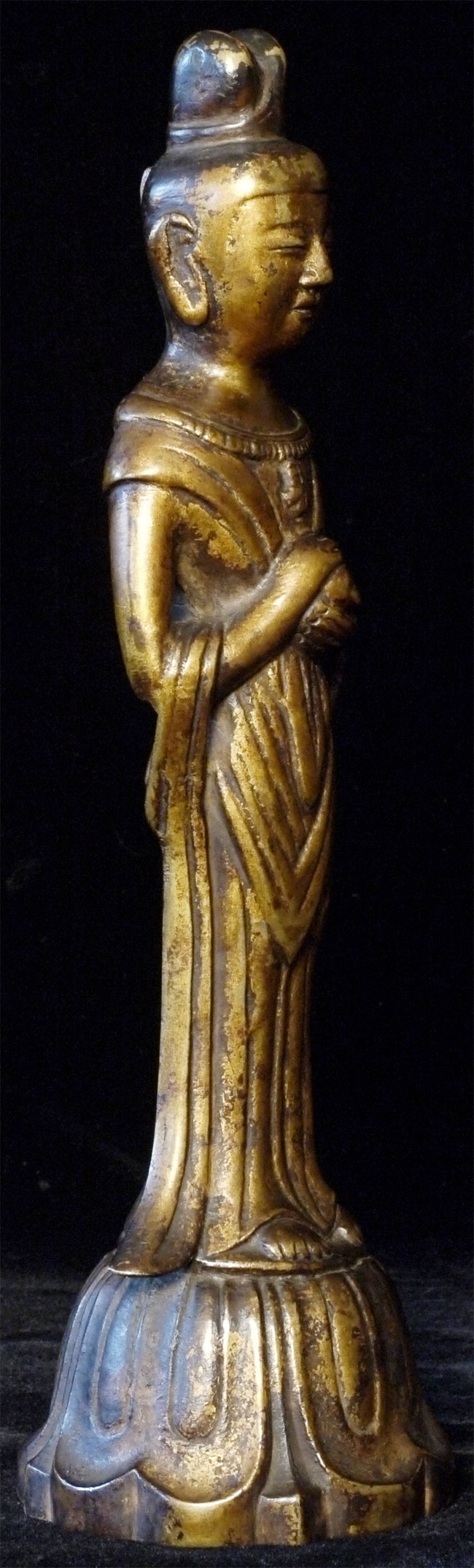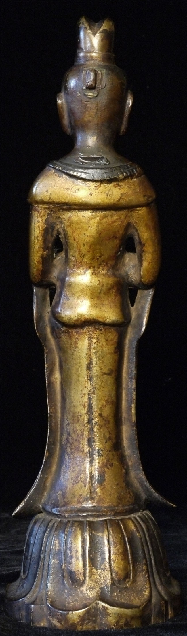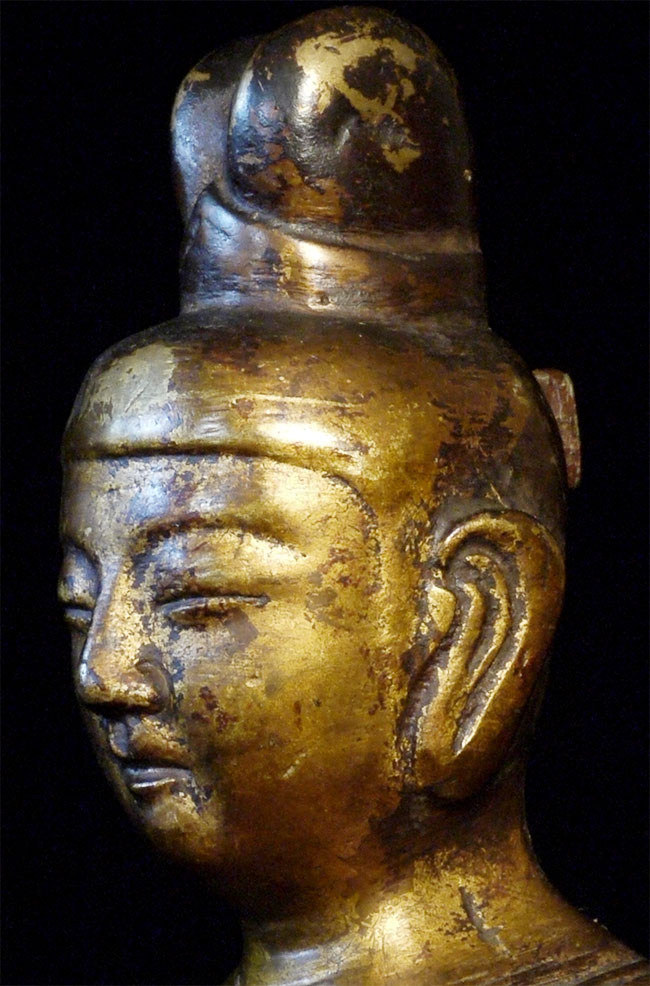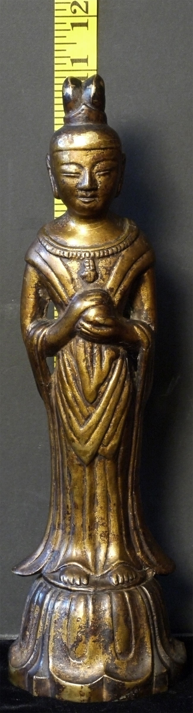 Early, large, and well cast Korean, bronze Bodhisattva. Classic depiction of an extremely early style--looks to be several hundred years old, though unlikely to be a period (1500 year old) piece. Quite big at 11 inches tall. Excellent example, with most of its original gilding still intact.