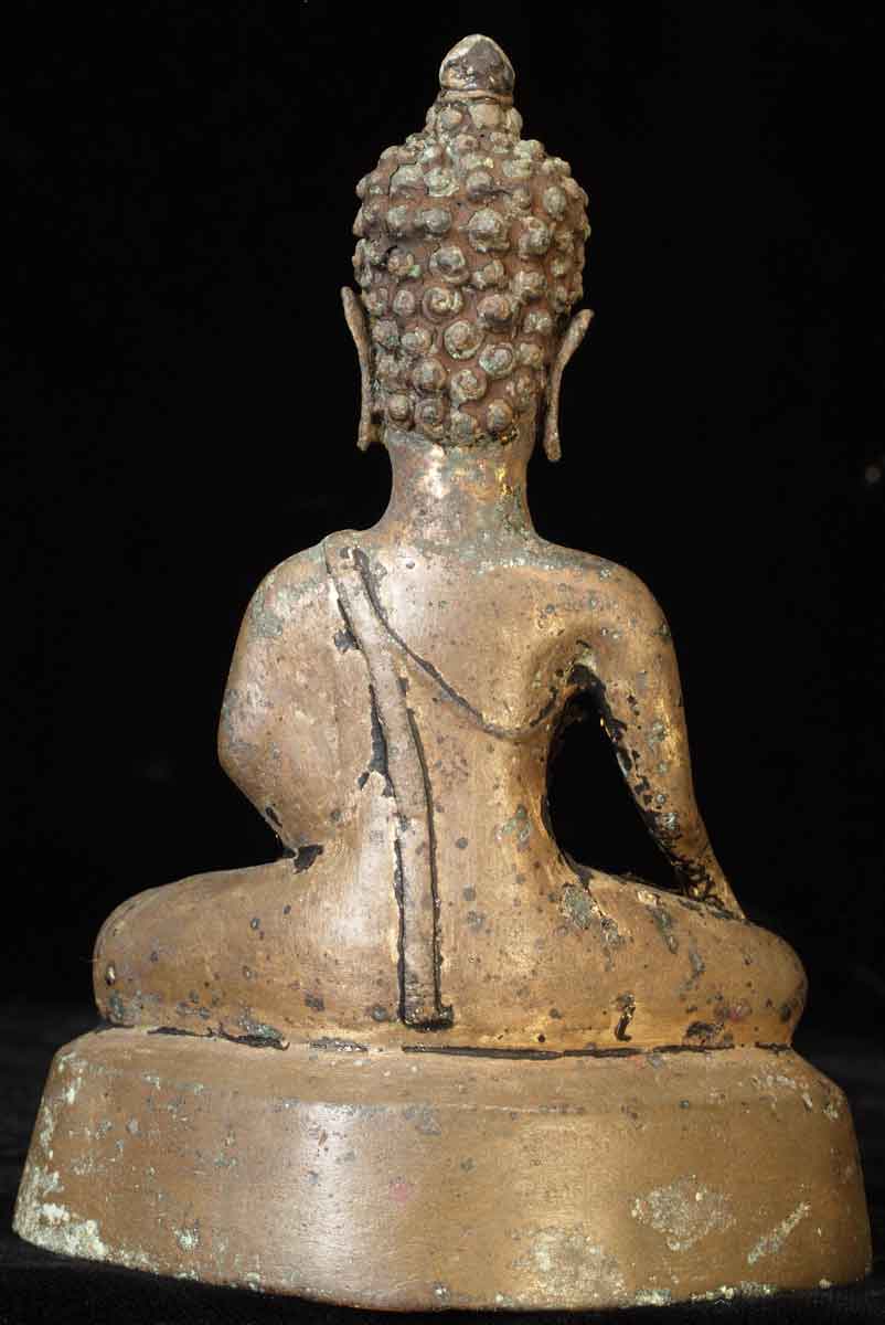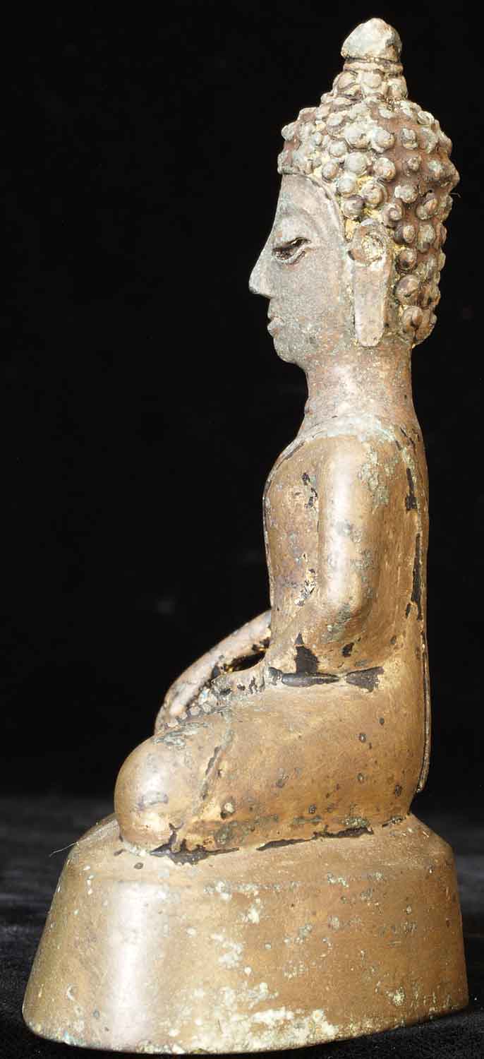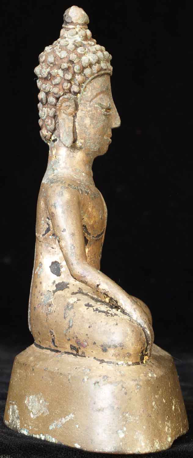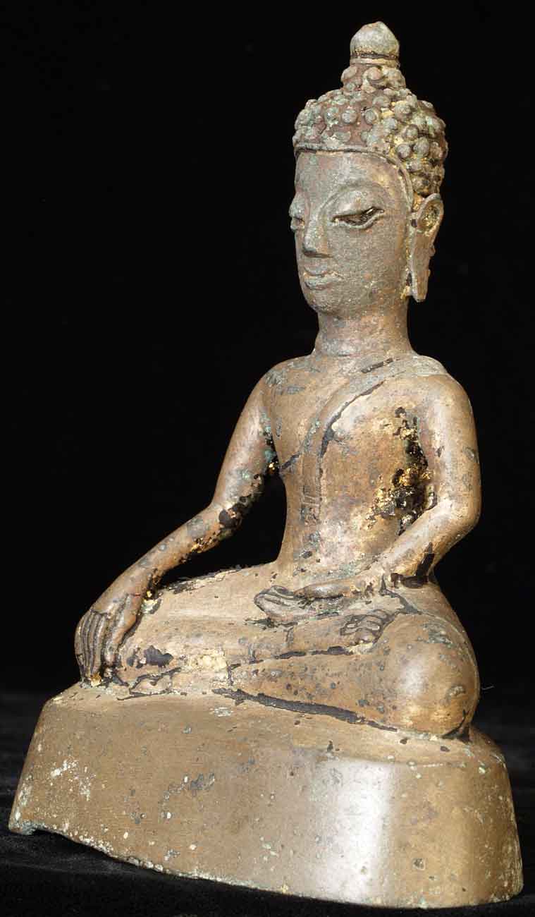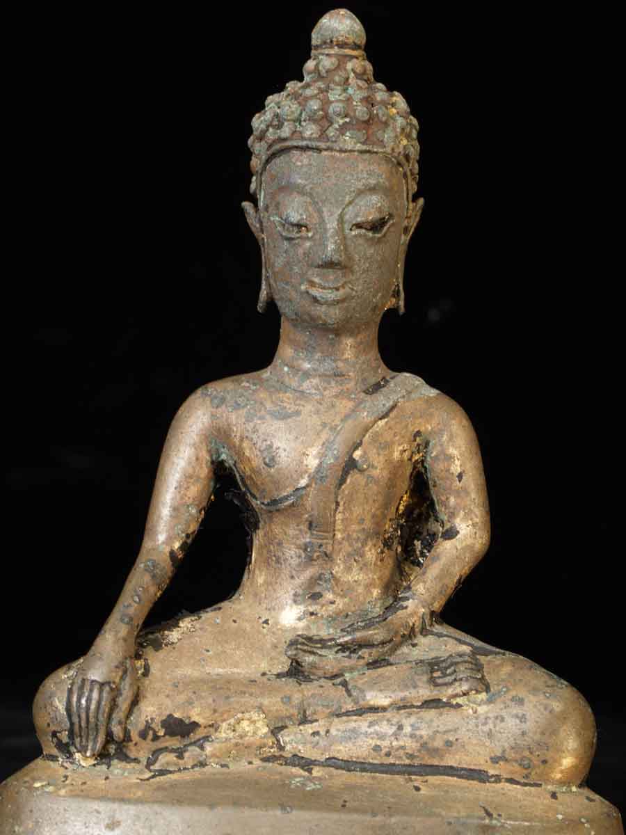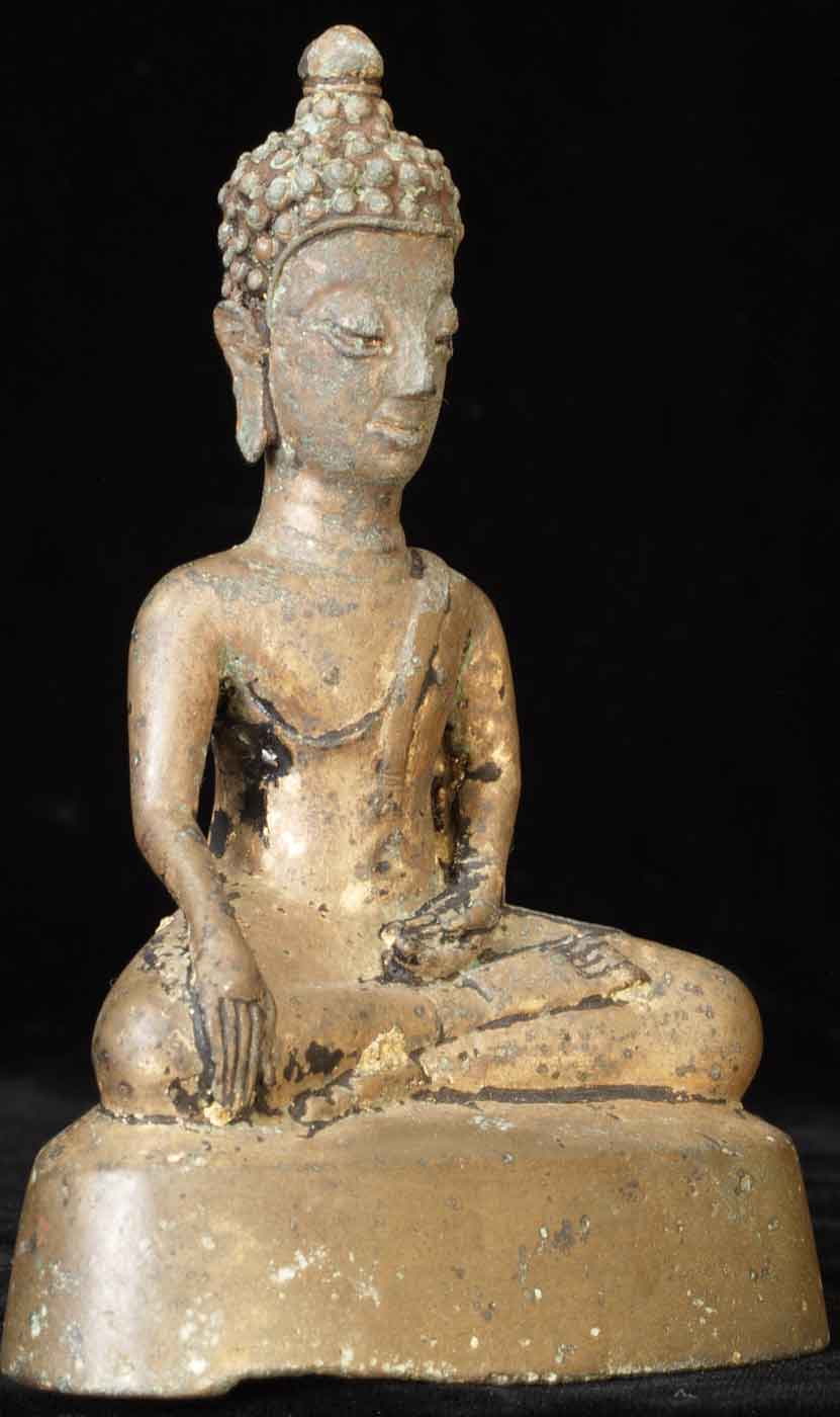 Fabulous Laos Bronze Buddha with tons of personality. Very well cast. Originally lacquered and gilded- traces remain. This is a personal favorite. 5 1/2 inches x 4 inches