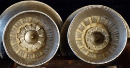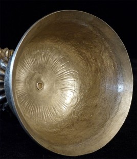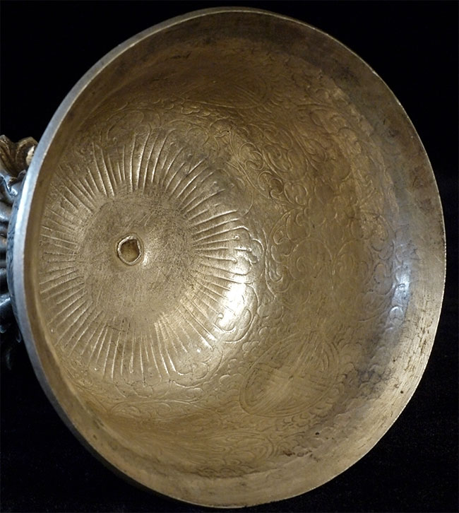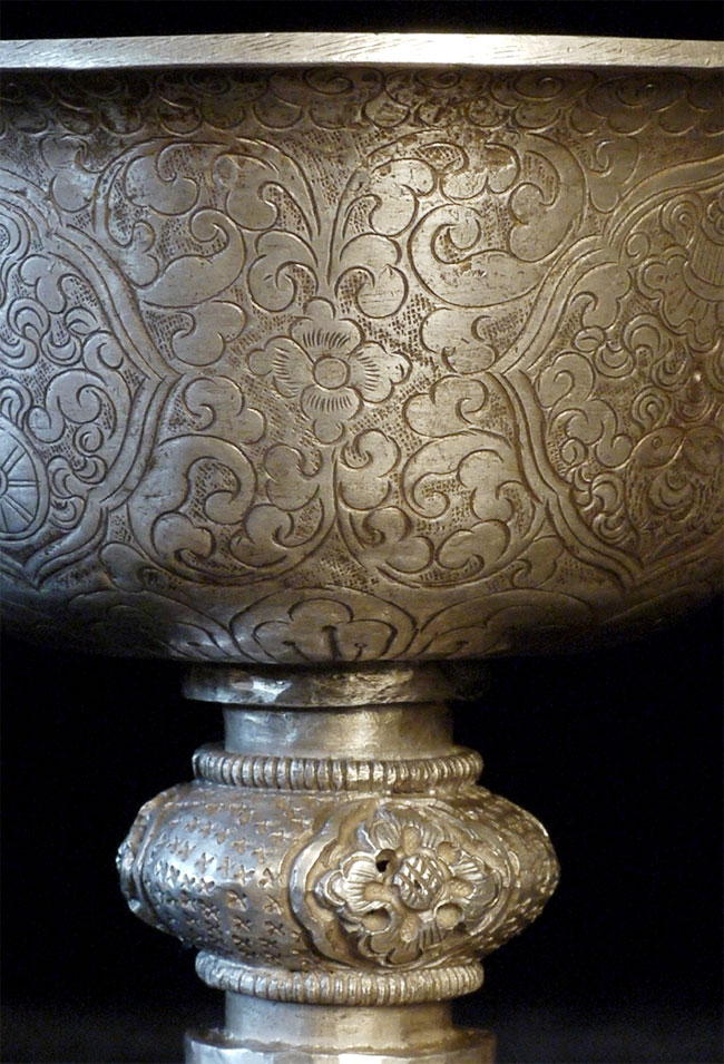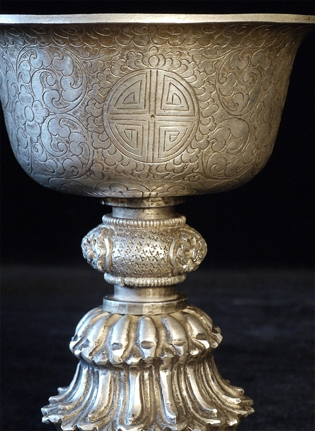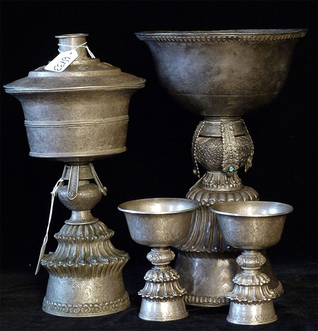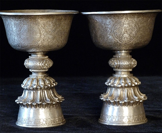 Beautiful pair of old Tibetan silver Cups or oil lamps. They each are 5 1/8 inches tall. These are of typical size. fine detail work. Shown with two very large examples, item # 6436 and # 6433