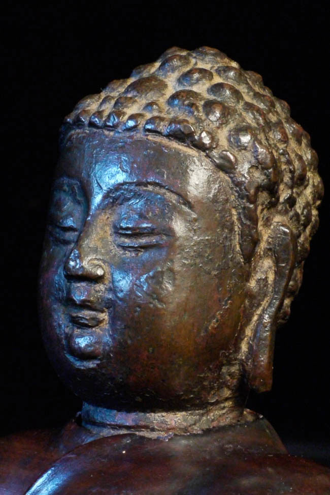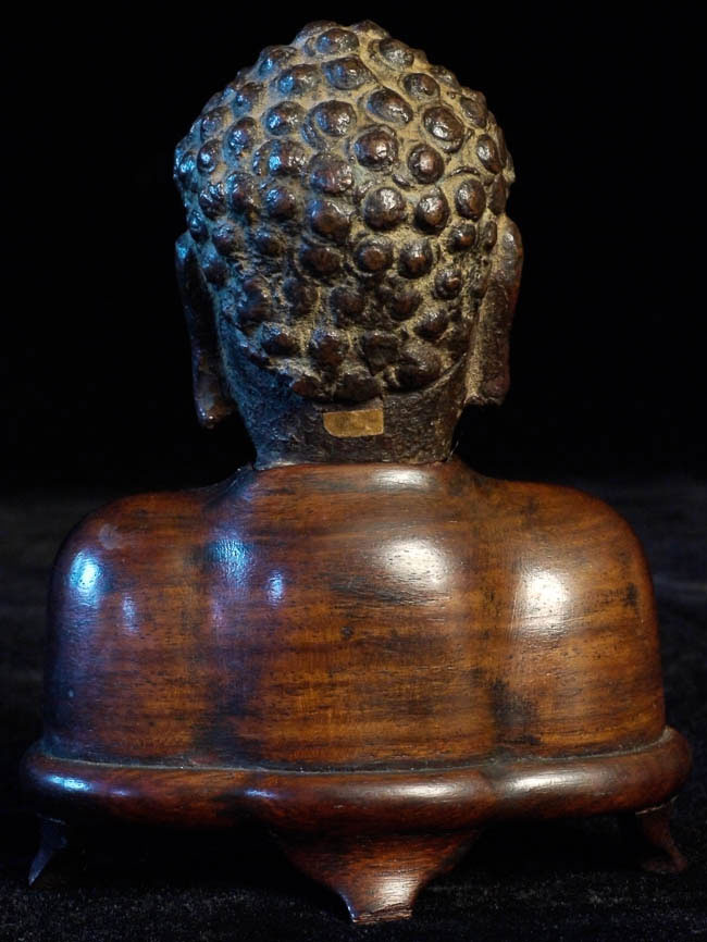A fine 15thC Ming bronze Buddha head on a beautifully carved custom base. Total height is 4 inches tall. The head alone is 2.25 inches. This piece has a great personality!