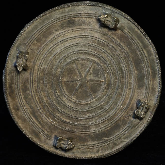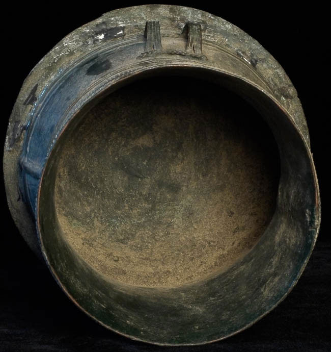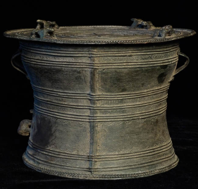 Mini Burmese Karen Rain Drum. Smallest I've ever seen of this type. Miniature ones are quite rare and are typically more valuable than the larger ones. Unsure of age, as shiny metal can be seen under scratches on the underside, though does look to have honest age. From a large bay area collection of SE Asian antiques. Sits 4 7/8 inches tall, top diameter of 7 inches. Purchased with a slightly larger example -- number 6447.