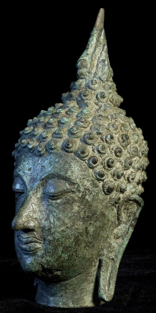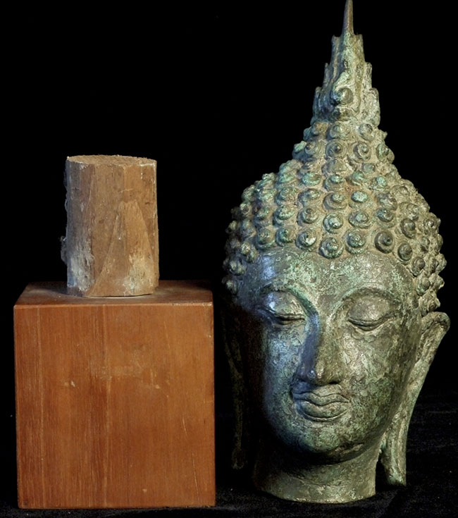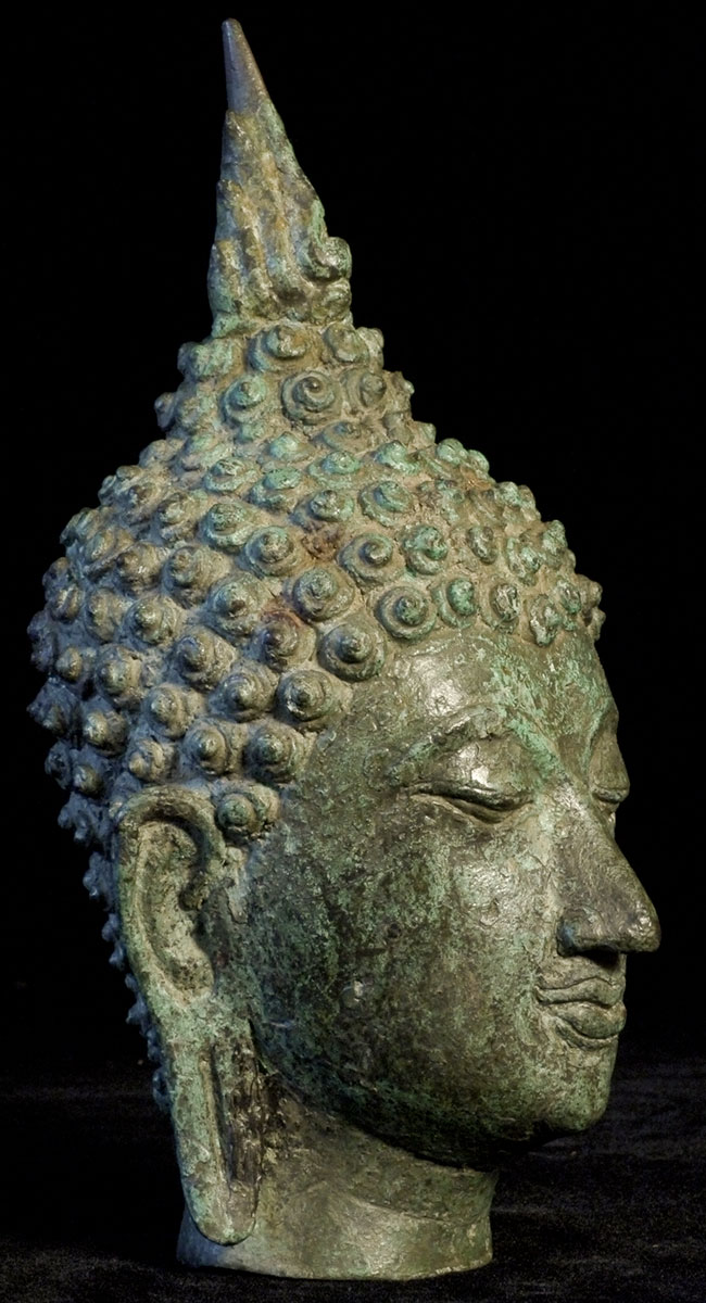 Antique Thai Sukhothai Buddha Head. Appears to have traces of old lacquer, and minute traces of gilding. Size of head only is 7.75 inches tall, stand elevates it another 3 1/8 inches. Beautifully cast, and very heavy for its size. Probably a period piece, though may be later. Interestingly, the face/head are not completely symmetrical- it appears to be the head of a walking Buddha.