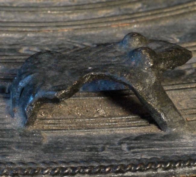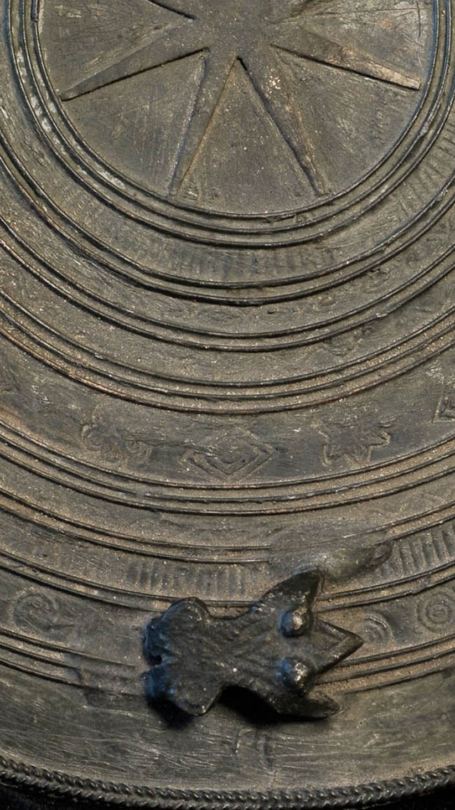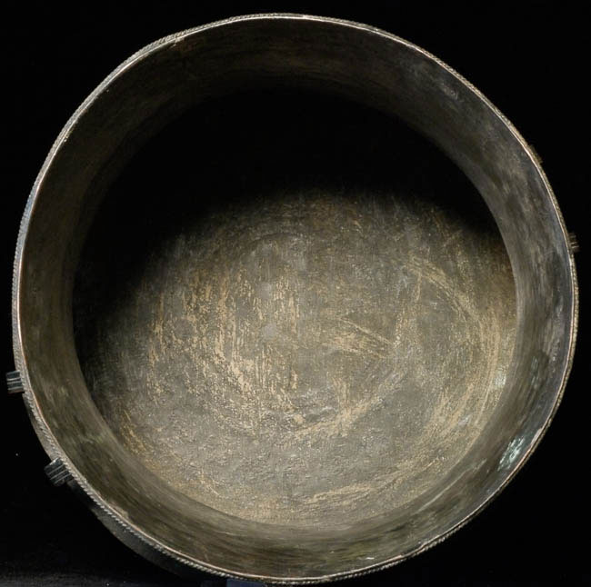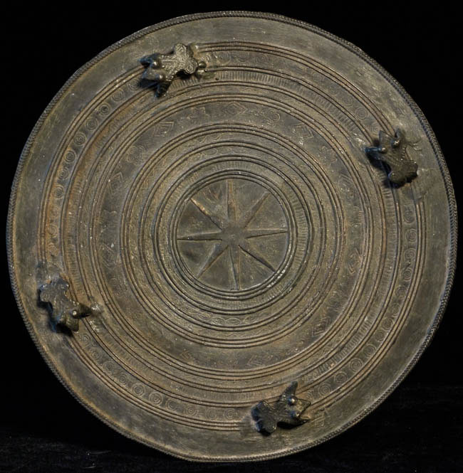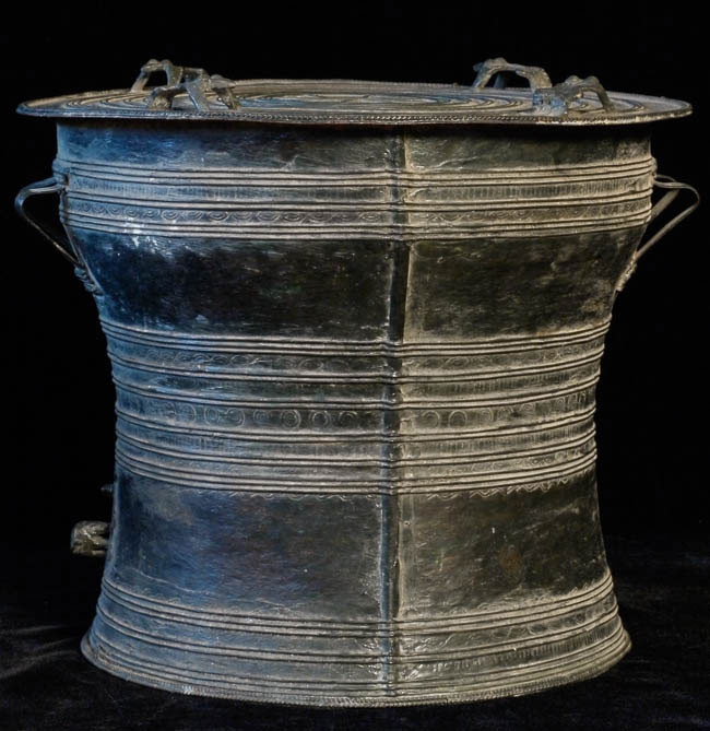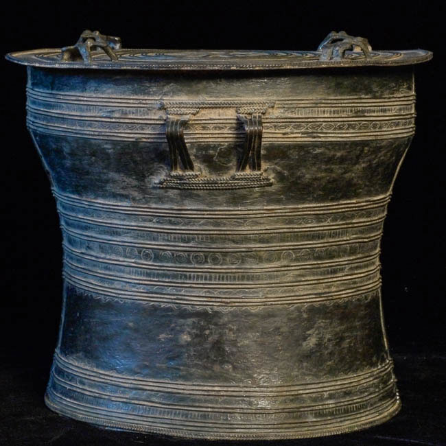 Mini Burmese Karen Rain Drum. One of the smallest I've ever seen of this type. Miniature ones are quite rare and are typically more valuable than the larger ones. Unsure of age, as shiny metal can be seen under scratches on the underside, though does look to have honest age. From a large bay area collection of SE Asian antiques. Sits 8.25 inches tall, top diameter of 10 inches. Purchased with a slightly smaller example -- number 6441.