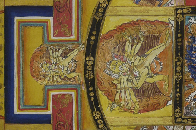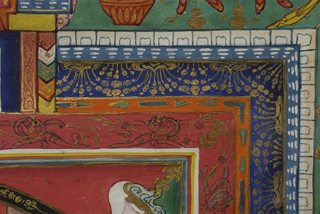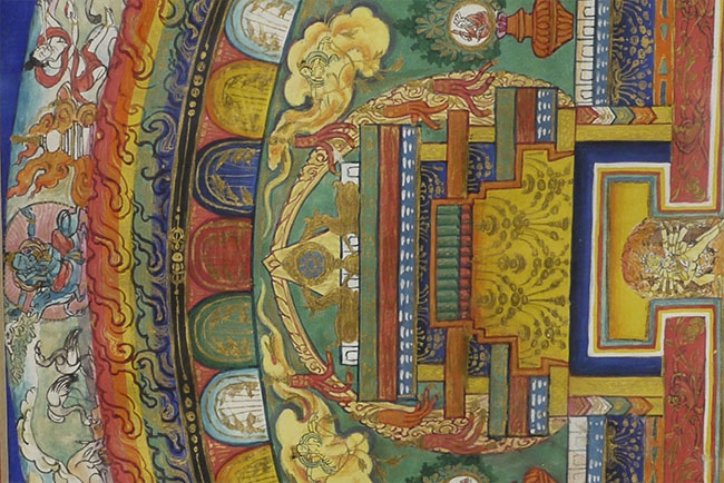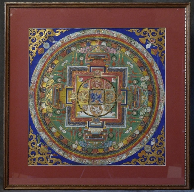 Tibetan Buddhist Mandala measures 12.75 x 12.75 inches, frame measures 17.75 x 17.75 inches. Incredible amount of detail.