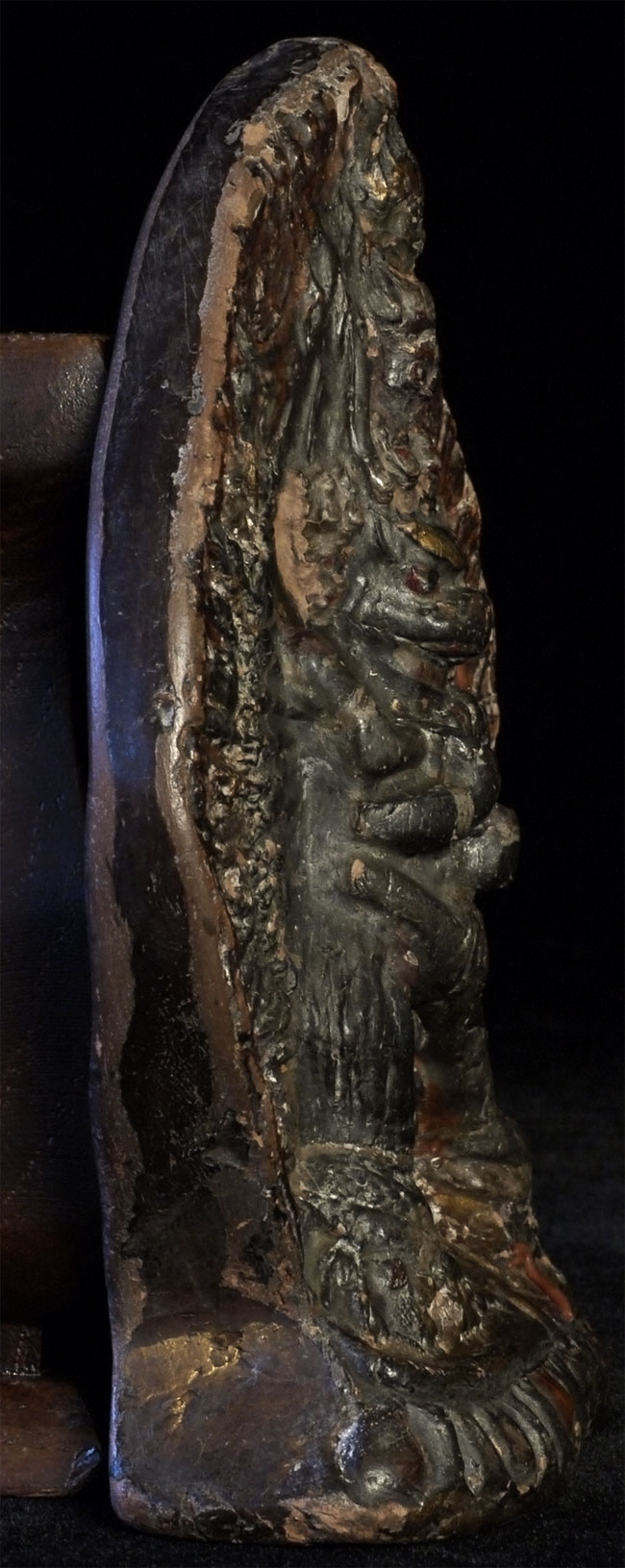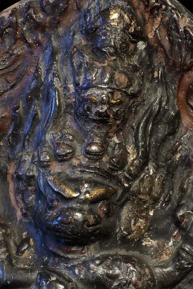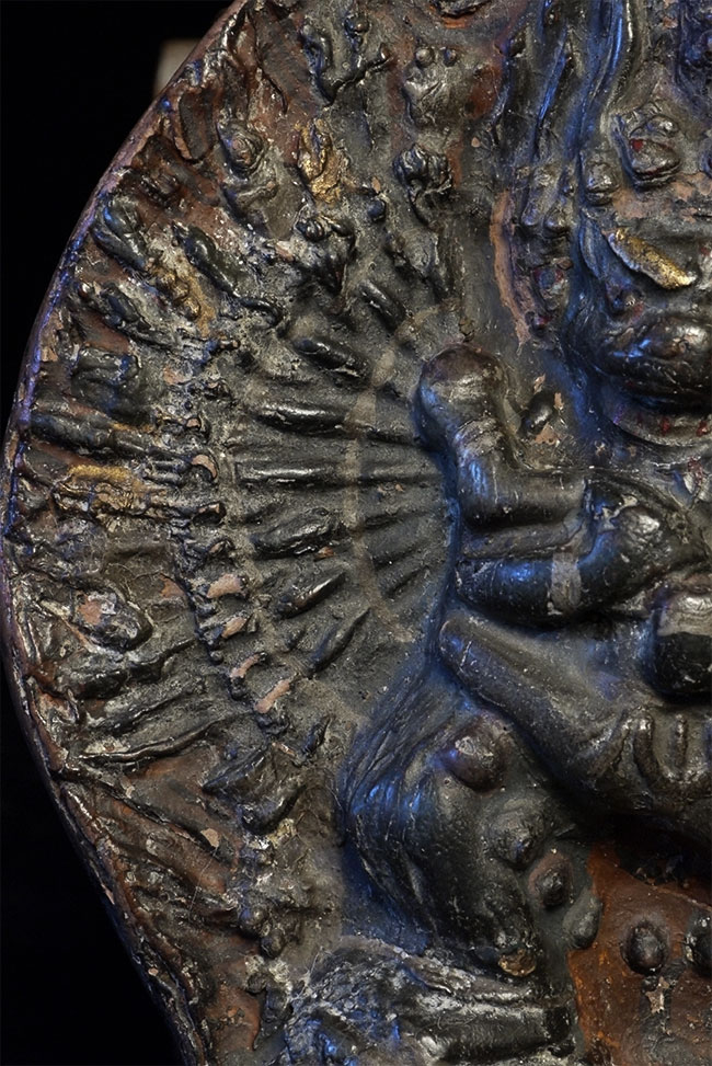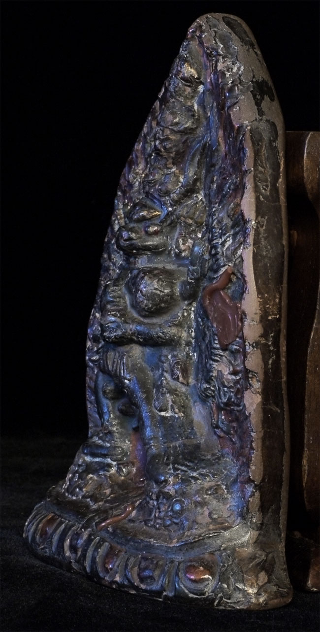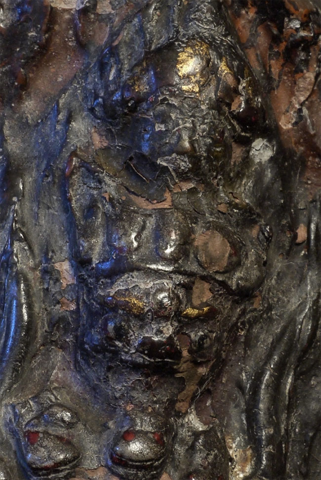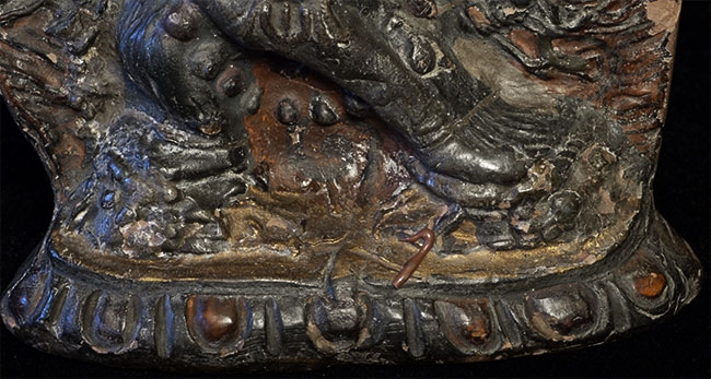 Very old Tibetan Fierce Deity in clay. Beautiful patina from long ritual use. Sits 5 3/8 inches tall. Wear and minor loss as seen in the photos. Possible old repair.