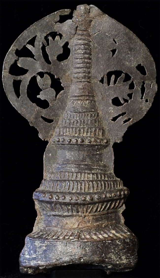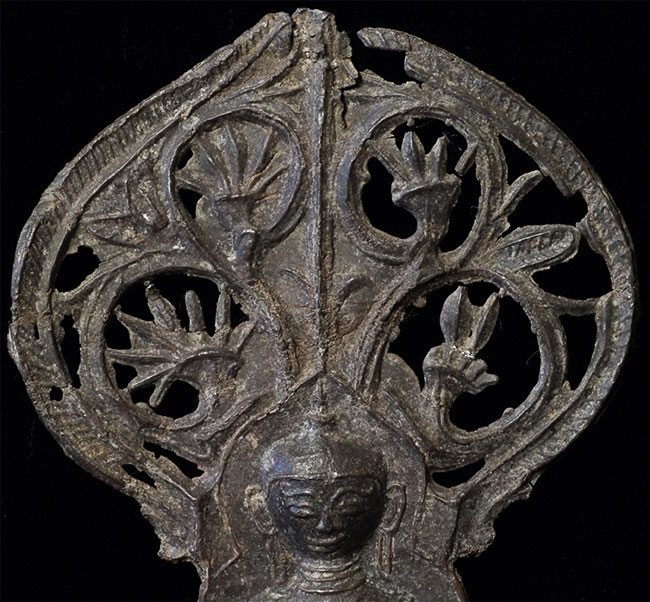 Very good 18/19thC Burmese lead alloy Buddha under stylized Bodhi tree. Exceptional face for this type. Stands 3.5 inches tall.