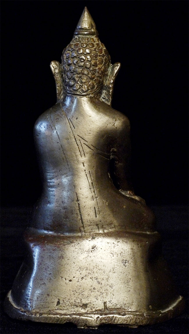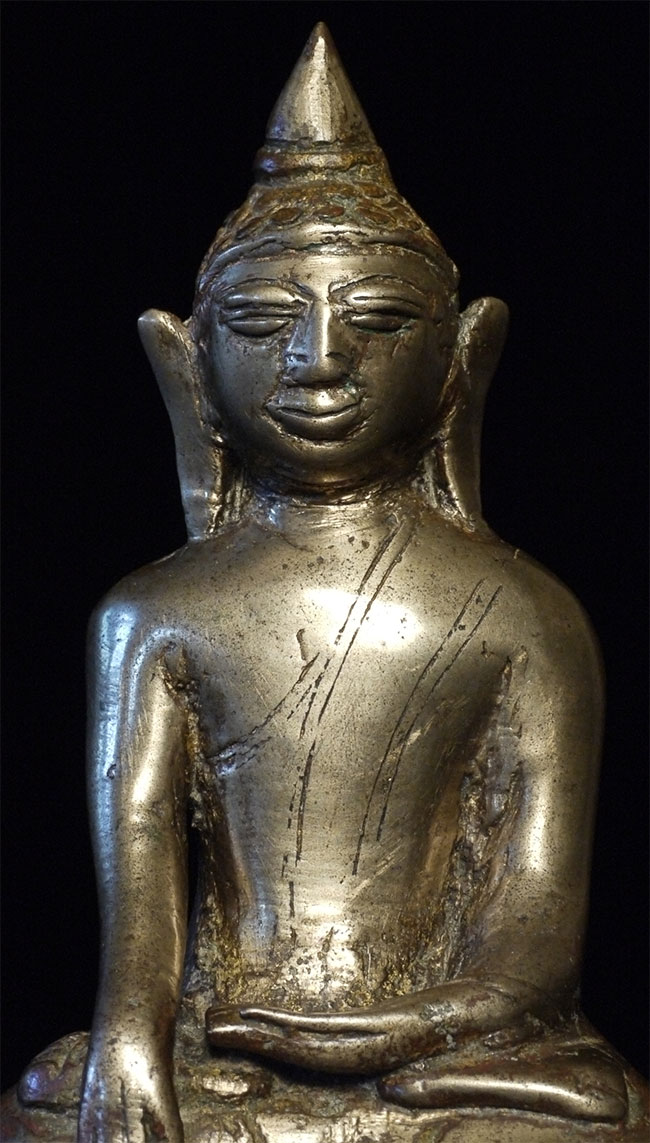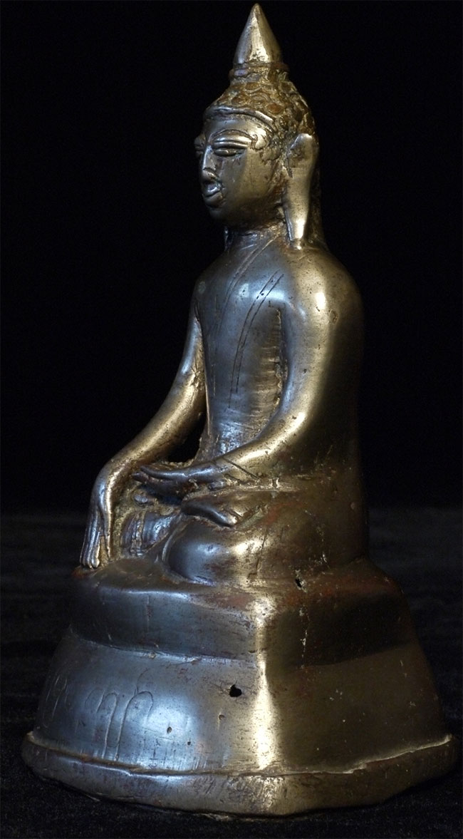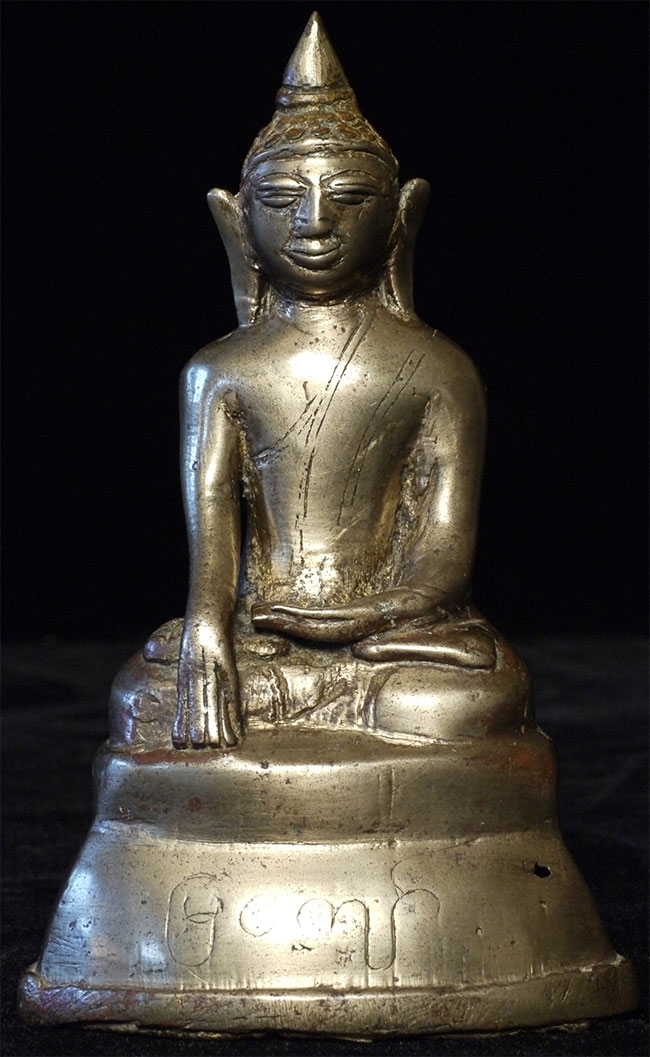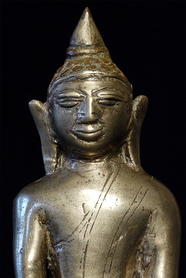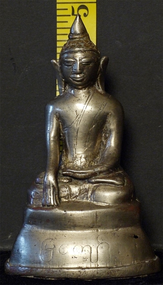 16/17thC Burmese silver bronze Mon style Buddha. Sits 4.75 inches tall.
