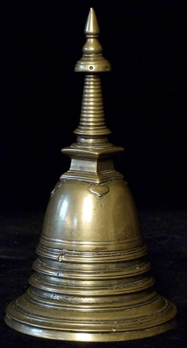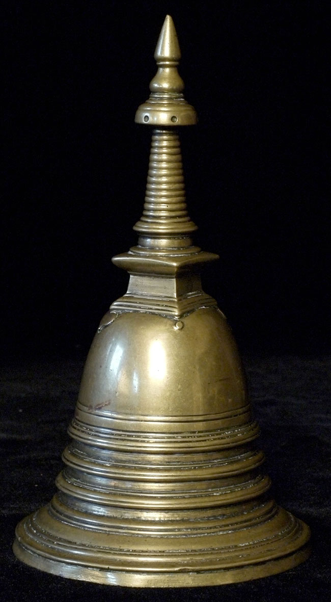 18thC Sri Lankan Stupa in bell form. Many of the Kandy era stupas were made in this form. High quality stupa, though does not sound much like a bell. 7 inches tall, diameter of 3.5 inches