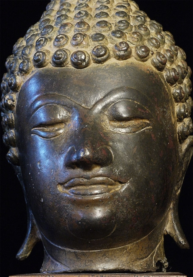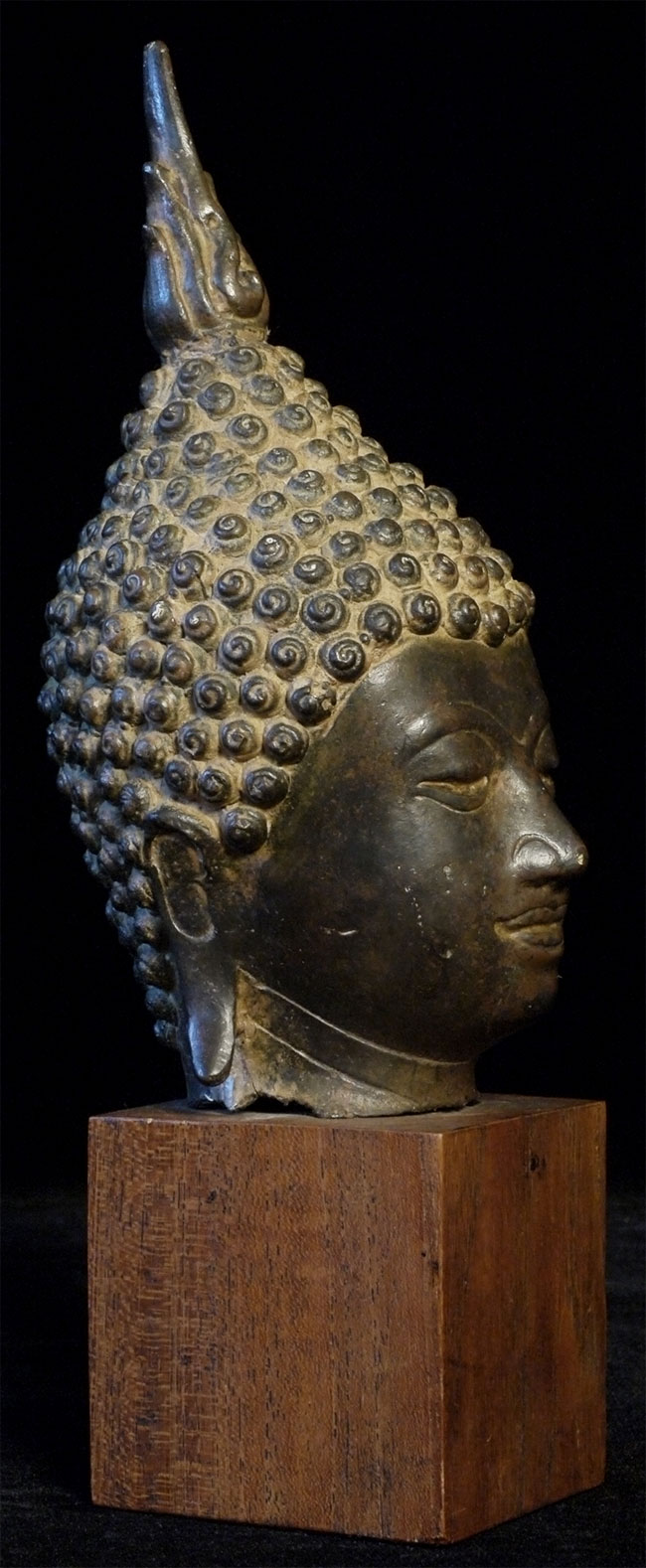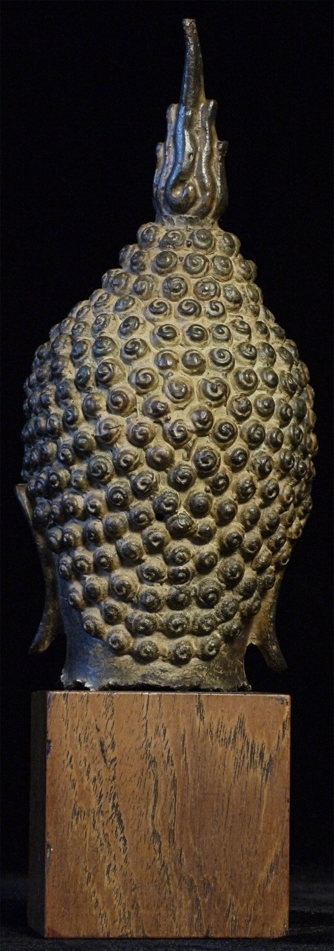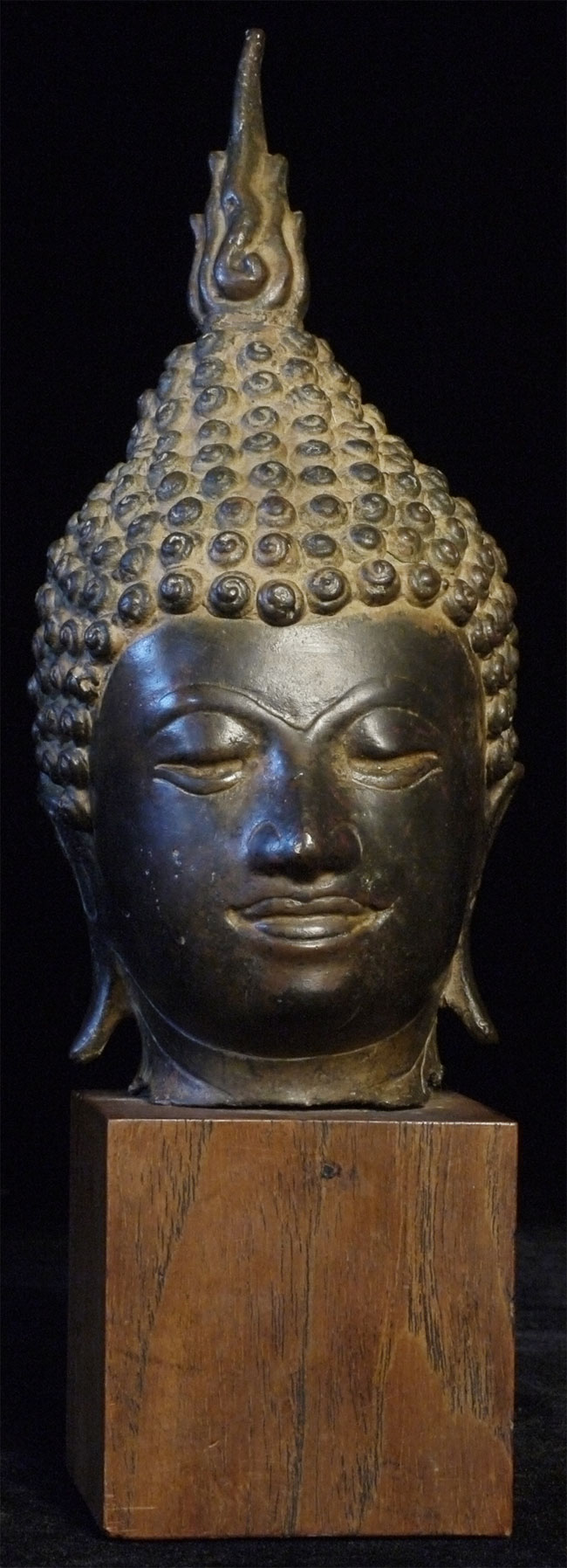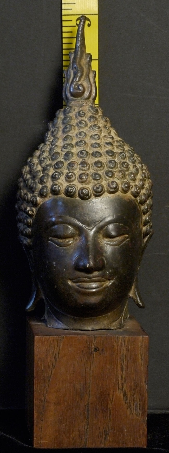 Authentic 17/18thC Bronze Buddha head on a wood base. Total height including the base is 9 inches(6.5 inches head only), and the attached base is 2-3/8 x 2-3/8 x 2.5 inches. There are traces of original gilding. Very beautiful.