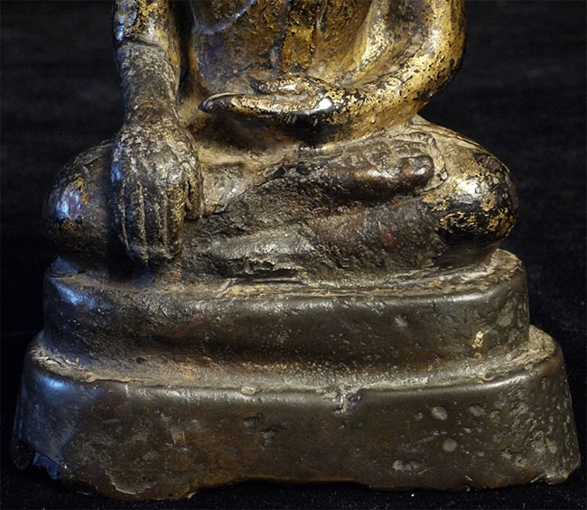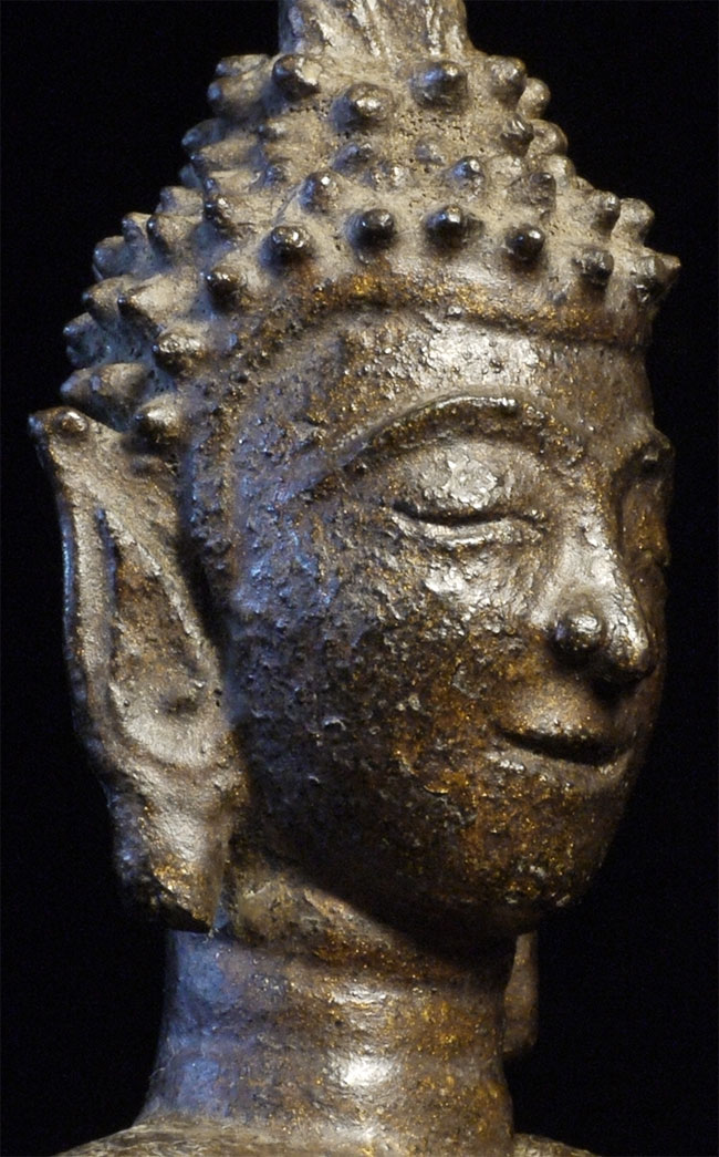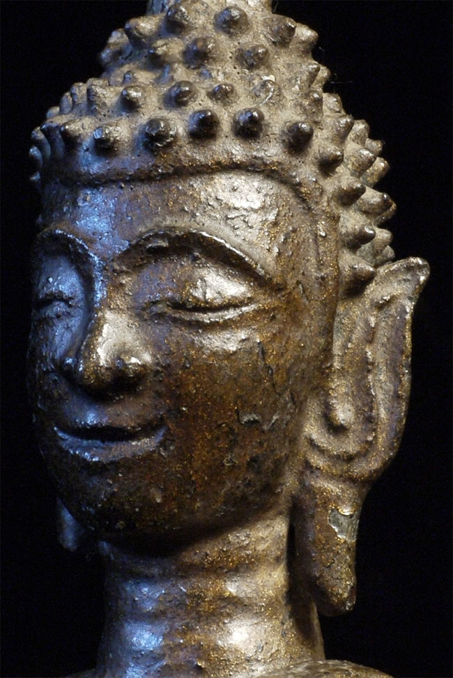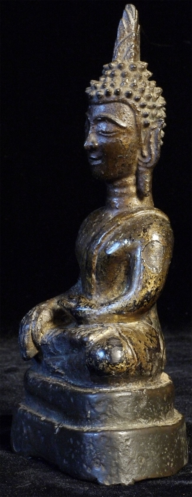 Lovely 16thC Lao Bronze Buddha. Serenely sweet face. Loss of a bit of one ear- missing. Otherwise, outstanding in every way. Sits 6 5/8 inches tall.