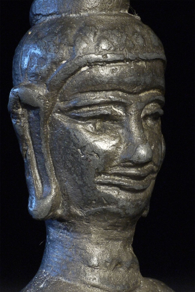 Distinctive antique lead/bronze Buddha. Unusual mix of elements, probably tribal Cambodia or Laos. This piece measures 4" tall.