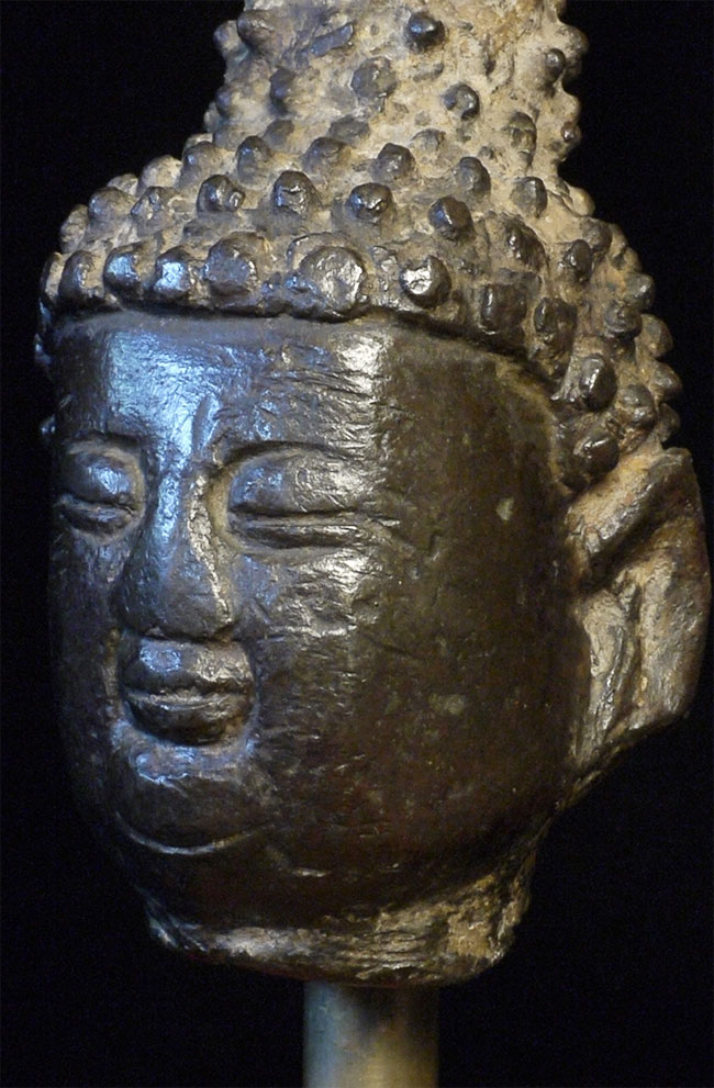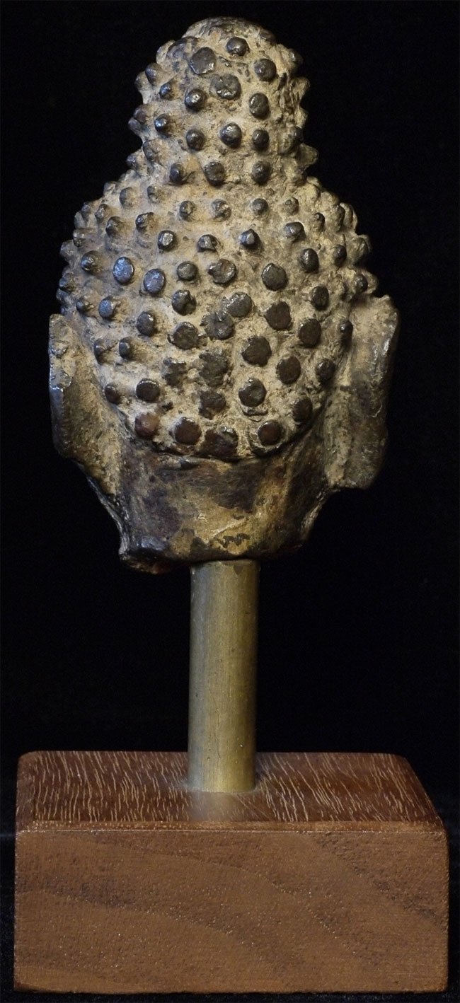 Ming bronze Buddha head. Stands 5 inches total height on attached base. Head by itself is approximately 3.5 inches.