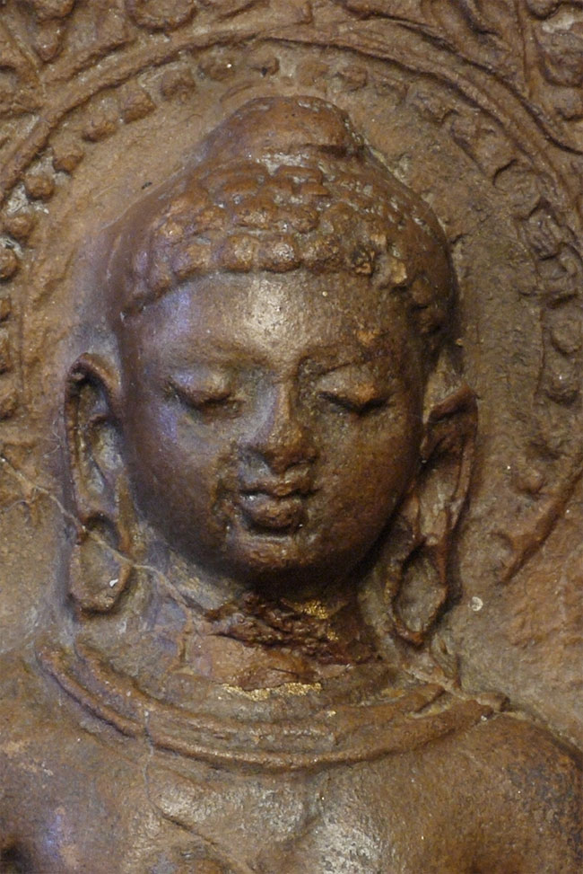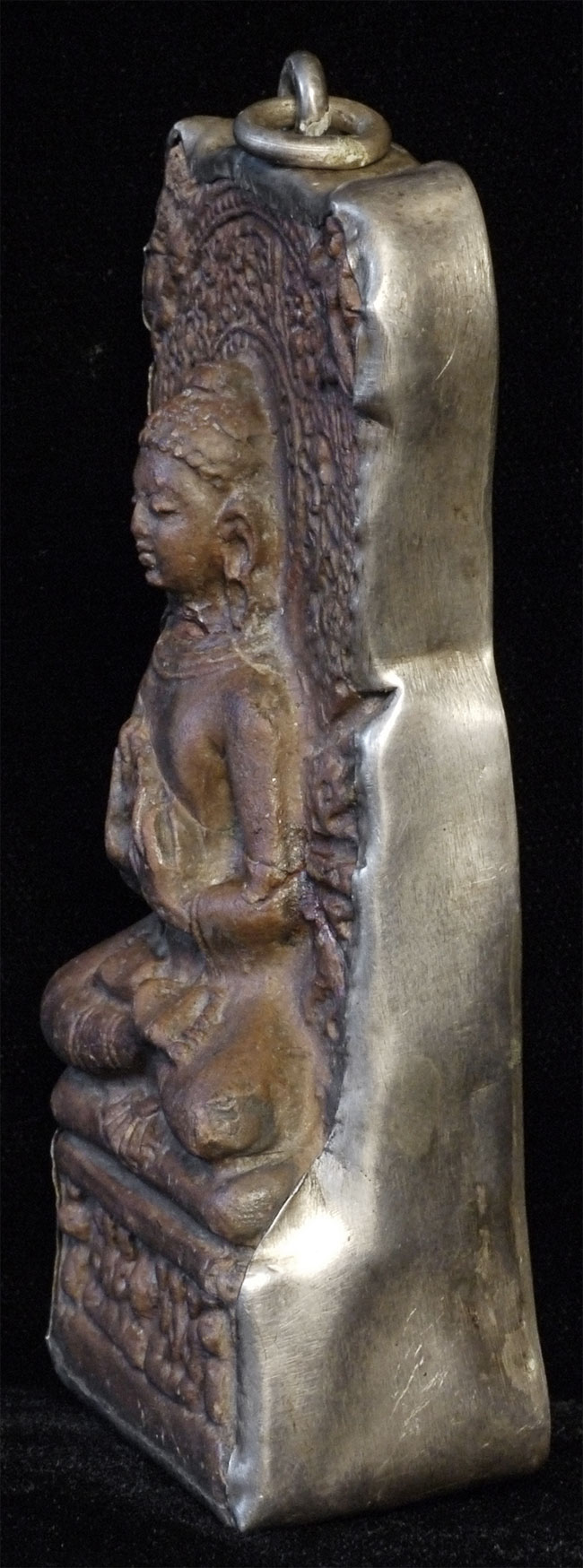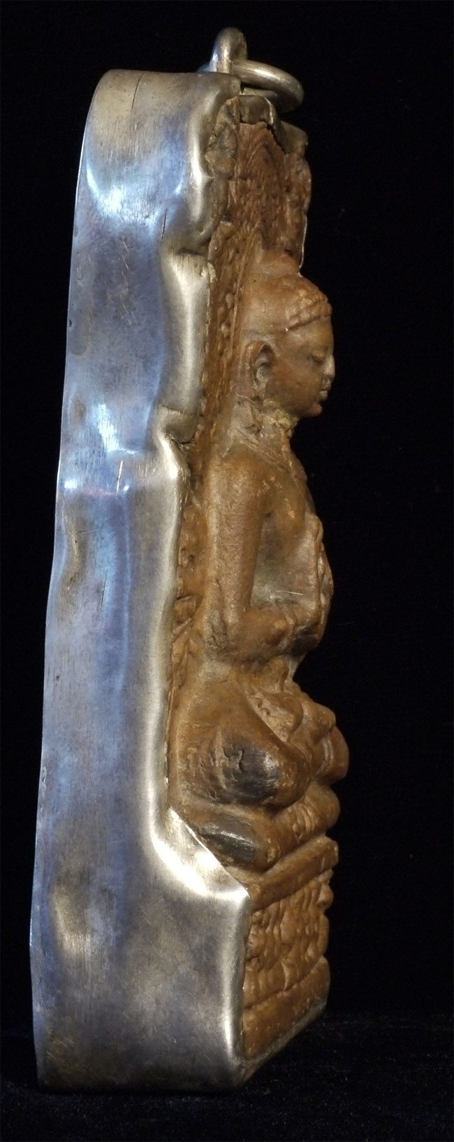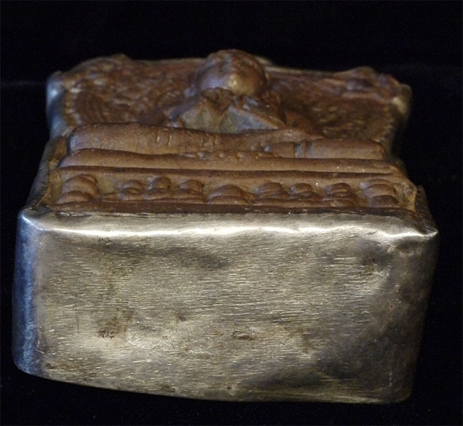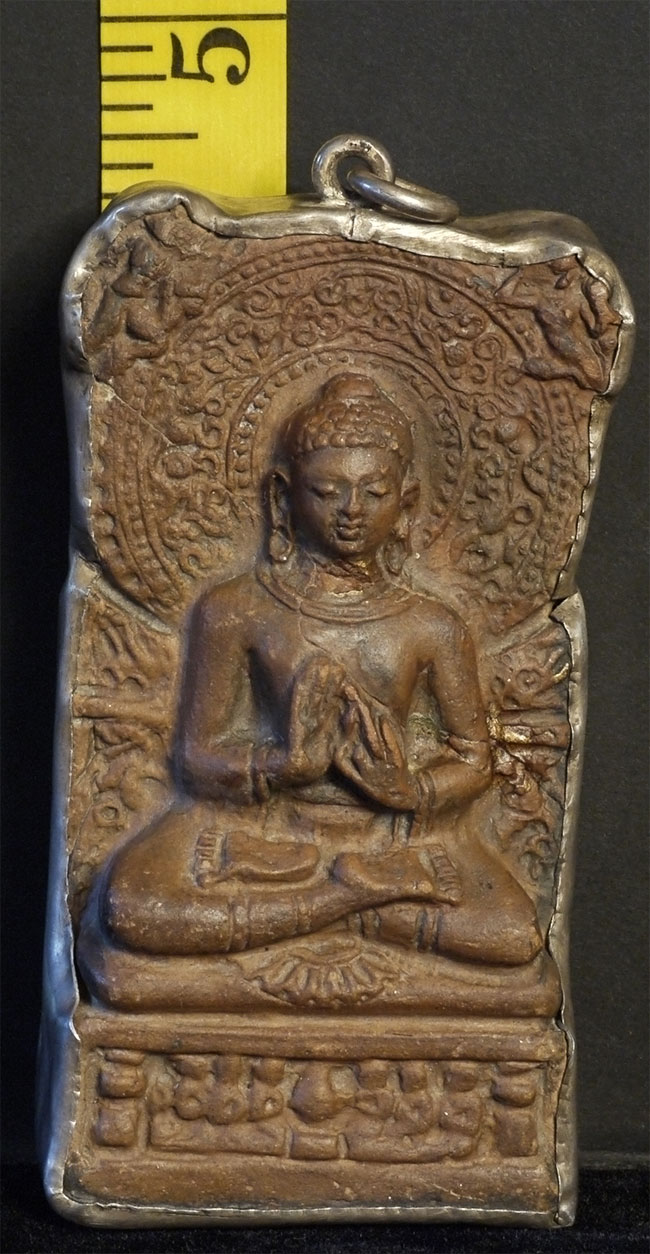 Clay Buddha from Saranath Has a crack running through it as seen in the photos. Encased in silver. Sits 4 and 3/8 inches tall, 2.25 inches wide, 1 inch deep