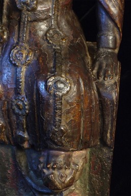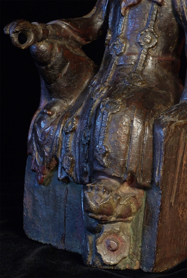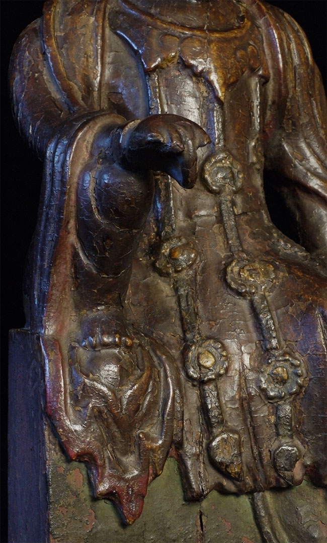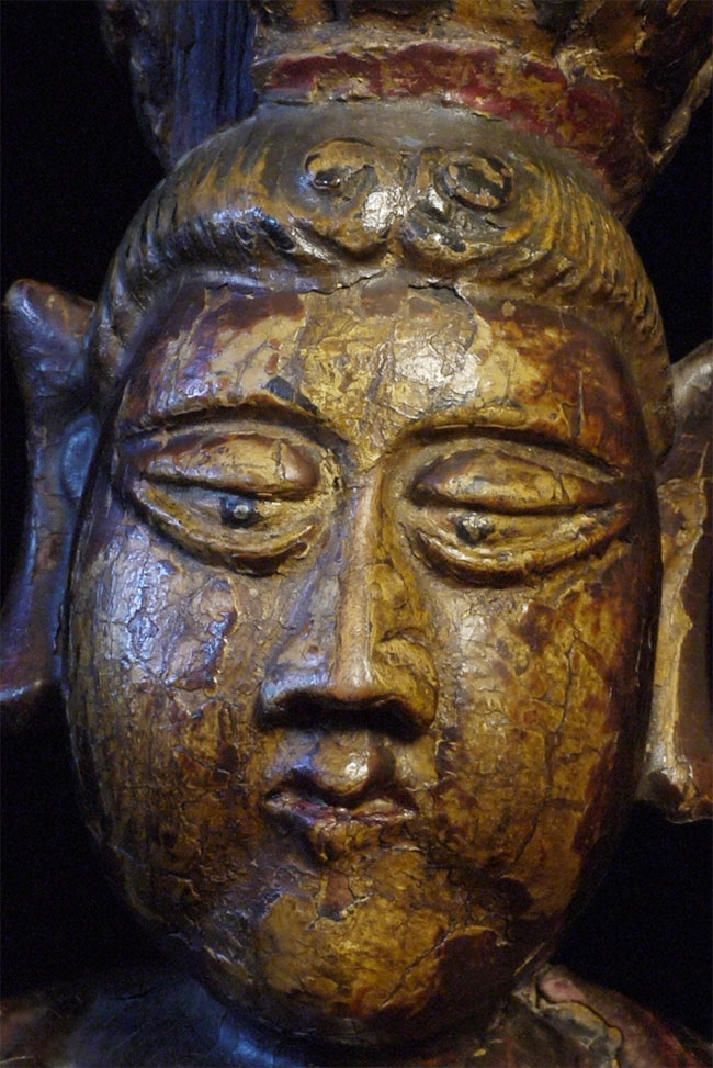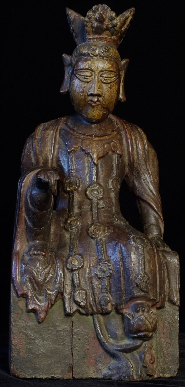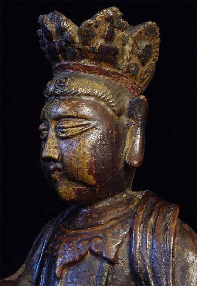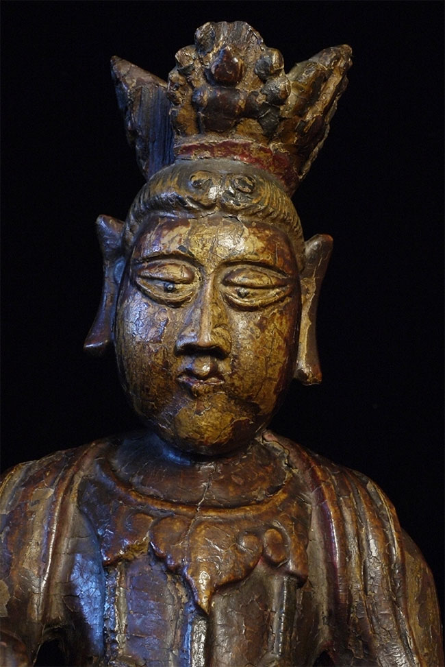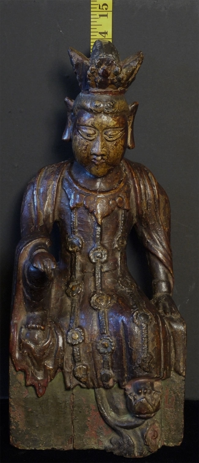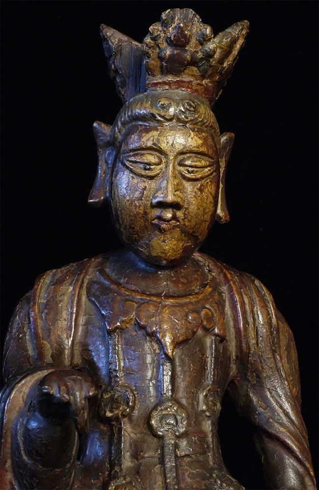 Delightful old Korean (or Chinese) Bodhisattva. Looks to be 18thC or earlier. Stands 14 inches tall, 6.5 wide x 5 inches deep. Loss to crown and fingers as seen in the photos. Very distinctive face.