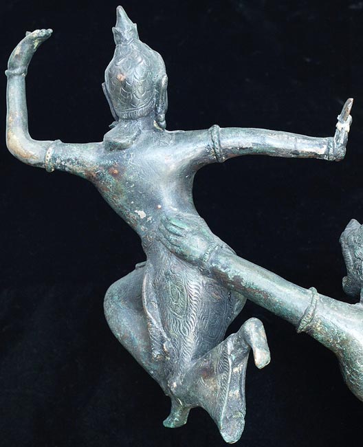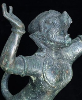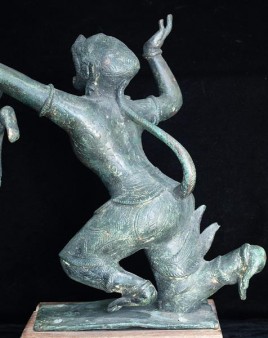 This is an uncommon large, heavy cast antique Thai sculpture of Hanuman or another Monkey King of Monkey Figure with an Apsara or other figure from the Ramakien, which is the Thai version of the Ramayana story, which was adapted from India long ago. Occasionally I have seen hollow cast pieces of this type, but in a large estate collection I recently purchased, there were this and another large strongly cast pieces of a type which are quite unique. I believe they are 75 to 100 years old, although I truly have no way to date these pieces- they were collected 35 years ago, and they showed very good age at that time. The metal base (which is attached to the wood base) has an old loss which was there when it was mounted to the wood 35 years ago. The patina has some rubbing and loss where the underlying metal underneath shows through, and it looks like the original surface is quite beautiful . Normally I do not advocate polishing Buddhas, but for some reason, I have been very tempted to clean this piece down to the metal . I'll leave it for the next owner to decide. It stands approx 13 inches high by 13 inches wide not including the base. The base brings it to closer to 15 inches tall. as the 2 look NOTE: there are several old repairs and minor dings