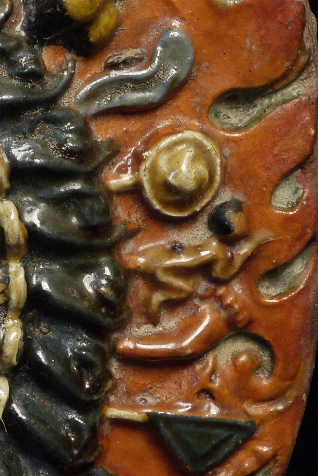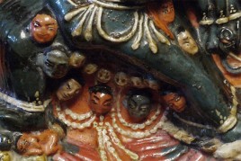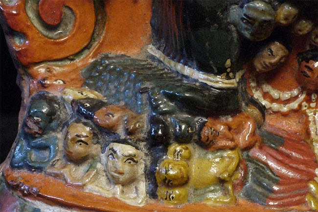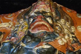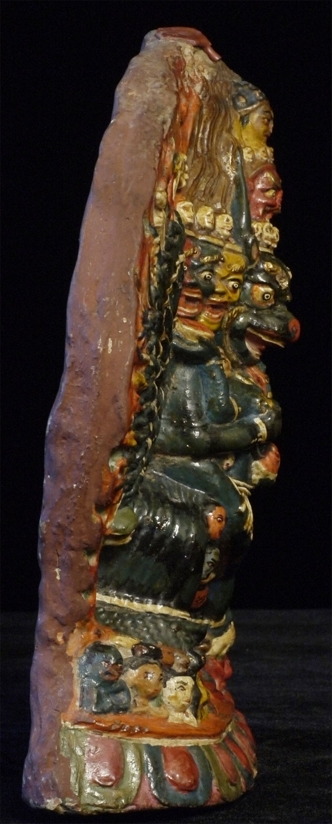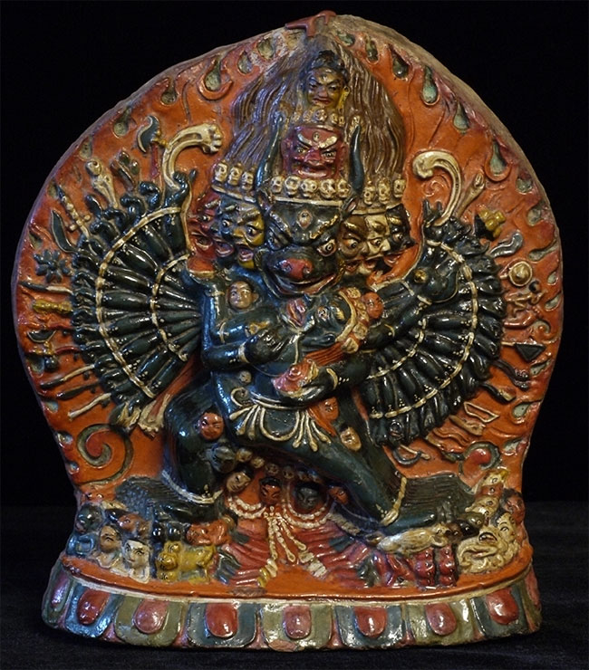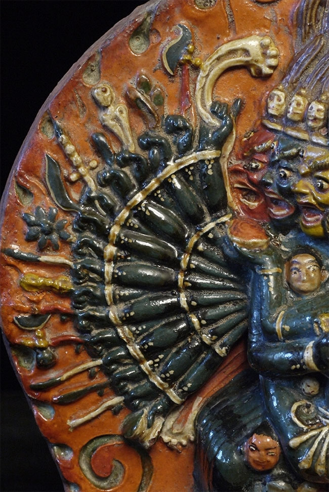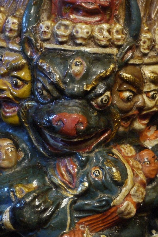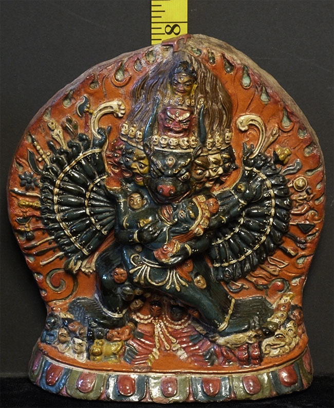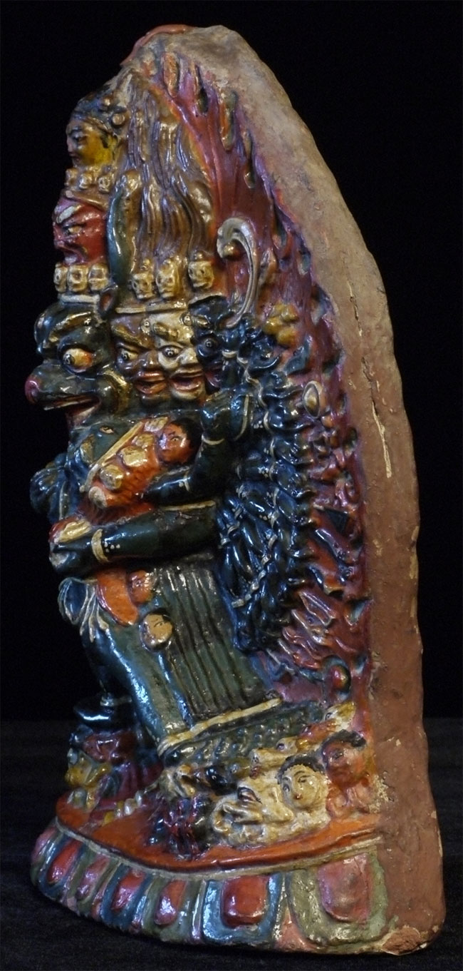 Old Tibetan Fierce Deity in clay. High quality example- great detail -vivid and intense. Large for its type at 7.75 inches tall, 6.25 inches wide.