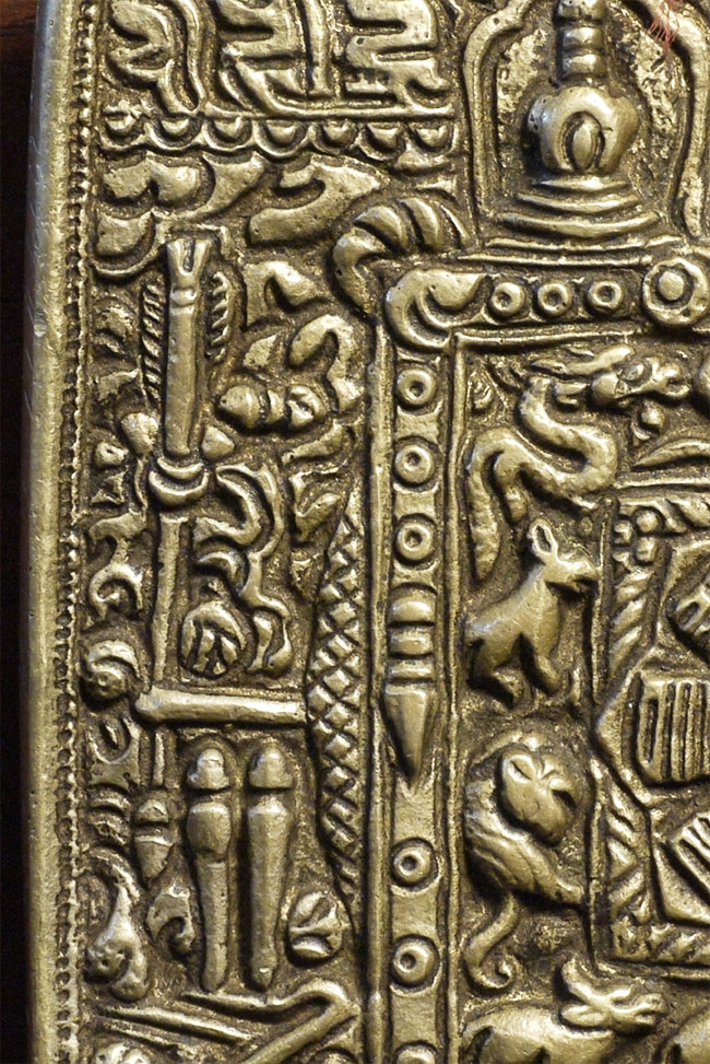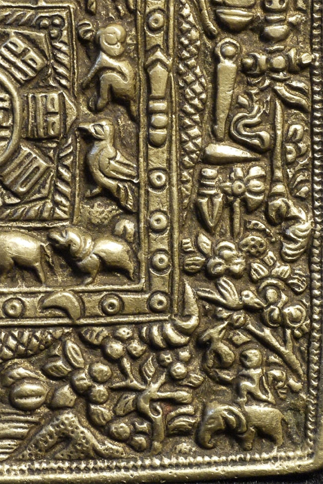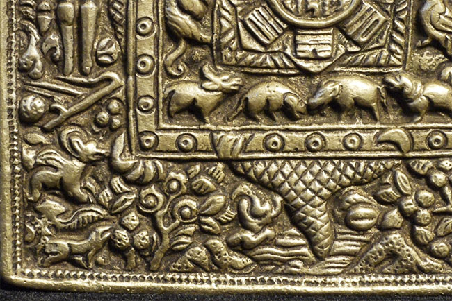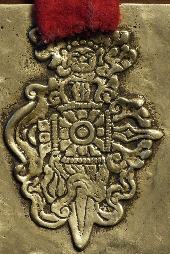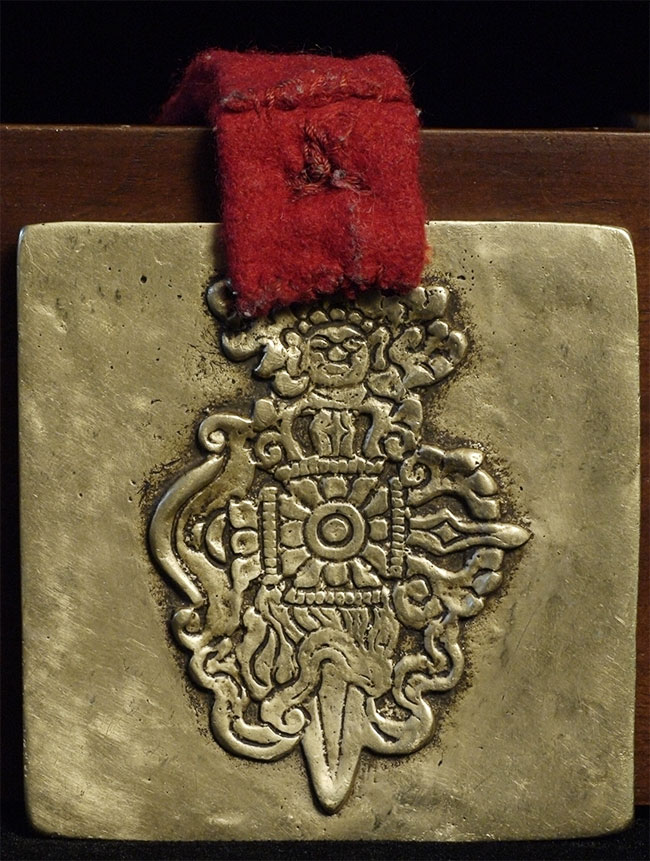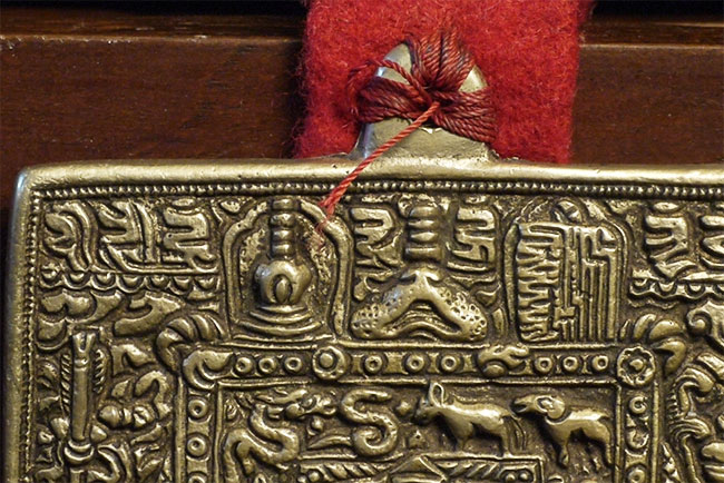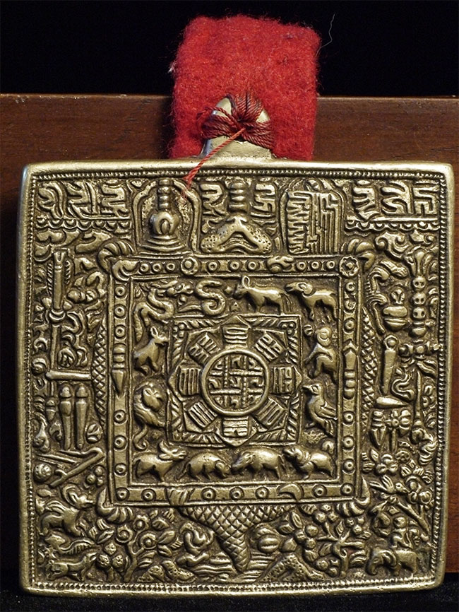 Nepalese brass/bronze talismanic piece. Size is 3.5 inches x 3 3/8 inches.