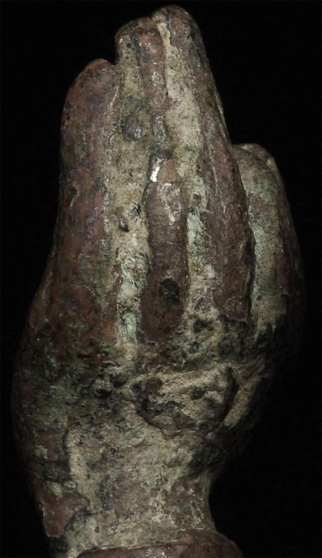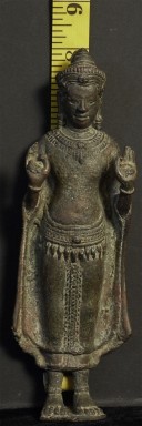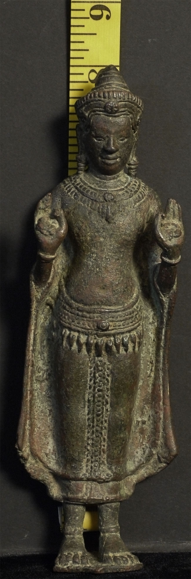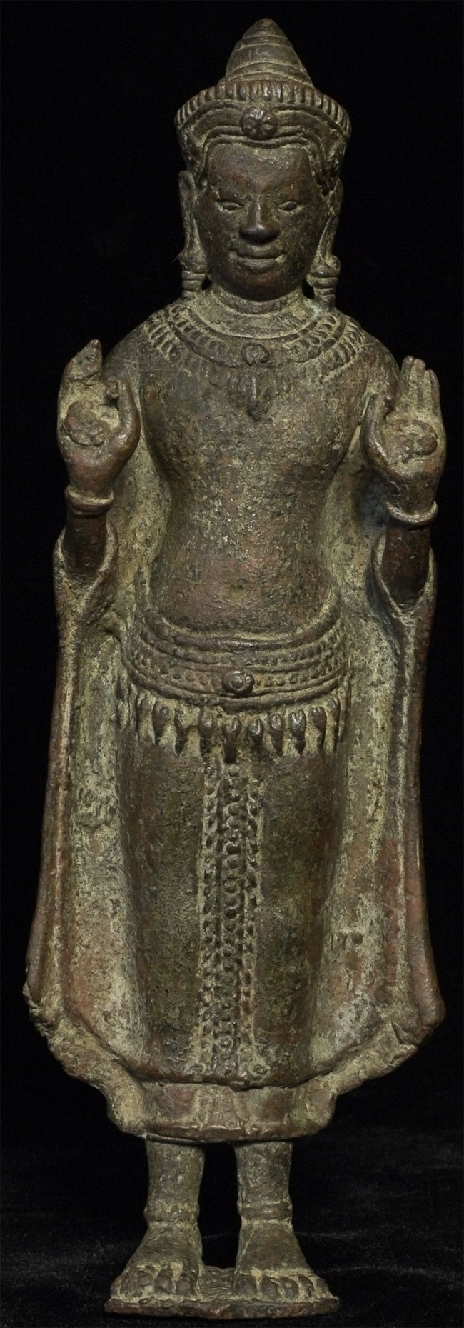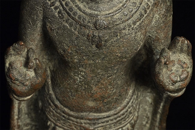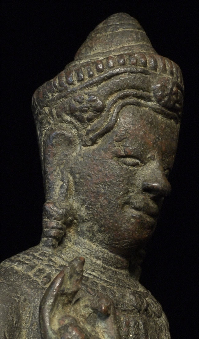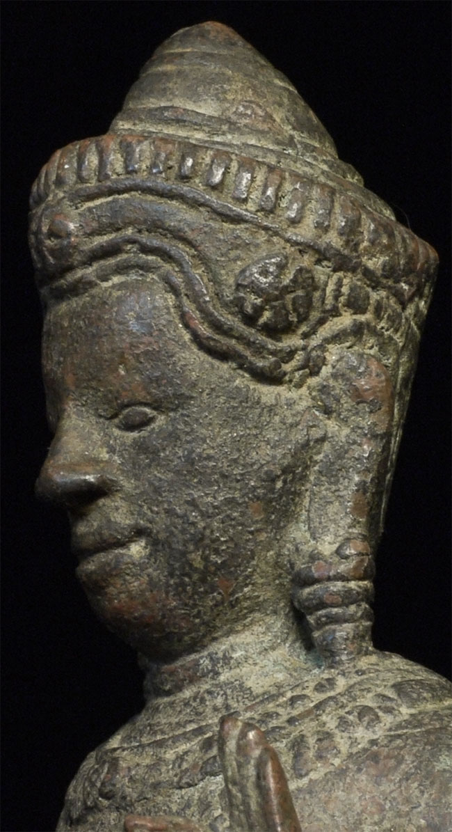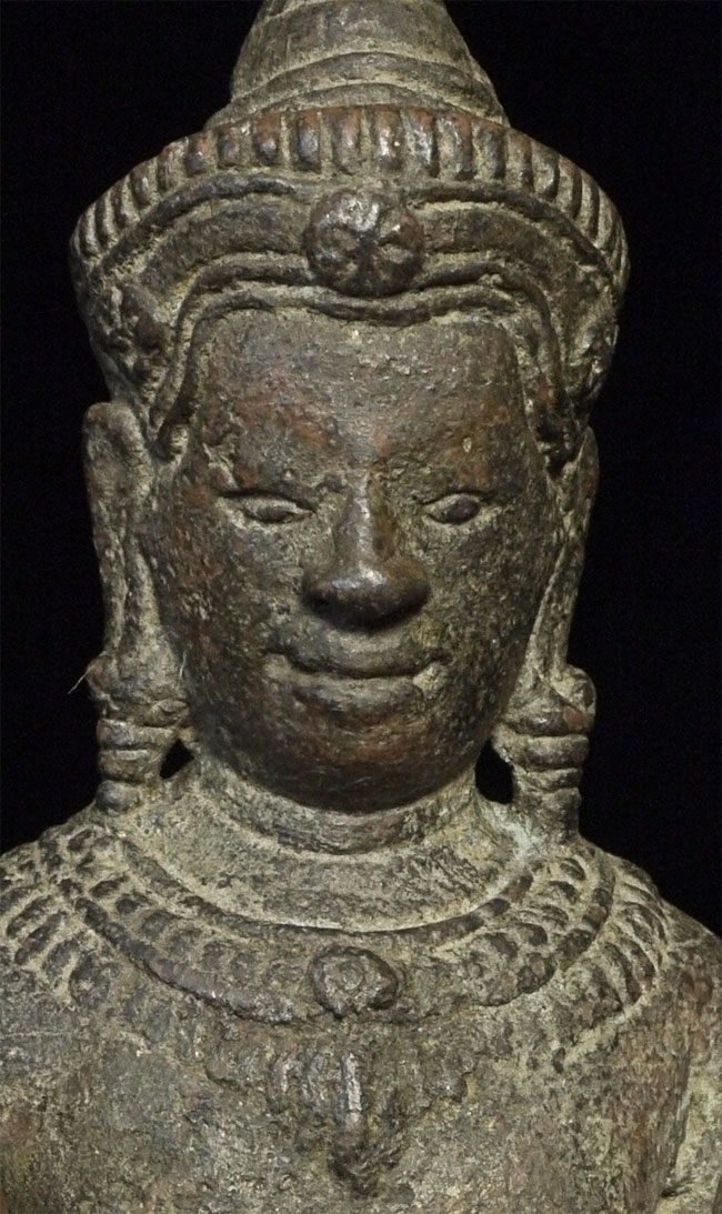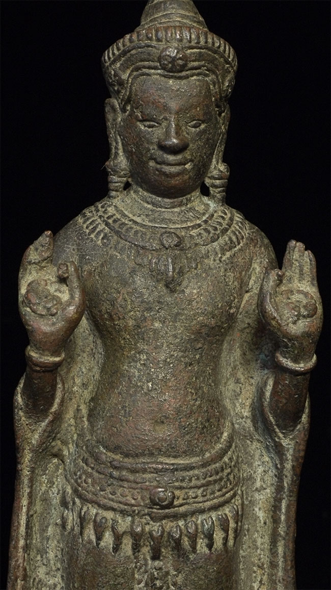 Exceptional 12/13thC Cambodian Buddha. Traces of original gilding remain. Outstanding condition. Stands a full 8 inches tall without any base. A personal favorite.