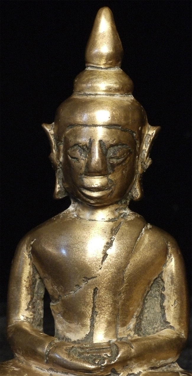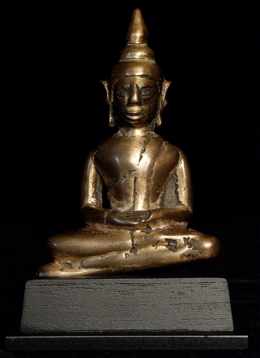 Very unusual solid-cast antique Laos Buddha cast out of a very distinctive alloy. The previous owner believed that it had gold or other precious metal in it. I have no idea what is in it- all I know is that I've owned it 20+ years and have never cleaned it, and it has always had this very distinctive golden glow. I've never come across another. Sits 4 3/8 inches tall and quite heavy for its size. Height on custom base is 5 1/8 inches.