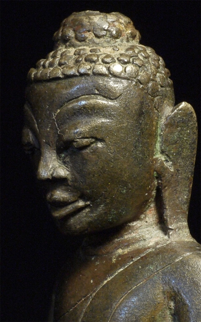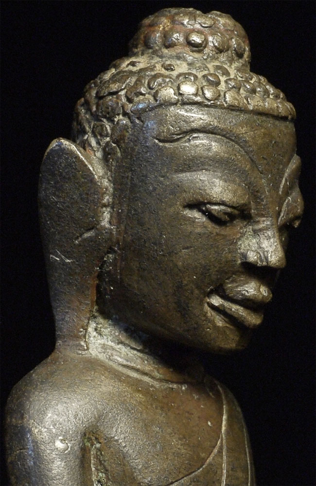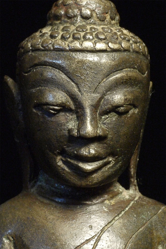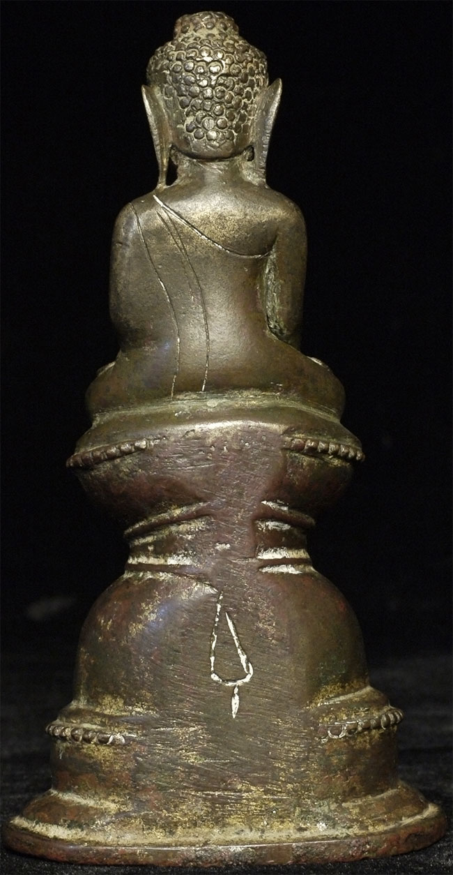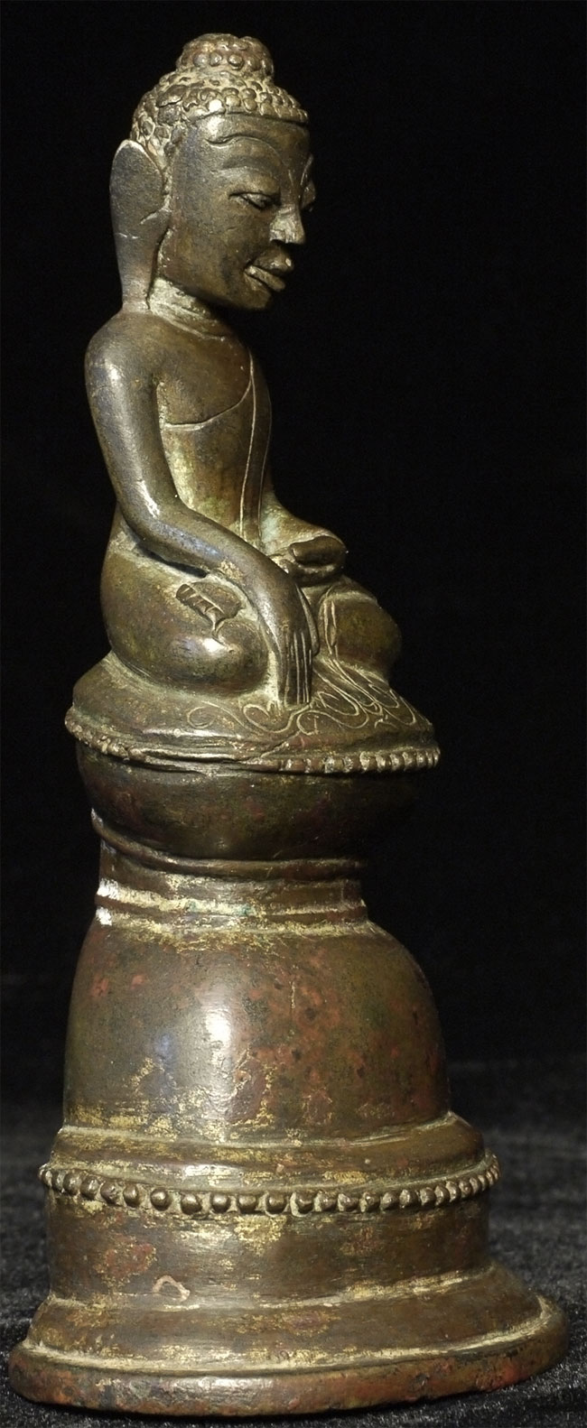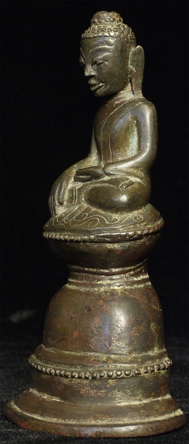 High quality 18thC Burmese Buddha. Rare to find one this nice in this diminutive size. Sits 4 5/8 inches tall.