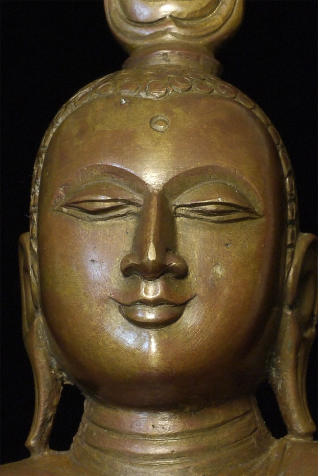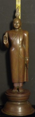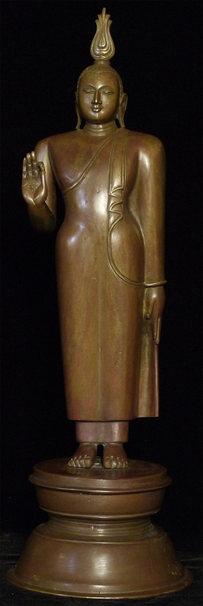 Antique Sri Lankan Standing Bronze Buddha. Very large at 18 inches tall, and quite heavy as body is solid-cast. Beautifully sculpted, cast, and finished- look at the detail in the fleshy fingers. From a Swedish collection-collected in the early 20th century.