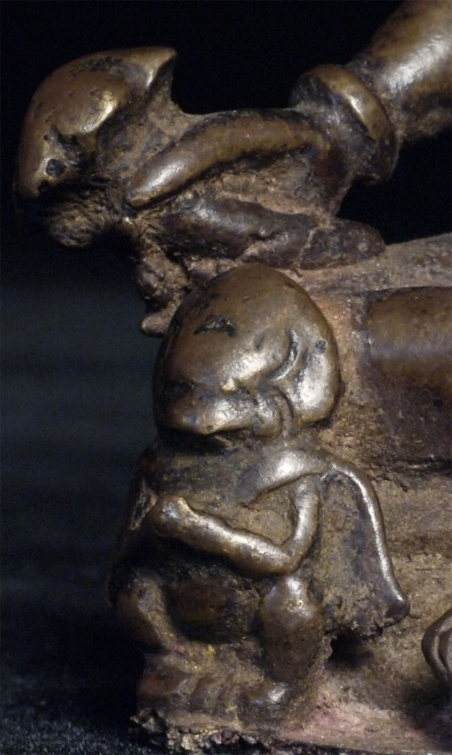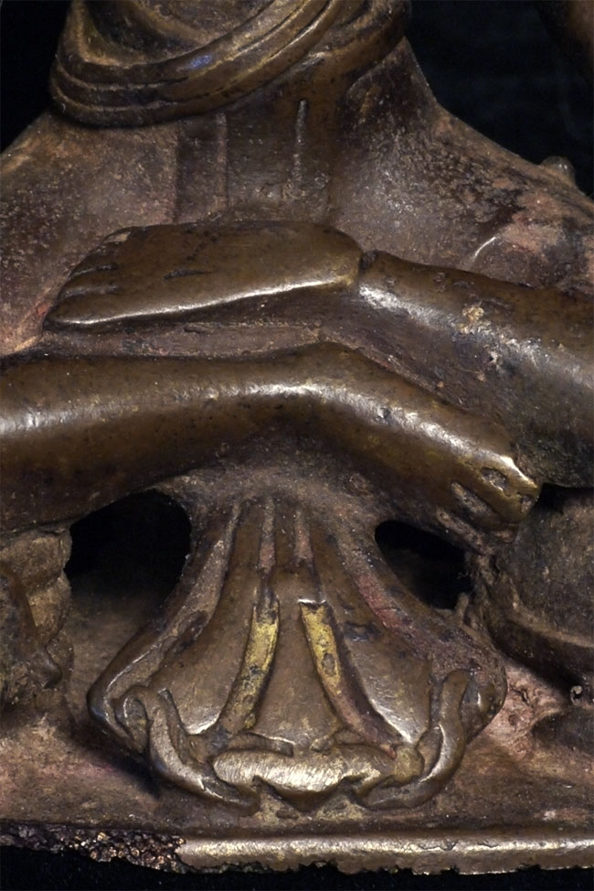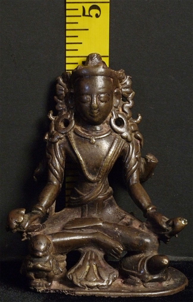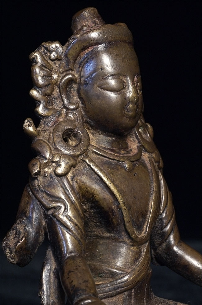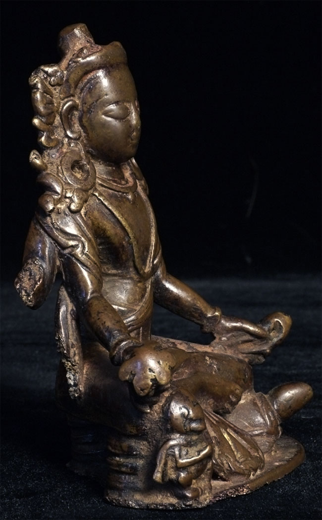 Early Himalayan or Northern Indian bronze deity atop Garuda and turtle. This piece has an exceptionally joy-filled face and overall powerful presentation. Some minor loss and wear from centuries of wear, but overall good condition. Looks to have originally had a separately cast base. Sits four inches tall. Unsure how to date, but looks to have very good age.