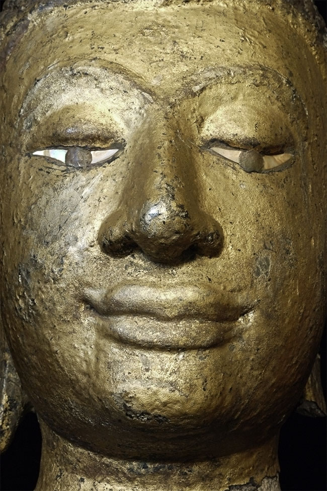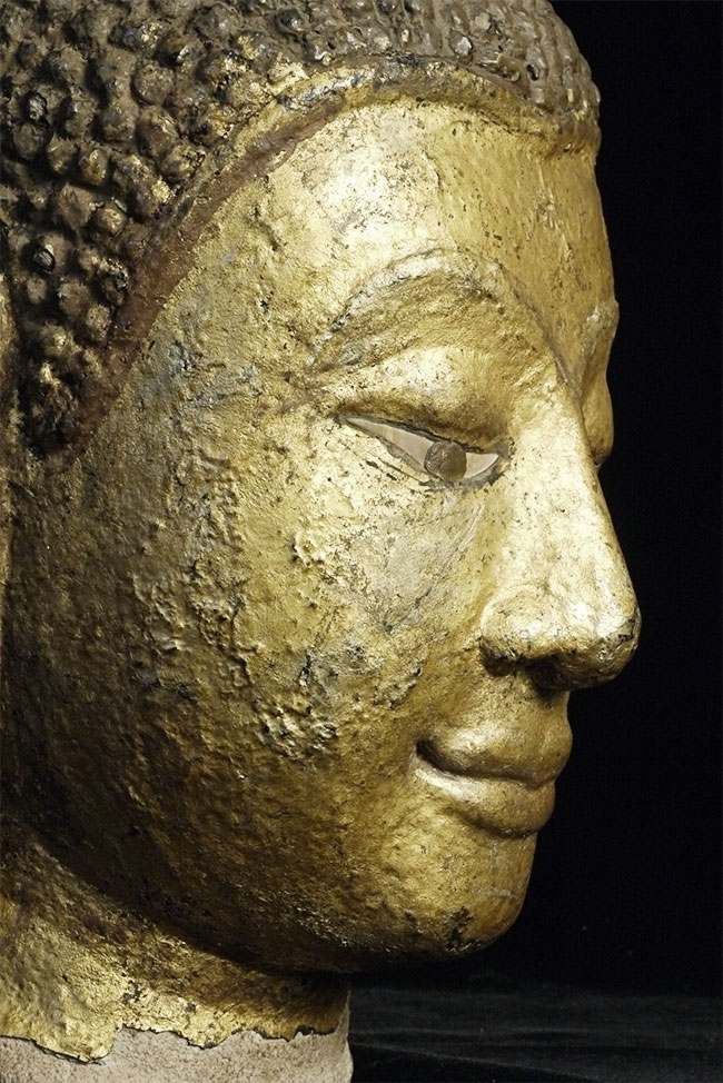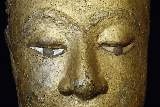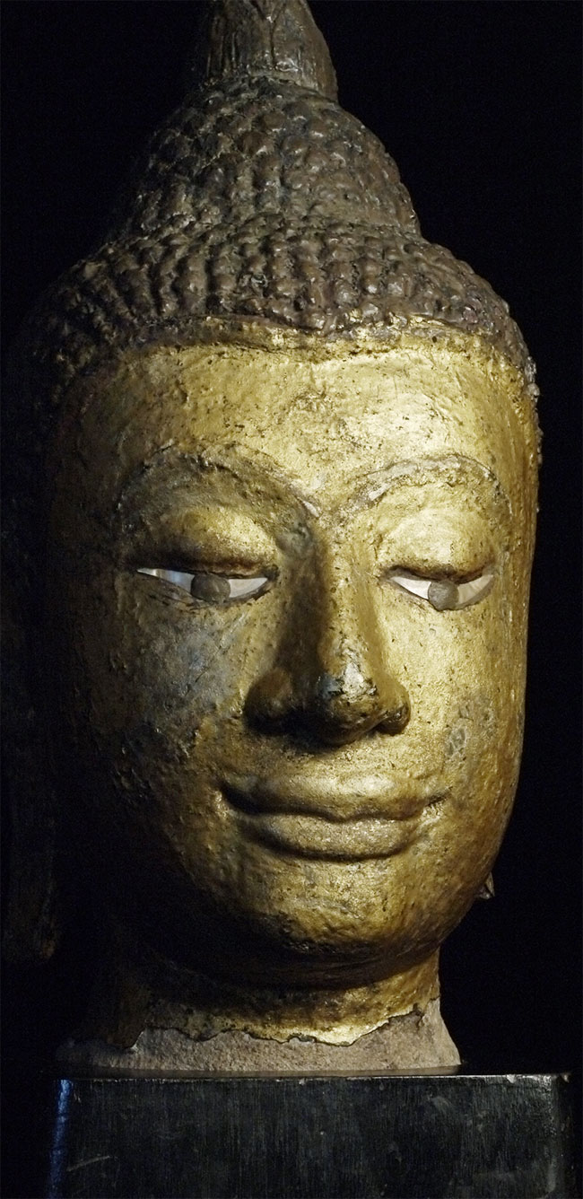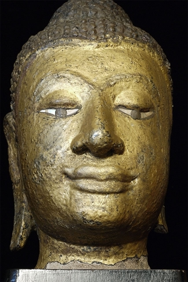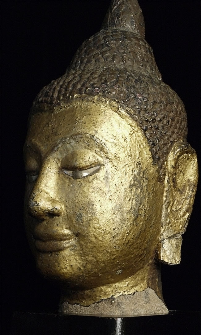 The head retains an exquisite facial expression: calm, kind, and majestic, with a faint smile and gracefully arched brows. The ushnisha rises high with tightly modeled curls. Losses and repairs to the ears are visible, and the lacquer and gilding show centuries of maintenance and touchups; it is possible the surface was fully re-gilded long ago, though not recently. The eyes, at first believed to be modern replacements, display old pitting and may be early restorations or reclaimed originals.