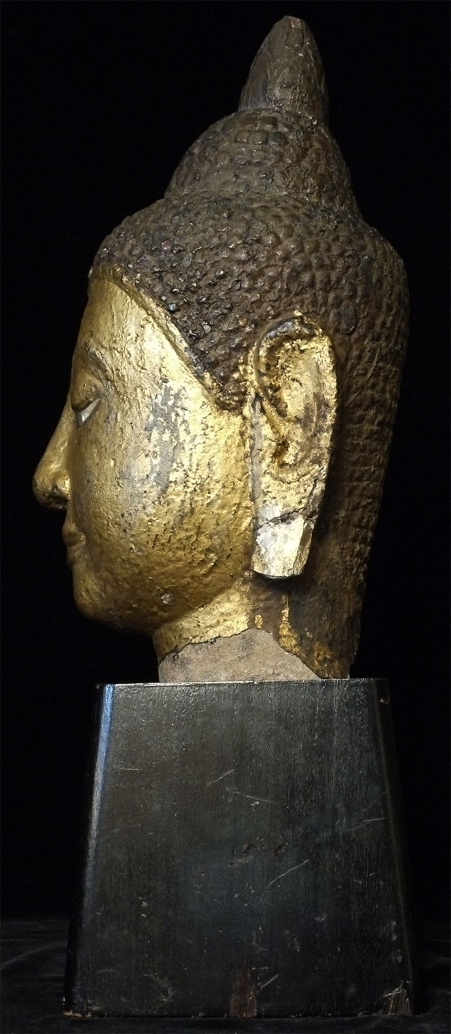 A powerful and near life-monumental Thai Buddha head, dating to the 15th century and carved in sandstone before being lacquered and gilded. Measuring over 16 inches tall for the head alone—and 21 1/4 inches in total height including its mid-20th-century teak base—this imposing sculpture conveys the serene authority of a Buddha meant to be viewed from below, towering above devotees in its original temple setting.