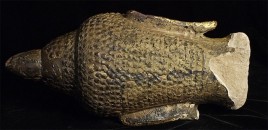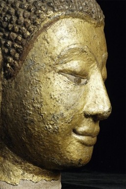 Monumental 15th Century Thai Lacquered and Gilded Sandstone Buddha Head, Over 16 Inches